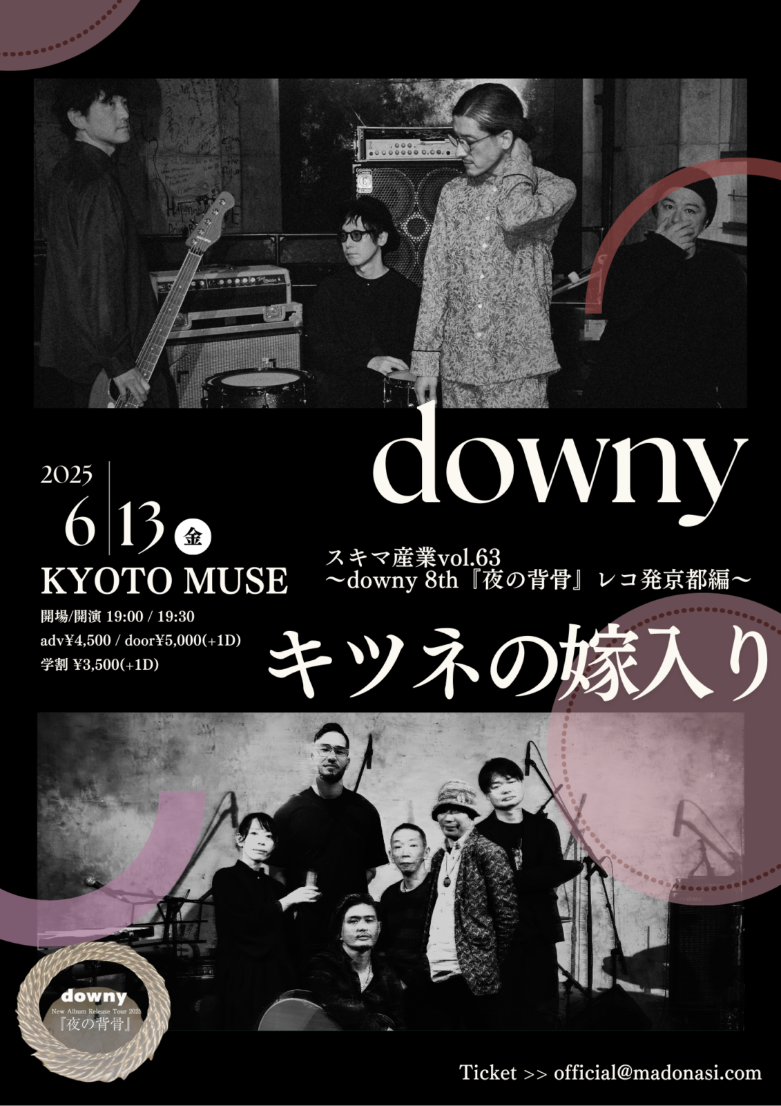 京都を中心に活動する、アコースティック・オルタナ・プログレバンド「キツネの嫁入り」が長年続けてきた自主イベント『スキマ産業』。63回目となる今回は、6月13日(金)に〈KYOTO MUSE〉にて結成25周年というメモリアルイヤーを迎えたdownyとのツーマンで行われる。