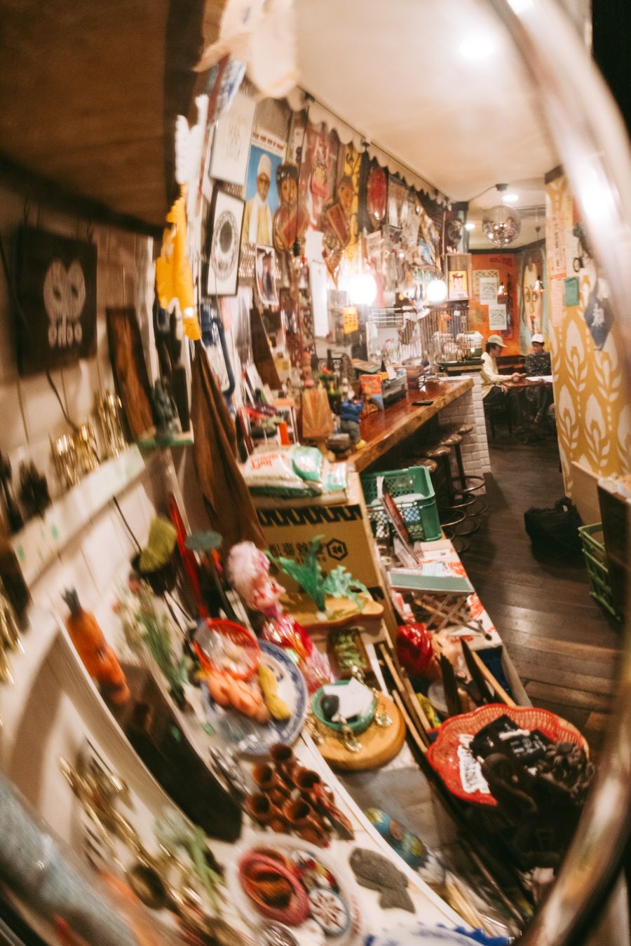 麻衣子さんの話に耳を傾けつつ店内を見渡すと、入り口のカウンターを埋め尽くすかのように各地の土産物や雑貨、イベントフライヤーやレコードが目に入る。これらは全てお客さんとの会話が生まれるきっかけであり、料理のインスピレーションになった土地の風土や体験が詰まった記録でもある。