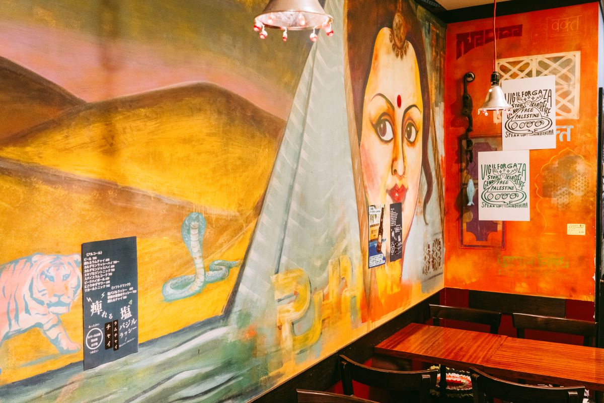 筆者の場合、いつも覚えているのは細かい装飾が施された金属製のお冷の椀。特に、夏場に行くとその冷たい感触がゴテゴテした凹凸とともに掌に残る。よく考えたら、あれはインドカレーのミールスで使うカトゥリと同じサイズ感だったような……。それに加えて、眼前を覆いつくすサイケデリックな壁画が脳裏に焼き付いている。