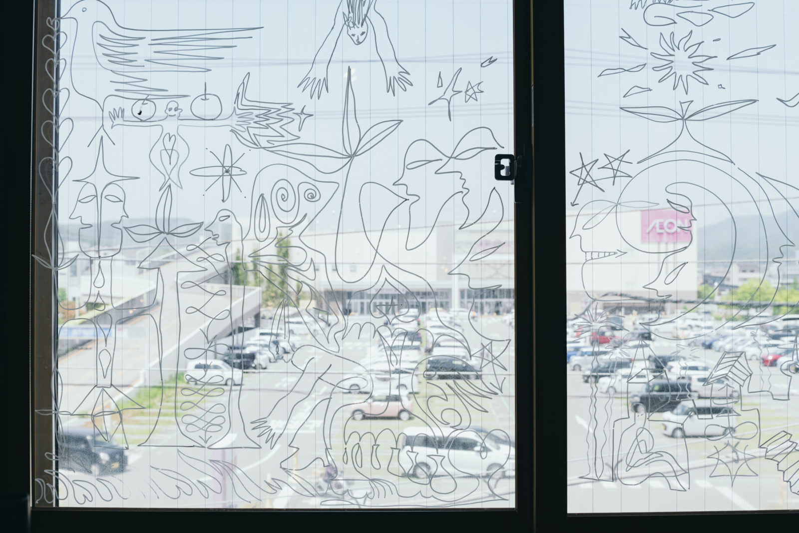 カバー写真:壁のドローイングはNAZE & KENJI SAKAI、手前布のドローイングはCOOLによる