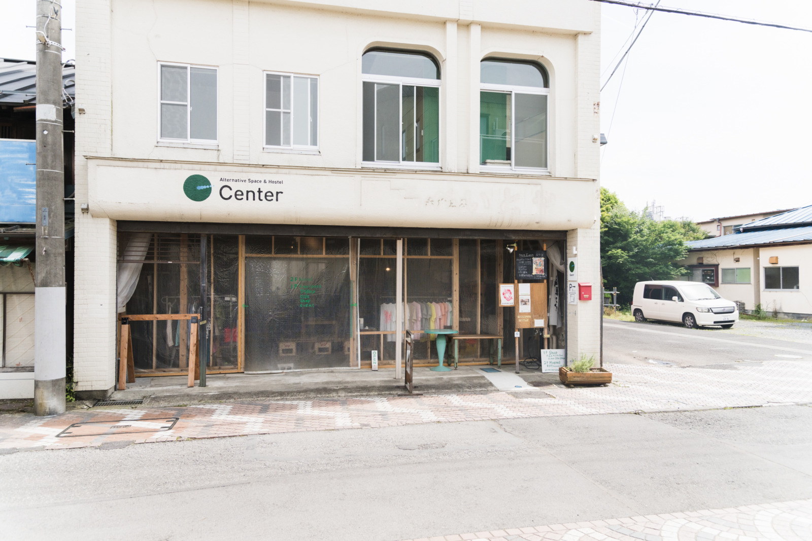 浅草駅から日光行きの特急列車に乗って約1時間20分。新鹿沼駅で降車し、徒歩約15分。いかにも旧市街を思わせる「銀座」と呼ばれる通りに入って少し進むと、〈Center〉がある。1階が多目的スペース、2階が宿泊フロアだ。