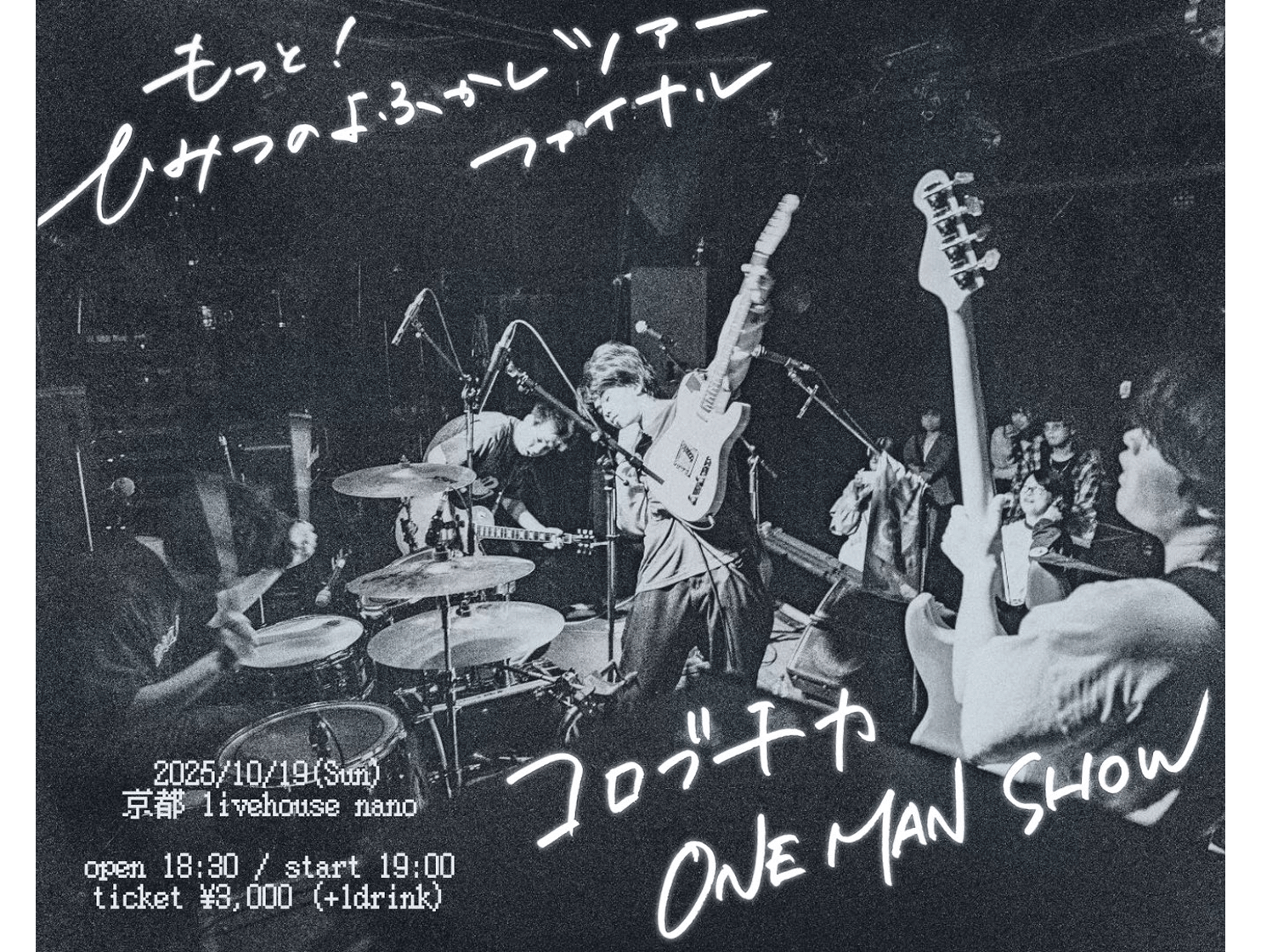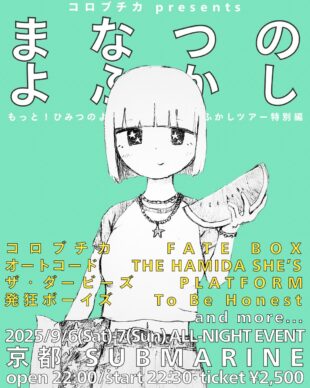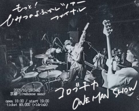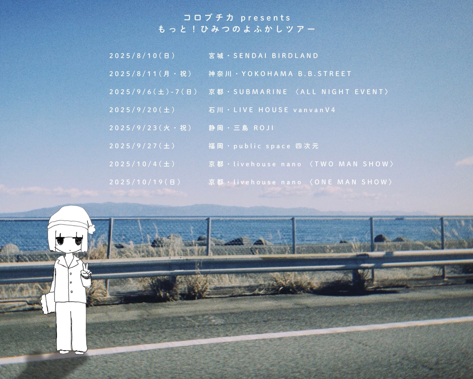 京都のバンド、コロブチカによる『もっと!ひみつのよふかしツアー』が、2025年8月6日(水)から始まる。大阪編〈心斎橋Pangea〉を皮切りに、仙台や福岡など初めての土地でのライブを含めた全10公演を回っていく。