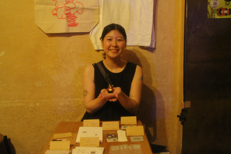 このイベントに足を運ぶと、むらかみの精神的裏庭に特別招待された心地になる。ドリンクだけではなくフードも充実したお店を会場にしており、しっかりご飯も食べられる。また入口では毎月発行しているお手製の紙メディア『道草通信』が配布され、開演までは彼女の言葉で綴られた近況やおすすめの作品や本の紹介に触れて過ごす。物販にはCDだけでなく、UNRWA(国連パレスチナ難民救済事業機関)に売り上げが寄付されるオリジナル「FREE PALESTINE」缶バッチも販売されていたり、持参した本も10冊以上置かれ、演奏中でも自由に読みふけっていい。直近の開催で並んでいたのは『思いがけず利他』(中島岳志 著)、『ネガティブ・ケイパビリティ 答えの出ない事態に耐える力』(帚木蓬生 著)といった自分の意思や思考に補助線を引くような本や、『中学生から知りたいパレスチナのこと』(岡真理、小山哲、藤原辰史 著)、『パレスチナ、イスラエル、そして日本のわたしたちー〈民族浄化〉の原因はどこにあるのか』(早尾貴紀 著)といった現在進行形の世界情勢を伝える本、永瀬清子の詩集や伊藤紺の歌集『気がする朝』など。まるで今のむらかみの頭の中を覗きみるようなラインナップである。一たび開くと大量の付箋と下線が引かれていて、あとで本人に聞くと「これやらないと頭に入っていかないんです」とのこと。まるで彼女がビビッと来た部分ごとその本を味わっている心地になった。