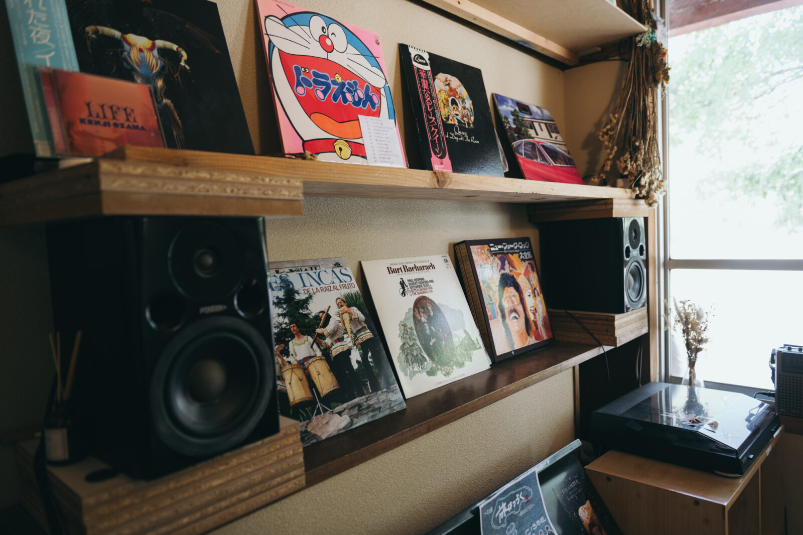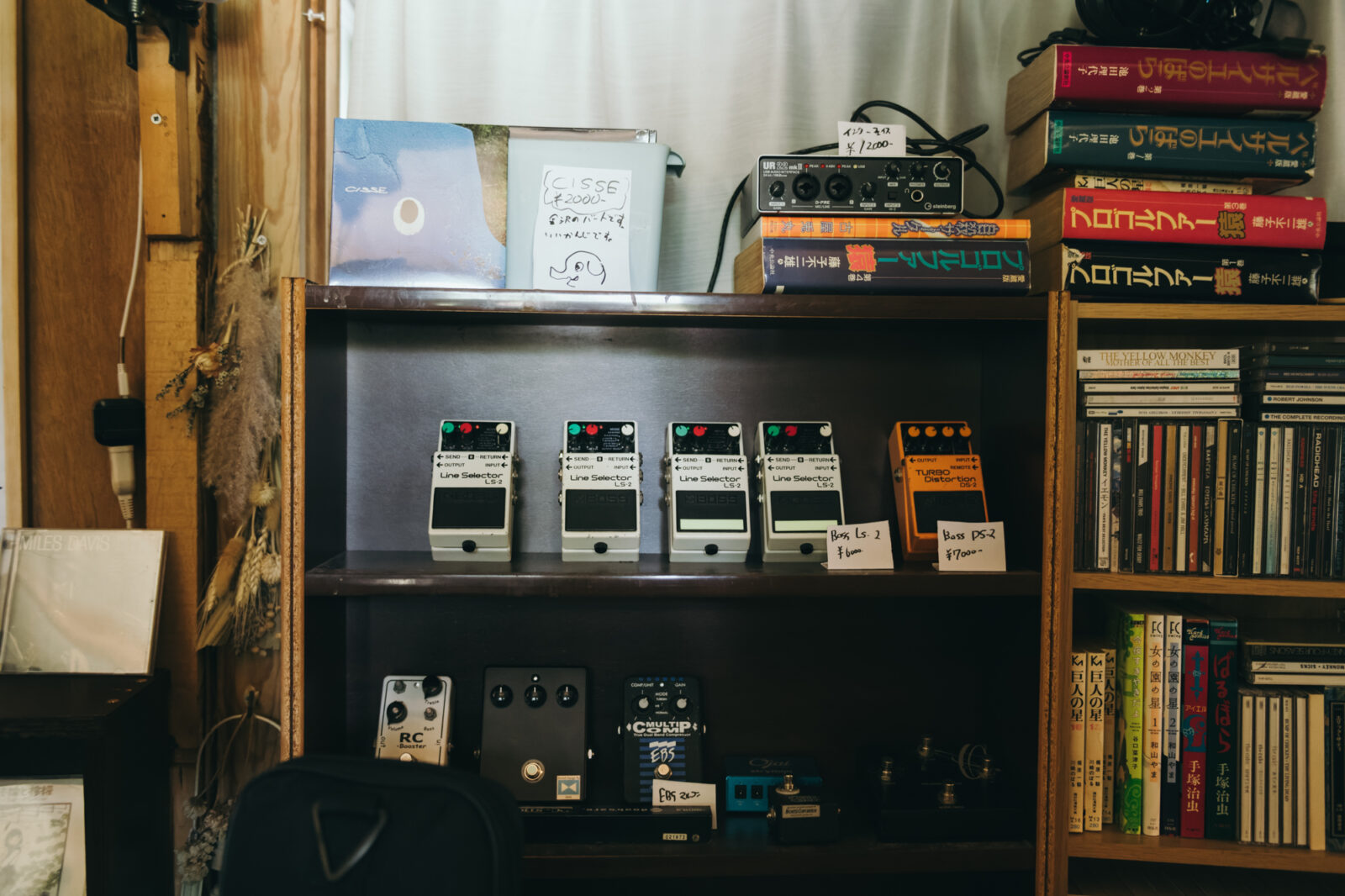 崎山を発起人に2025年の春にオープンした〈石引サードプレイス〉。8畳ほどのアパートの一室には、レコードや古本、エフェクターや楽器が置かれ、雑貨や駄菓子が気軽に買えるコーナーもある。久保が「わざと曖昧にしている」と語るその空間は、コロナ禍でバーとして営業していた〈vanvanV4〉にも通じる、音楽という共通項があってもなくても誰かの居場所になる、そんな秘密基地のような場所だった。
