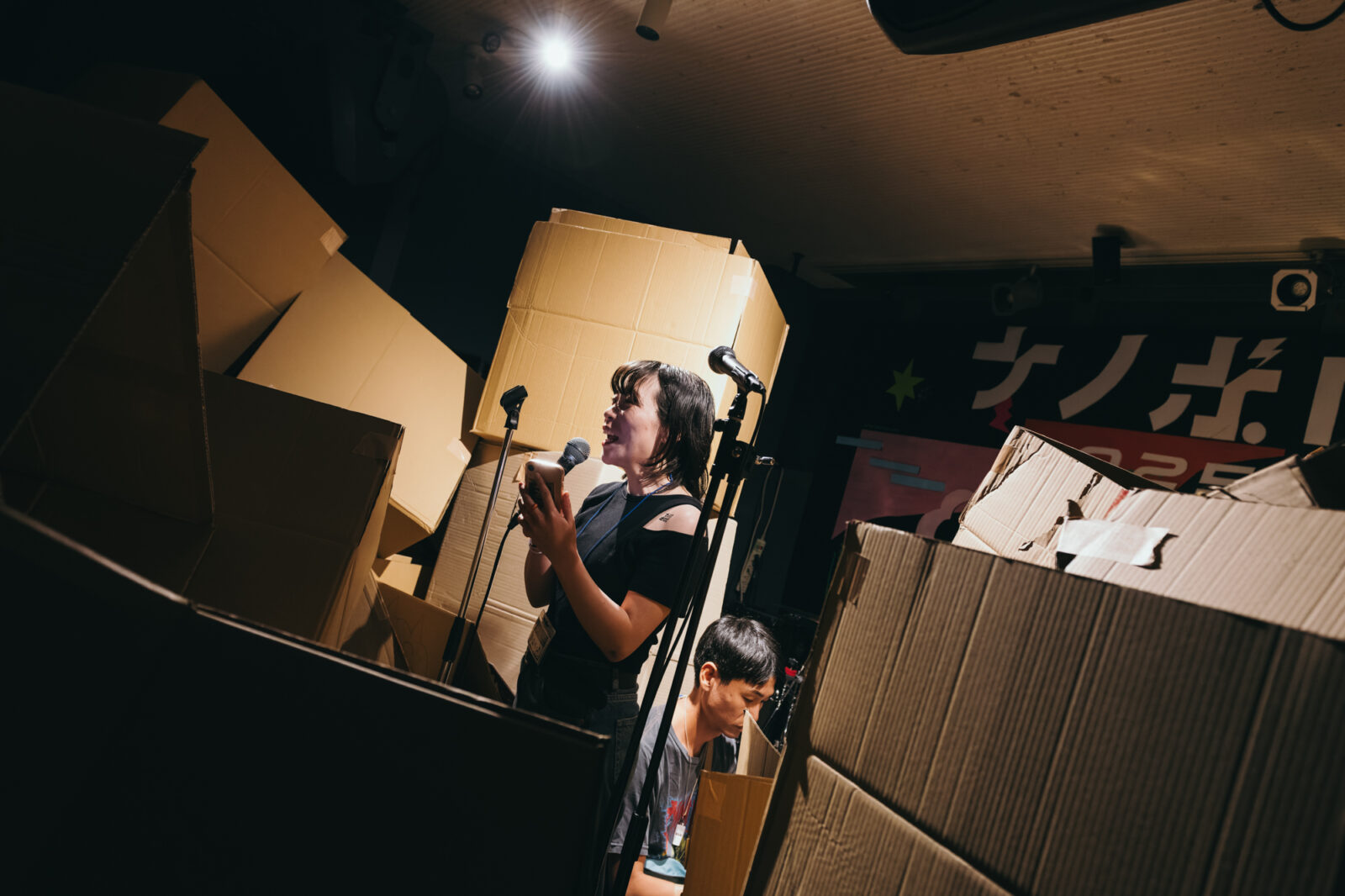 今年も『ナノボロ』スタッフのチームリーダーを務める村尾ひかりは、ダンボールの山に埋もれたまま開会宣言を行う。少しシュールな光景に、フロアの観客やスタッフ、出演者から笑いが起きた。スタッフの自由な発想で作られる会場だからこそ生まれるユーモアと村尾の明るい声が合わさり、会場の空気は一気に「みんなで楽しむ」モードに切り替わった。