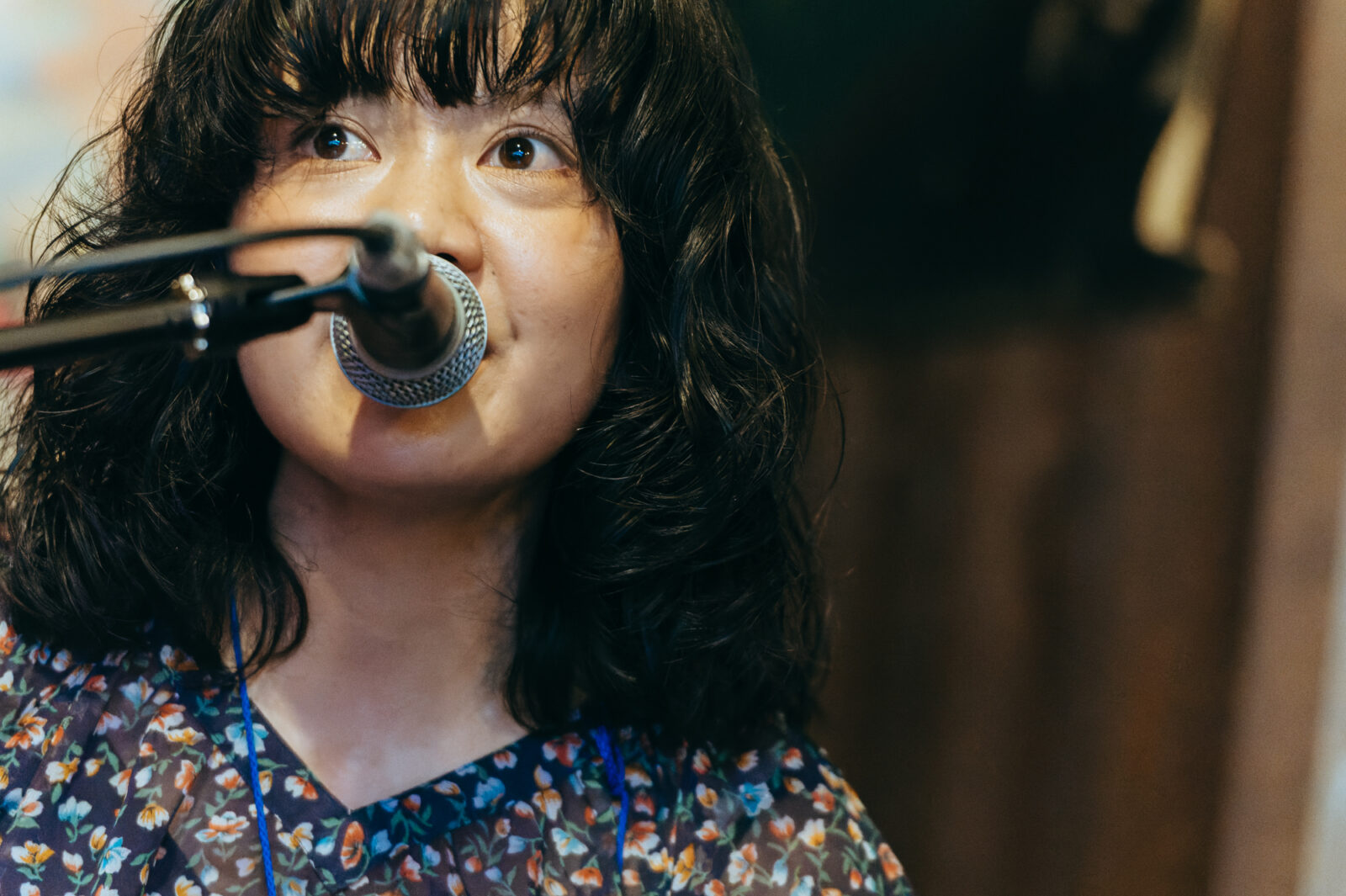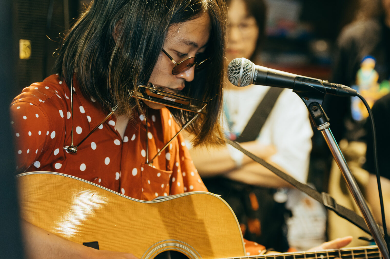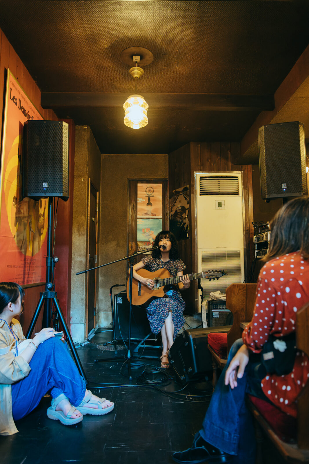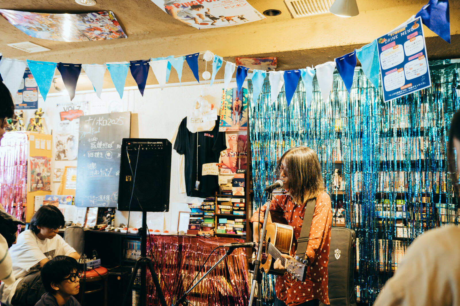 そんな〈□□□ん家〉に登場したシンガーソングライター、さとうじゅんのステージから観ていこう。静岡県出身で、大学進学とともに上洛。京都生活にどっぷりと浸かって感じてきた何気ない生活の雰囲気を、ときには大阪、東京、名古屋……と京都の外へも運んできた。この日も、何度も踏切に行く手を阻まれた宿敵の歌“嵐電”、自衛隊からの隊員募集が来たことを歌った“僕んちのポスト”と披露していき、観光地ではない「生活拠点・京都の景色」をシニカルかつ温和に映し出す。さとうのフォーキーな楽曲の数々は、ボードゲームや漫画の並ぶカラフルなこの会場の雰囲気をセピア色に変えていった。彼は「えー……次の「ソング」は……」と独特な言葉遣いをしながらマイペースに演奏を続ける。“ハント・バイシクル”では、放置自転車の撤去作業車や市政に苦言を呈した歌詞に、観客も共感の笑いを禁じ得ない様子。哀愁を纏ったハーモニカの音色も相まって、自転車の乗った作業車が遠ざかっていくなんとも切なすぎる光景が浮かび、笑えると同時に胸が締め付けられる。情緒溢れるギターやハーモニカの音色が、その哀愁をさらに引き立たせているようだった。演奏に聴き入るほどに、さとうじゅんの独特の再現力と裏表のないユーモアの虜になっていく。