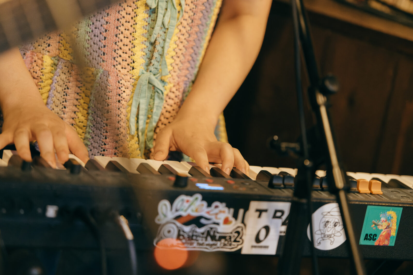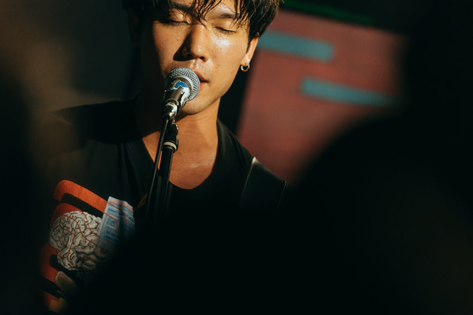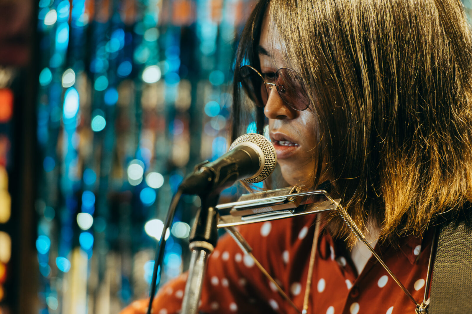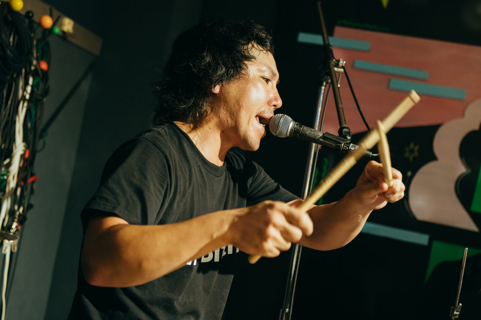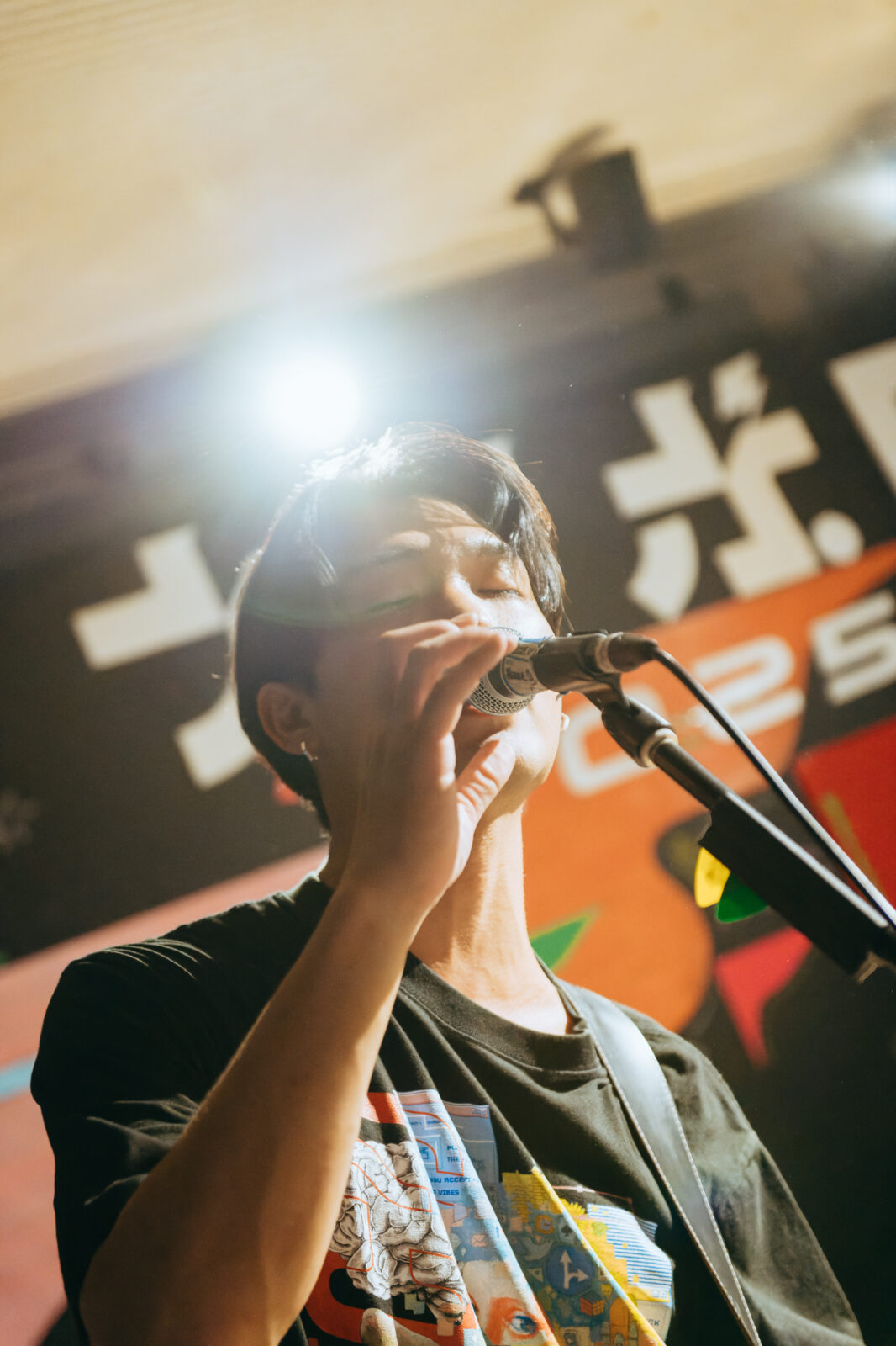 そんな〈□□□ん家〉に登場したシンガーソングライター、さとうじゅんのステージから観ていこう。静岡県出身で、大学進学とともに上洛。京都生活にどっぷりと浸かって感じてきた何気ない生活の雰囲気を、ときには大阪、東京、名古屋……と京都の外へも運んできた。この日も、何度も踏切に行く手を阻まれた宿敵の歌“嵐電”、自衛隊からの隊員募集が来たことを歌った“僕んちのポスト”と披露していき、観光地ではない「生活拠点・京都の景色」をシニカルかつ温和に映し出す。さとうのフォーキーな楽曲の数々は、ボードゲームや漫画の並ぶカラフルなこの会場の雰囲気をセピア色に変えていった。彼は「えー……次の「ソング」は……」と独特な言葉遣いをしながらマイペースに演奏を続ける。“ハント・バイシクル”では、放置自転車の撤去作業車や市政に苦言を呈した歌詞に、観客も共感の笑いを禁じ得ない様子。哀愁を纏ったハーモニカの音色も相まって、自転車の乗った作業車が遠ざかっていくなんとも切なすぎる光景が浮かび、笑えると同時に胸が締め付けられる。情緒溢れるギターやハーモニカの音色が、その哀愁をさらに引き立たせているようだった。演奏に聴き入るほどに、さとうじゅんの独特の再現力と裏表のないユーモアの虜になっていく。