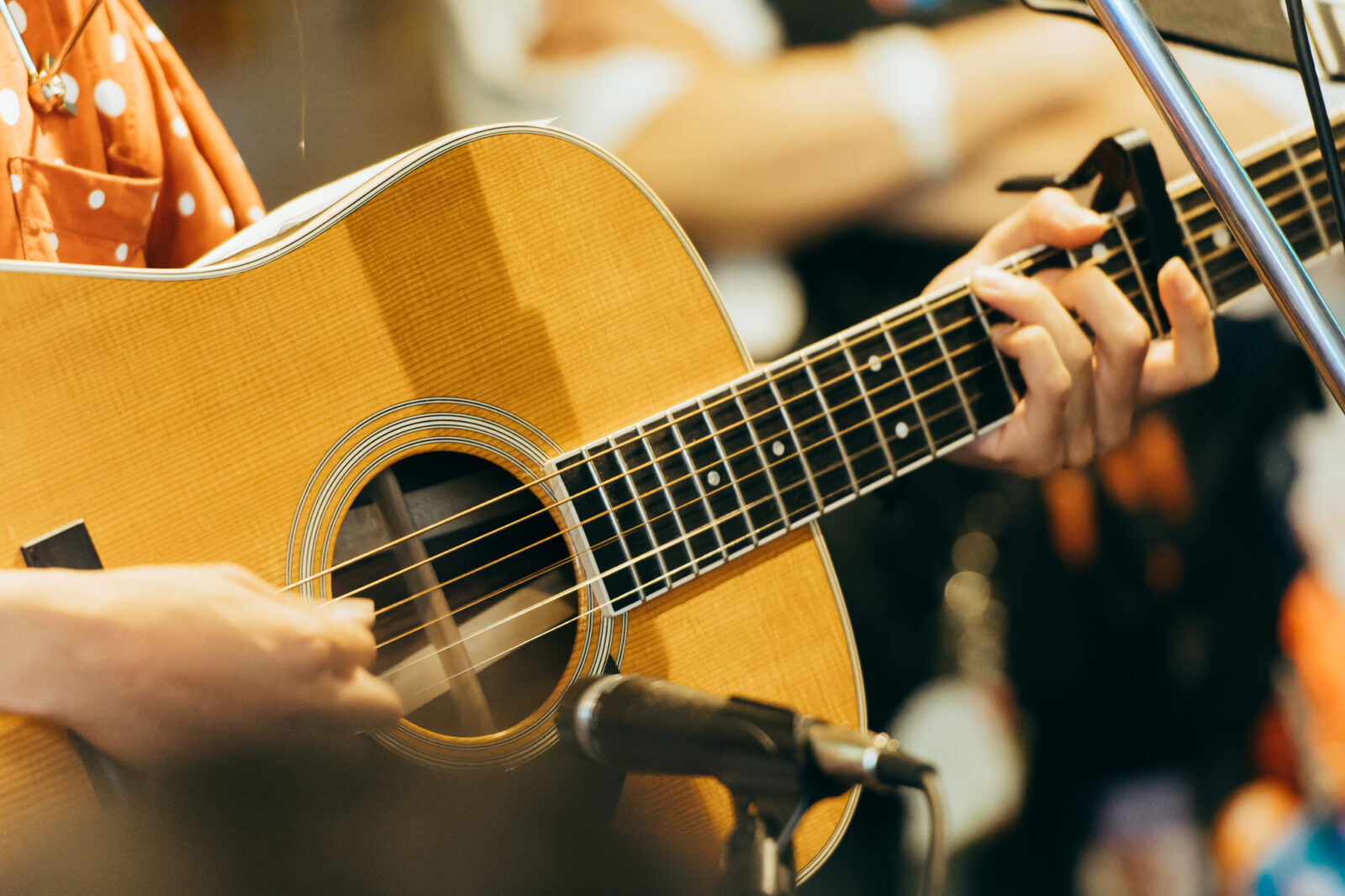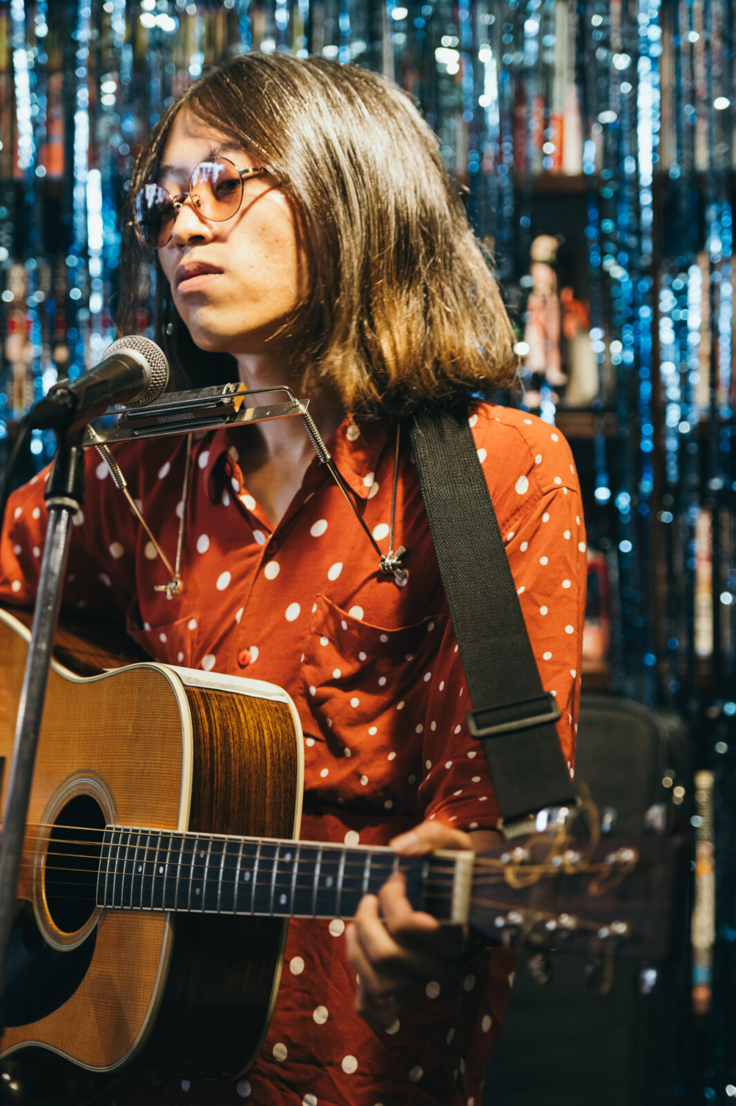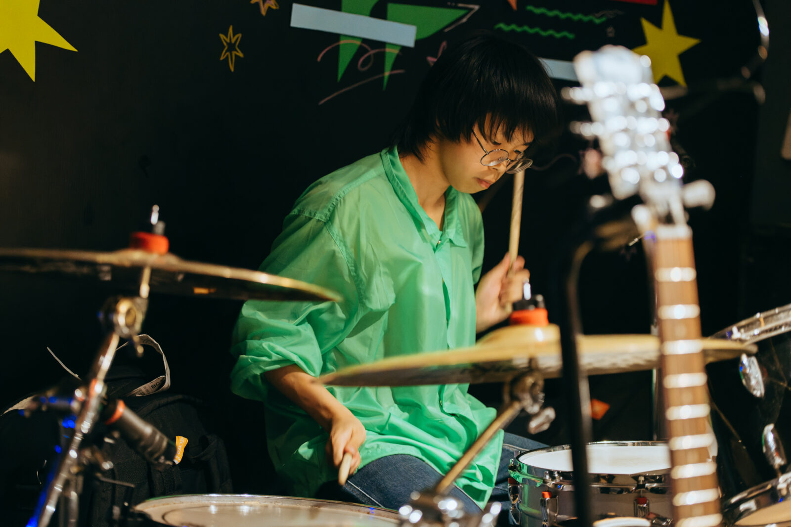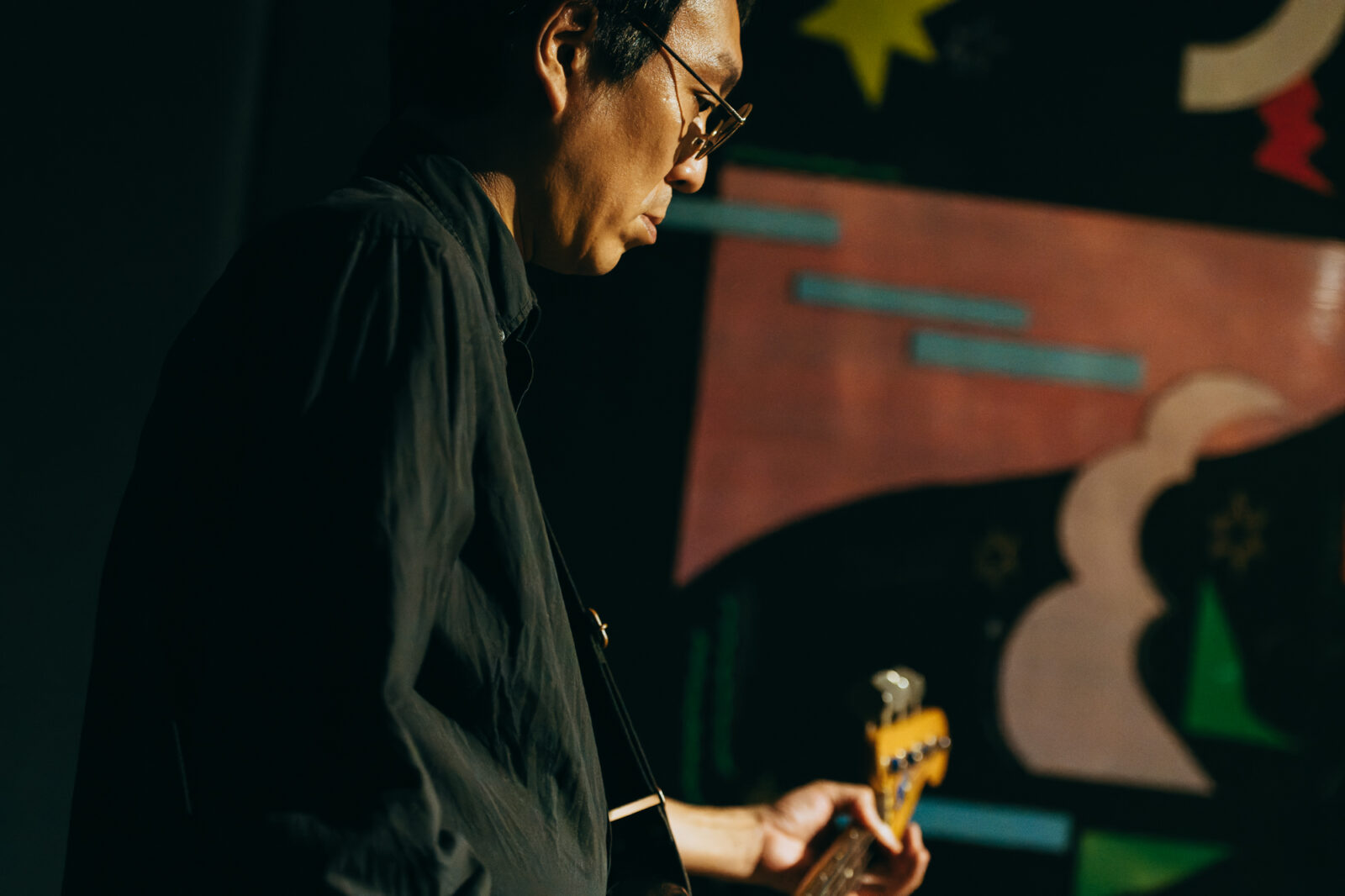 そんな〈□□□ん家〉に登場したシンガーソングライター、さとうじゅんのステージから観ていこう。静岡県出身で、大学進学とともに上洛。京都生活にどっぷりと浸かって感じてきた何気ない生活の雰囲気を、ときには大阪、東京、名古屋……と京都の外へも運んできた。この日も、何度も踏切に行く手を阻まれた宿敵の歌“嵐電”、自衛隊からの隊員募集が来たことを歌った“僕んちのポスト”と披露していき、観光地ではない「生活拠点・京都の景色」をシニカルかつ温和に映し出す。さとうのフォーキーな楽曲の数々は、ボードゲームや漫画の並ぶカラフルなこの会場の雰囲気をセピア色に変えていった。彼は「えー……次の「ソング」は……」と独特な言葉遣いをしながらマイペースに演奏を続ける。“ハント・バイシクル”では、放置自転車の撤去作業車や市政に苦言を呈した歌詞に、観客も共感の笑いを禁じ得ない様子。哀愁を纏ったハーモニカの音色も相まって、自転車の乗った作業車が遠ざかっていくなんとも切なすぎる光景が浮かび、笑えると同時に胸が締め付けられる。情緒溢れるギターやハーモニカの音色が、その哀愁をさらに引き立たせているようだった。演奏に聴き入るほどに、さとうじゅんの独特の再現力と裏表のないユーモアの虜になっていく。