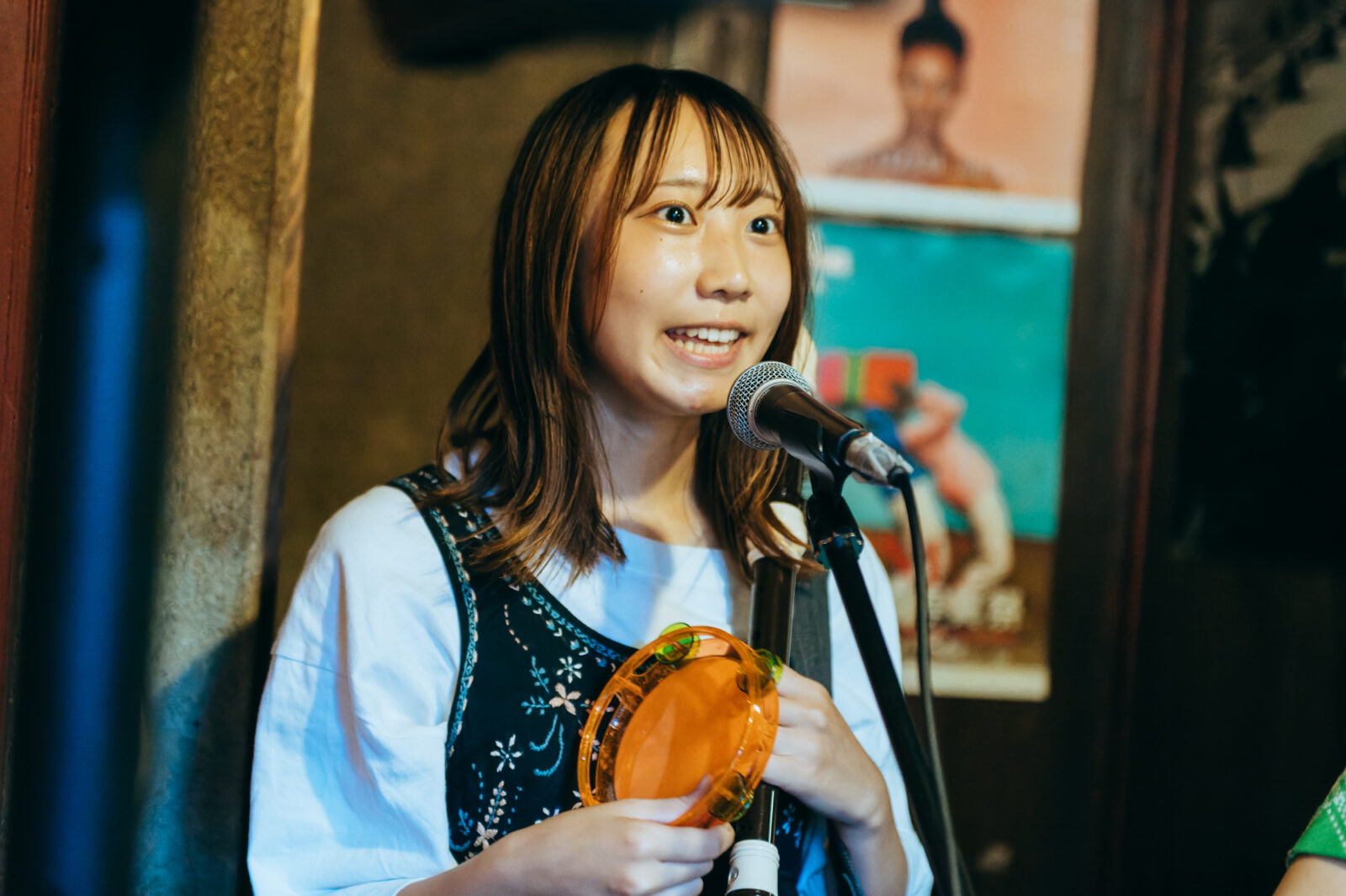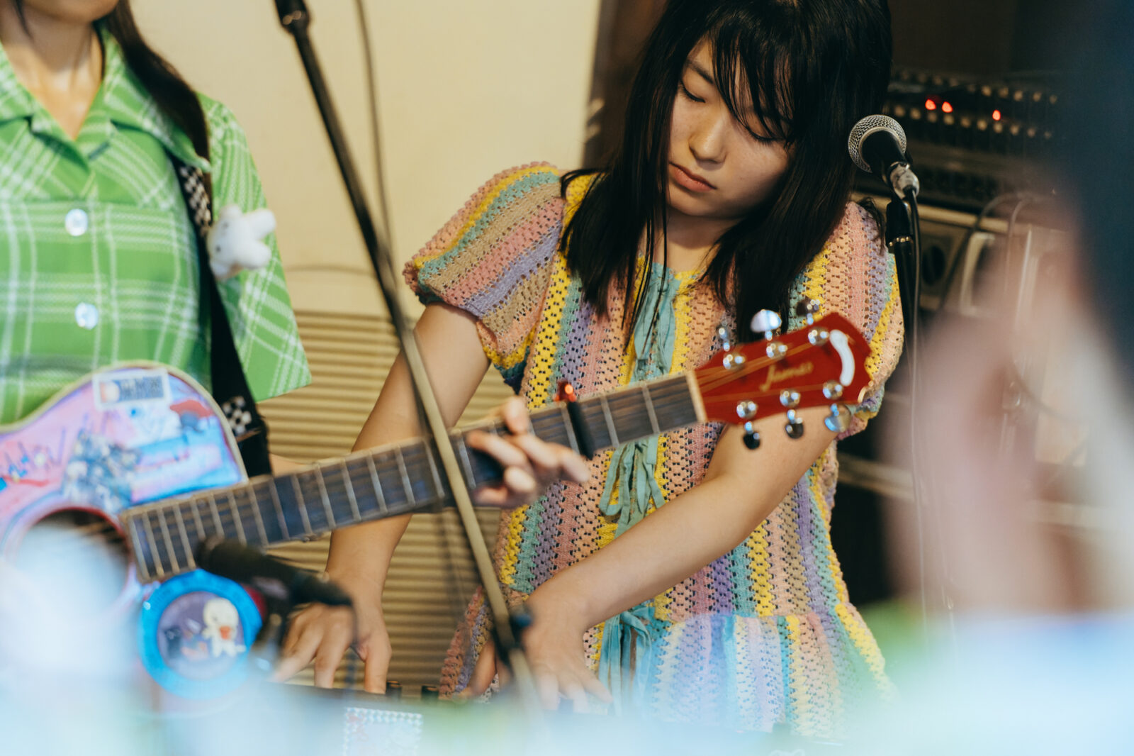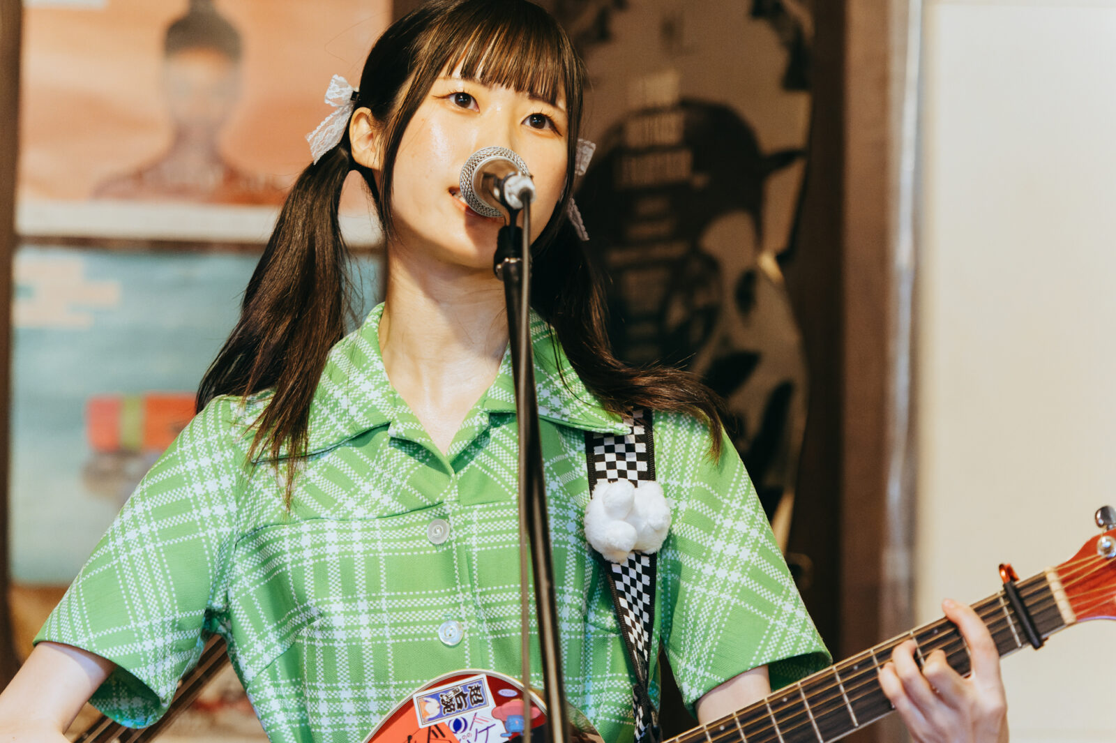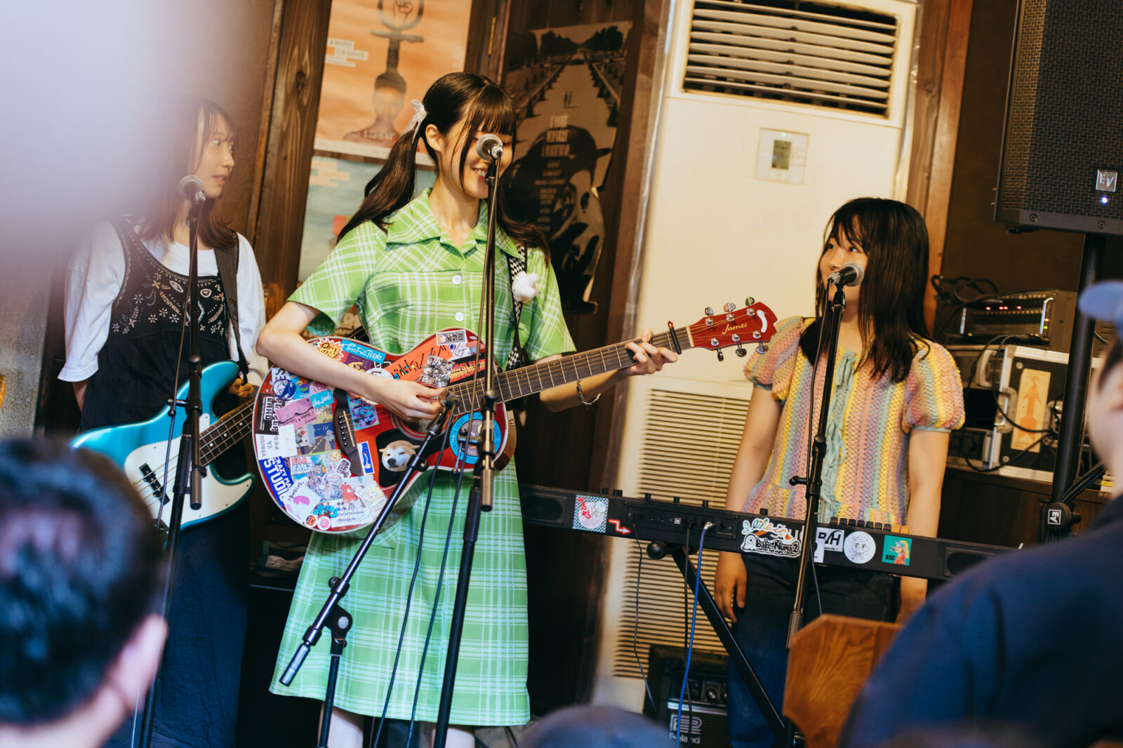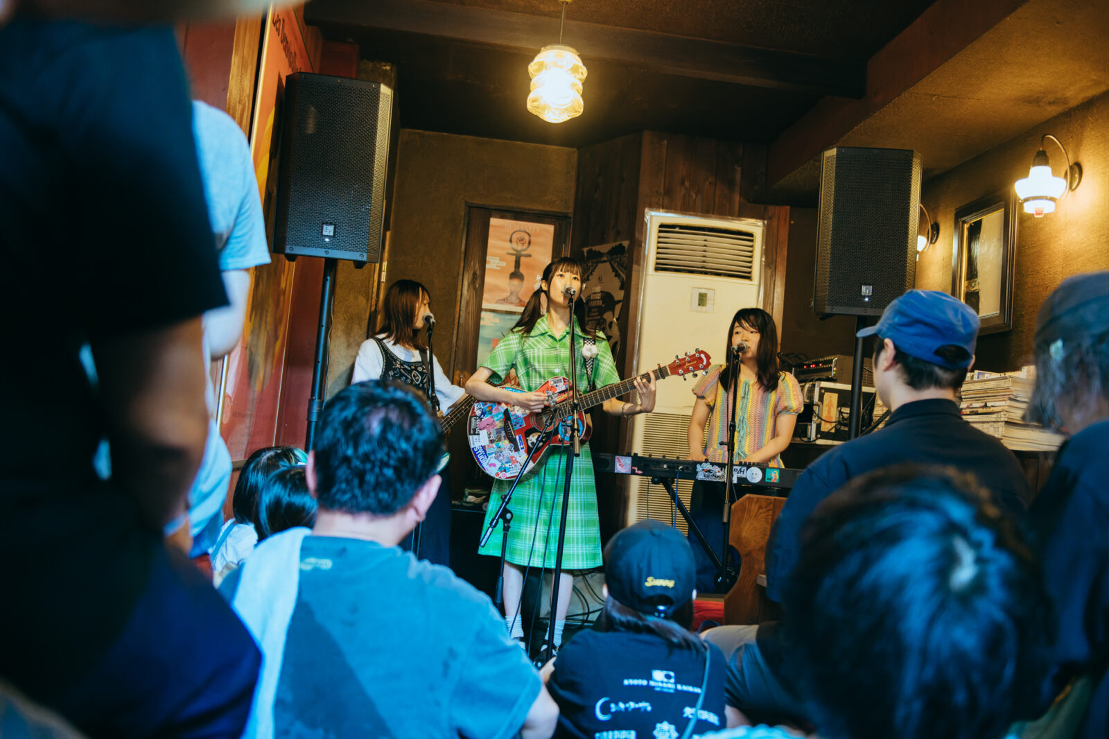 ときめきポメラニアンは、〈喫茶マドラグ〉のステージにアコースティック編成で出演。“月待つ犬のテーマ”のイントロでは、ヤハ(Ba)がオレンジの小さなタンバリンを叩き、途中でリコーダーに持ち替えては、のちにベースも弾くという三刀流を披露した。あさひ(Gt / Vo)はMCで、アコースティックゆえに「いつもよりたくさん歌詞を聴いてもらえる気がする」と語り、今回の『ナノボロ』で初披露だという新曲について説明を始めた。「憧れの友達について歌った曲です」というが、実際は穏やかな旋律で微笑みながらアイロニーをたっぷり詰め込んだ捻くれチューン。ふわふわとしたポメラニアンも、やはり犬。時折見せる鋭い牙のような歌詞もあってか、「ときポメはパンクだ!」と評価されることがある。そのギャップもまた、彼女たちの持つ唯一無二の面白さだ。8月に配信リリースされた“サマープレッシャー”では、ひさか(key)の奏でる爽やかで美しいメロディが〈マドラグ〉の空間を彩る。