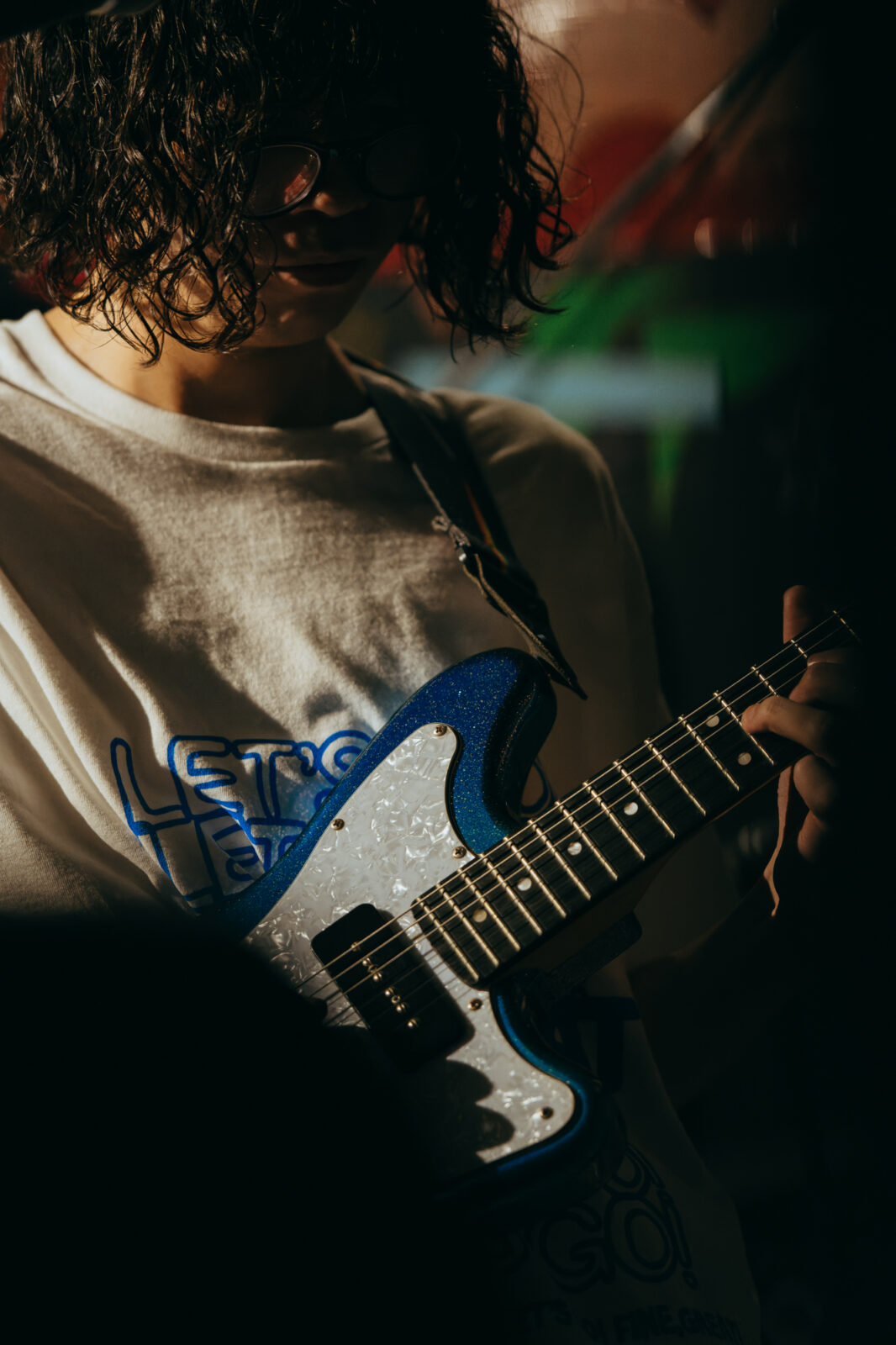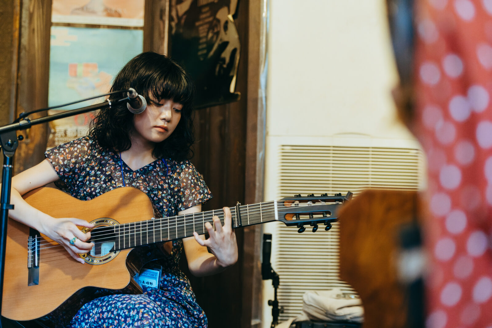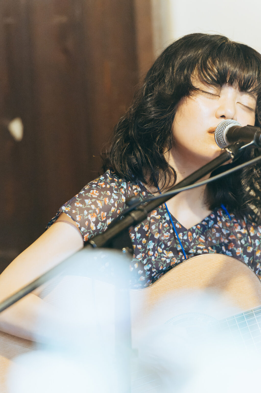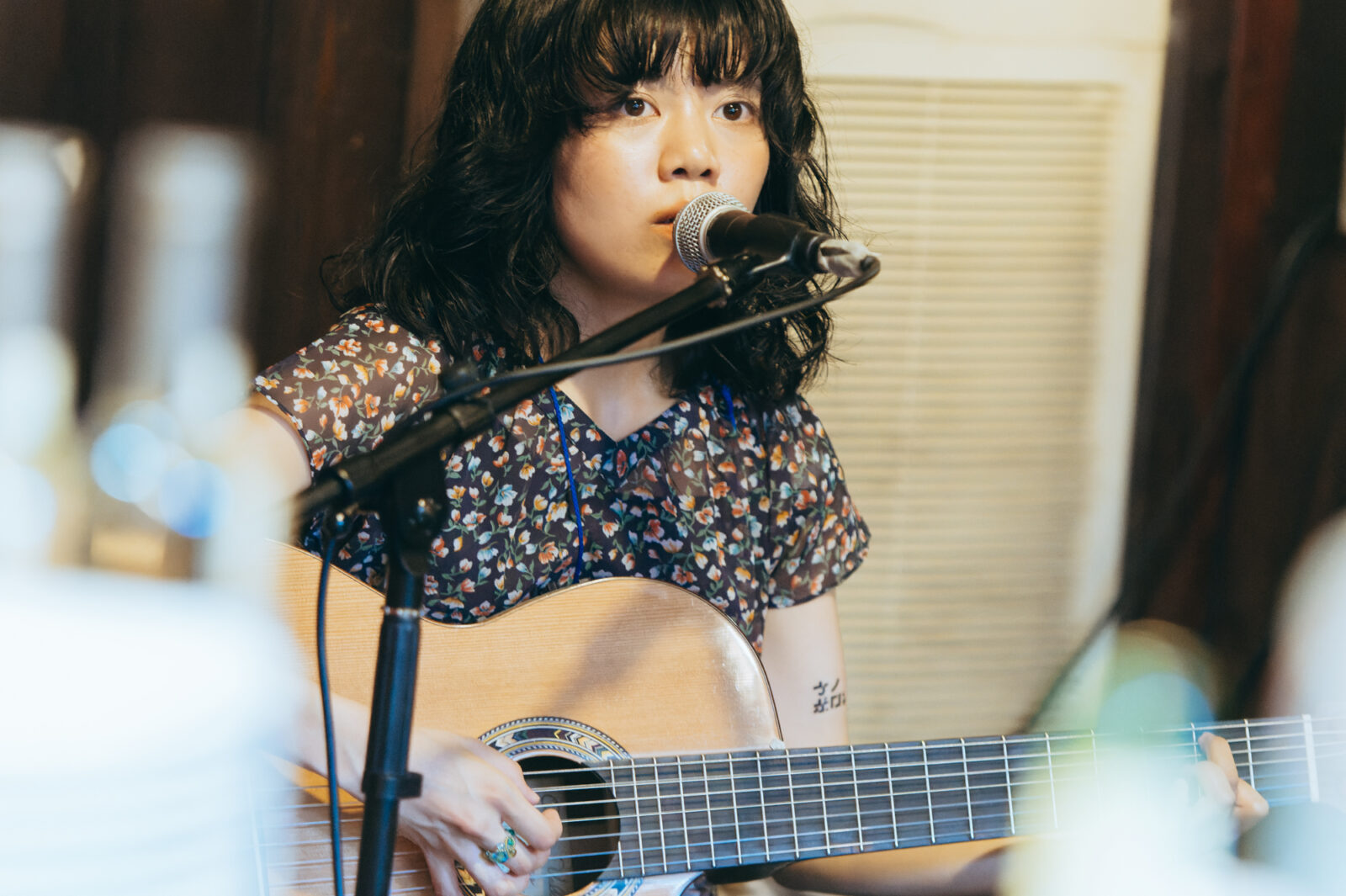 そこへ登場したのは、シンガーソングライター日髙晴野。1st EP『白柵舎』に収録されている“海辺の白馬”では、相棒である7弦ギターの豊かな音色が響き渡る。曲と曲の間では、微かに日髙の鼻歌が聞こえてくる。力強さの中に柔らかな自由奔放さを感じる日髙の姿を見ていると、京都出身のミュージシャン中村佳穂の姿と重なった。新EPからは、“Hold me, Hold time”、“春の身体”も披露。声の強弱、弦の弾き方、演奏中に豊かに変わる表情……自らの持つ表現方法のすべてを駆使し、圧倒的な存在感を醸し出す。身一つ、ギター一本で舞台にいるのを忘れてしまうくらいの豊かな表現力。〈マドラグ〉に、糸がピンと張ったような少しの緊張感と音楽の温もりとが同居する空間が生まれた。続く“日記”は、大学時代を京都で過ごした日髙の鴨川のイメージをさらに膨らませた楽曲。はじまりはメロディではなくこのような語りから始まる。