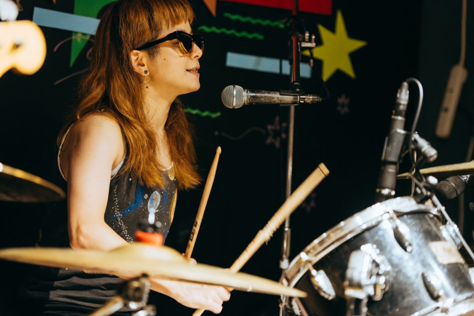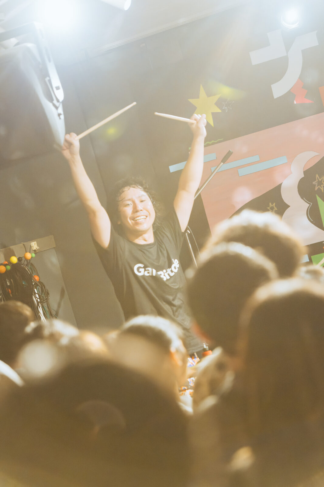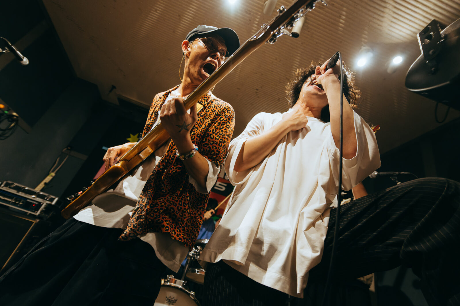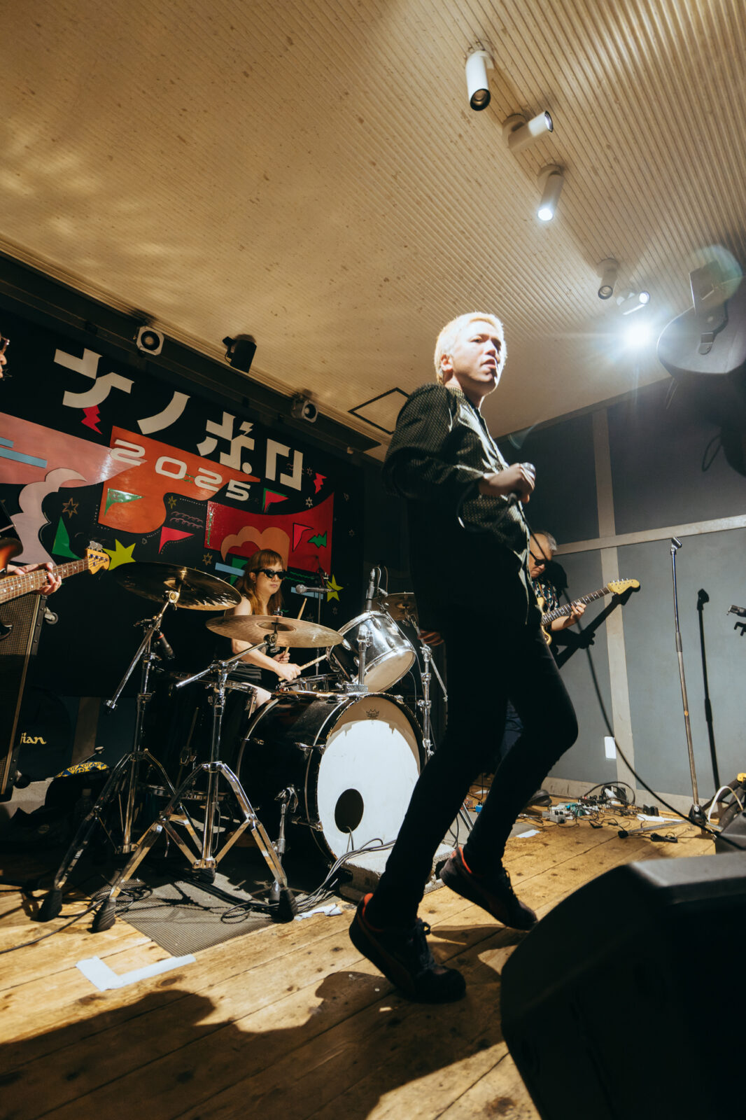 再び〈livehouse nano〉に戻ると登場したのは、ヤジマX KYOTO。ゲイリー・ビッチェ(Dr / Vo)のソロプロジェクトとして、モーモールルギャバンと並行して長らく活動してきた。ゲイリーはMCで「(自分たちは)この後に出るBLONDnewHALFと同じくらい最年長かな?平たく言うと、おじさんです!」と早速笑いを取る。このような自虐とは裏腹に、パワフルなドラムを叩きながらでもまったくと言っていいほど歌声がブレない。“羊飼いとサギ師”では、ベースとギターが加わったすべての音がバランス良く絡み合い、メンバーそれぞれの音が等しく立つ。その演奏や言葉はまさに、「確かな技術の上に成り立つ自由」。“コロニーの夜に”では、自然とフロアから手拍子が起こって温かい雰囲気に。観客との交流を楽しむユーモラスなMCをしながら、豊かな表情を見せて演奏を続けるゲイリー。何をするか分からないそのトリッキーさはモーモールルギャバンでもお馴染みの姿だが、このヤジマX KYOTOでは、心の内を伝えようとする真っ直ぐな眼差しが印象的だった。“ライブハウスで会いましょう”が始まると、ゲイリーがドラムセットから立ち上がって観客の顔を見渡しながら歌う。曲中に放った、「何度でも何度でも何度でも何度でも、ライブハウスで会いましょう!」という叫びは、自身が積み重ねてきたライブハウスでの時間そのもののように響いた。観客を笑顔にする一方で、純粋な音楽や言葉を届けるということも大切にする。そのブレのない演奏や言葉の端々から、そんな想いを感じとれた。