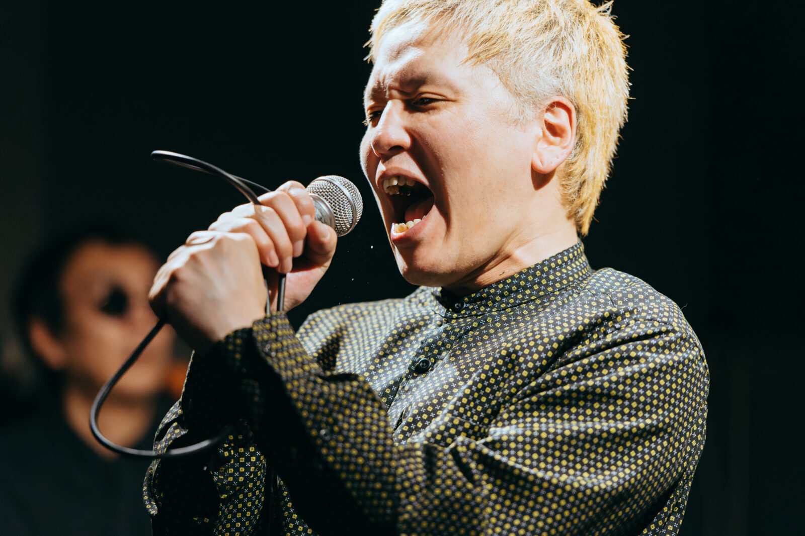家出ジョニー(Vo)の物腰の柔らかい挨拶から打って変わって、1曲目の“oka tengoku”から、BLONDnewHALFの持つ独特なカリスマ性が牙を剥く。繰り返しのベースラインに乗って激しく体を揺らし続けるフロアの様子は、もはやトランス状態のようだ。この渦に筆者も見事に巻き込まれ、メモを取る手がすっかり止まってしまった。続く“anti rolex”では、やはり淡々と正確に繰り返されるはまちゃんのベースとCOZのドラムに、ハイトーンを細かく刻むギターが絡みつく。ジョニーは、歌いながらリズムに乗って踊ることはするが、観客を煽ったり大きな声で何度もシャウトはしていない。この「特に乗り方を示さない」魅せ方は、観客それぞれに自由をもたらしていたと思う。自らのペースで思うがままに体を動かす若者たちの多くは、まるで何かから解放されたような笑みが漏れていた。