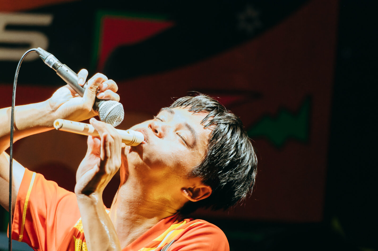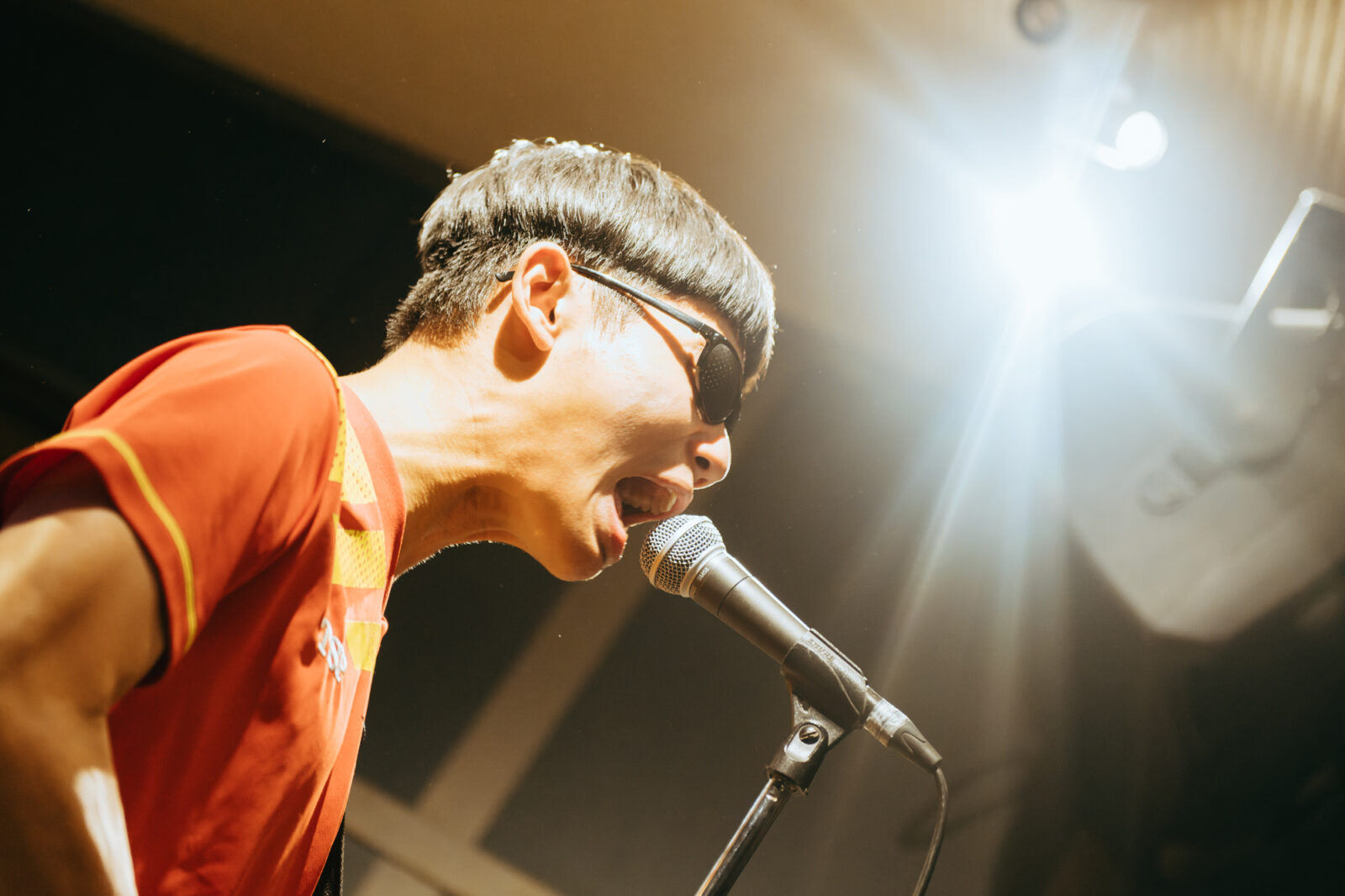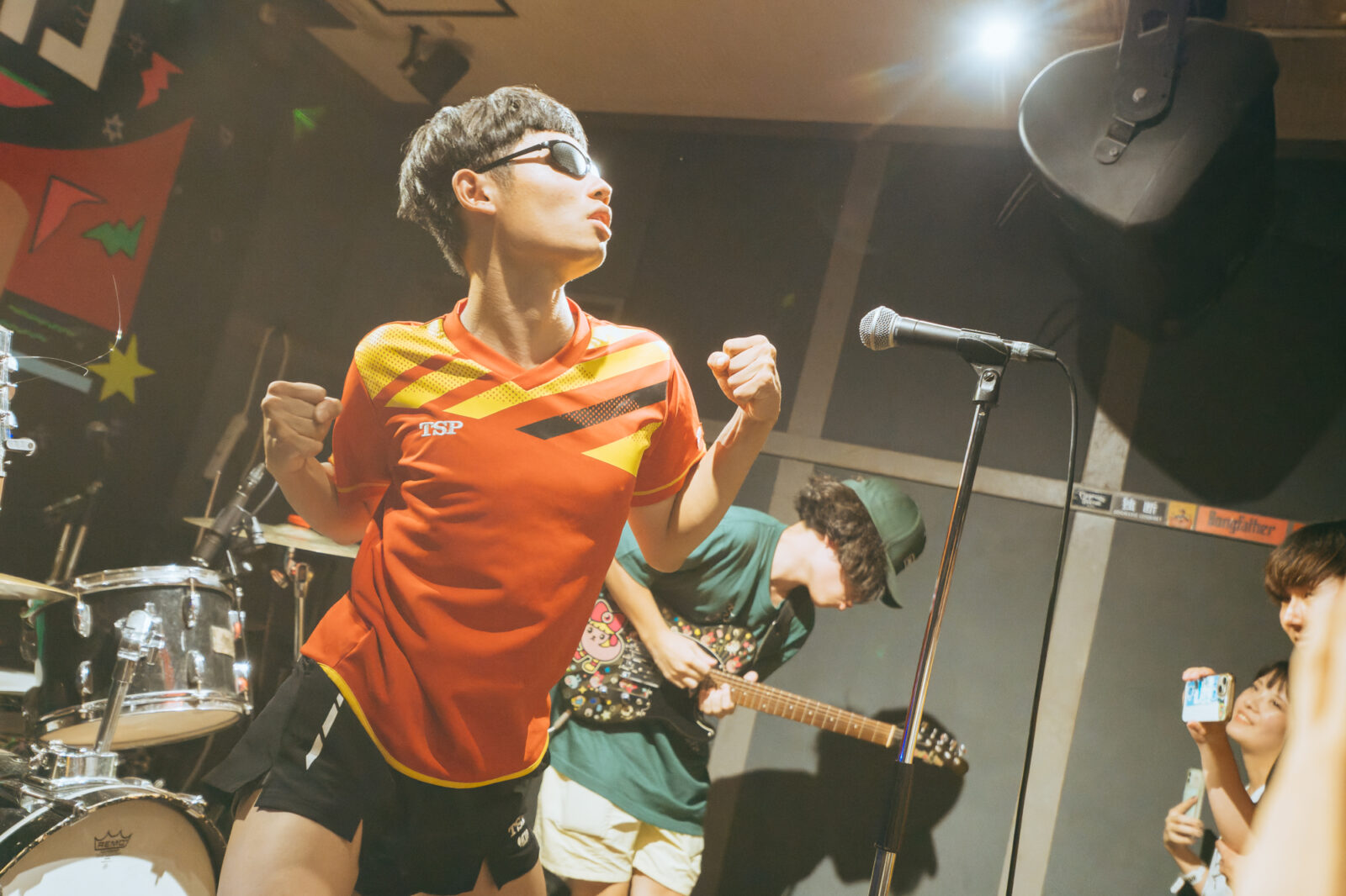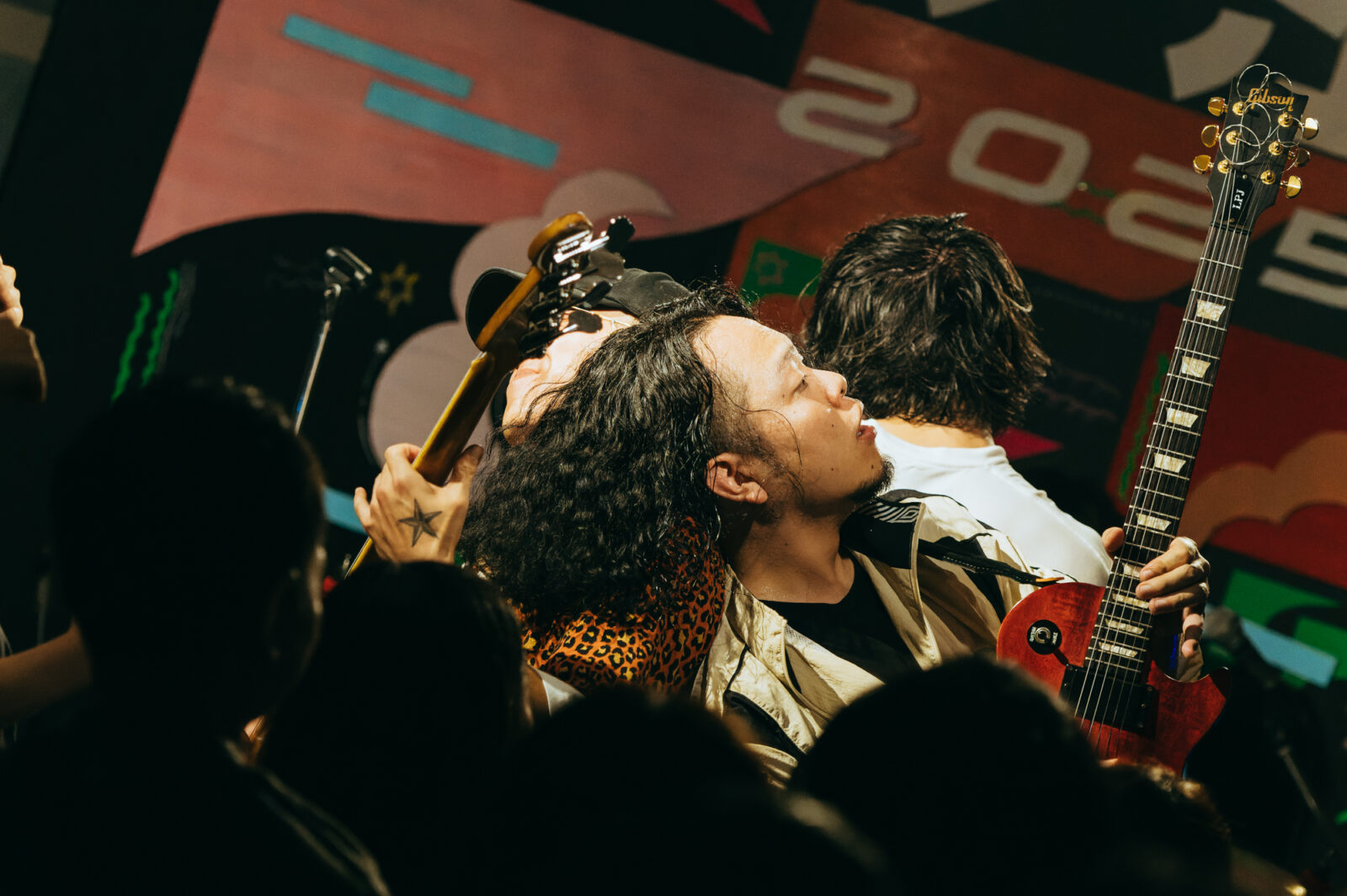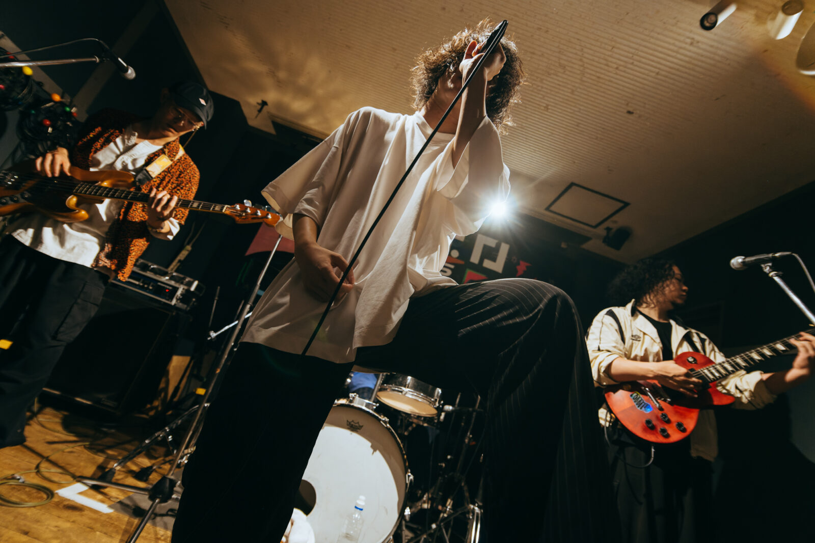 そこに続いて、この日最も異色な雰囲気を放っていたのは、2023年に札幌の高校で結成された鬼才バンド、テレビ大陸音頭。アニメ『鬼滅の刃』主題歌のLiSA“紅蓮華”が流れる中、メンバーが入場。千代谷竜司(Gt / Vo)が、のらりくらりと「ロックンロール、ロックンロール」と言いながらセンターの位置につく。サポートメンバーの戸借晴亜(Ba)以外は昨年までは高校生で、表情にあどけなさもうかがえる一方で、その奥底には計り知れない音楽的狂気を持ち合わせているようにも思えた。フロアも「明らかに「新しいヤツら」が来た……!」といった雰囲気が漂っている。そして「カモーン!」という合図で、1曲目の“Mサイズの男”が始まった。脱力感のあるラップで、初っ端からチルアウトな空気になったかと思いきや、次の曲“死んだら終わり人生は”ではアップテンポなギターが掻き鳴らされる。さらに、千代谷が「あああああああ俺はクラスのヒーローになりたかったのに!」と大絶叫する“minutemen”と続き、テレビ大陸音頭の名を全国に知らしめた”俺に真実を教えてくれ!!“も披露。こうしてひとしきり大暴れした後、最後はまさかのバラード“生きいそぎyouth”で締めくくる。最後まで何が起こるのかまったく予想がつかず、輪郭をあえて有耶無耶にしたまま駆け抜けていくステージは、まさに思春期大爆発。どうしようもないものはどうしようもない。無理に決着をつけず不規則に暴れ回る。好き勝手にやって帰っていくのに、彼らのライブは不思議と心が満たされた。最初は戸惑っているような雰囲気だった観客たちの満ち足りたような顔を見ていると、京都にまた新たな風が吹き込んだように感じられた。