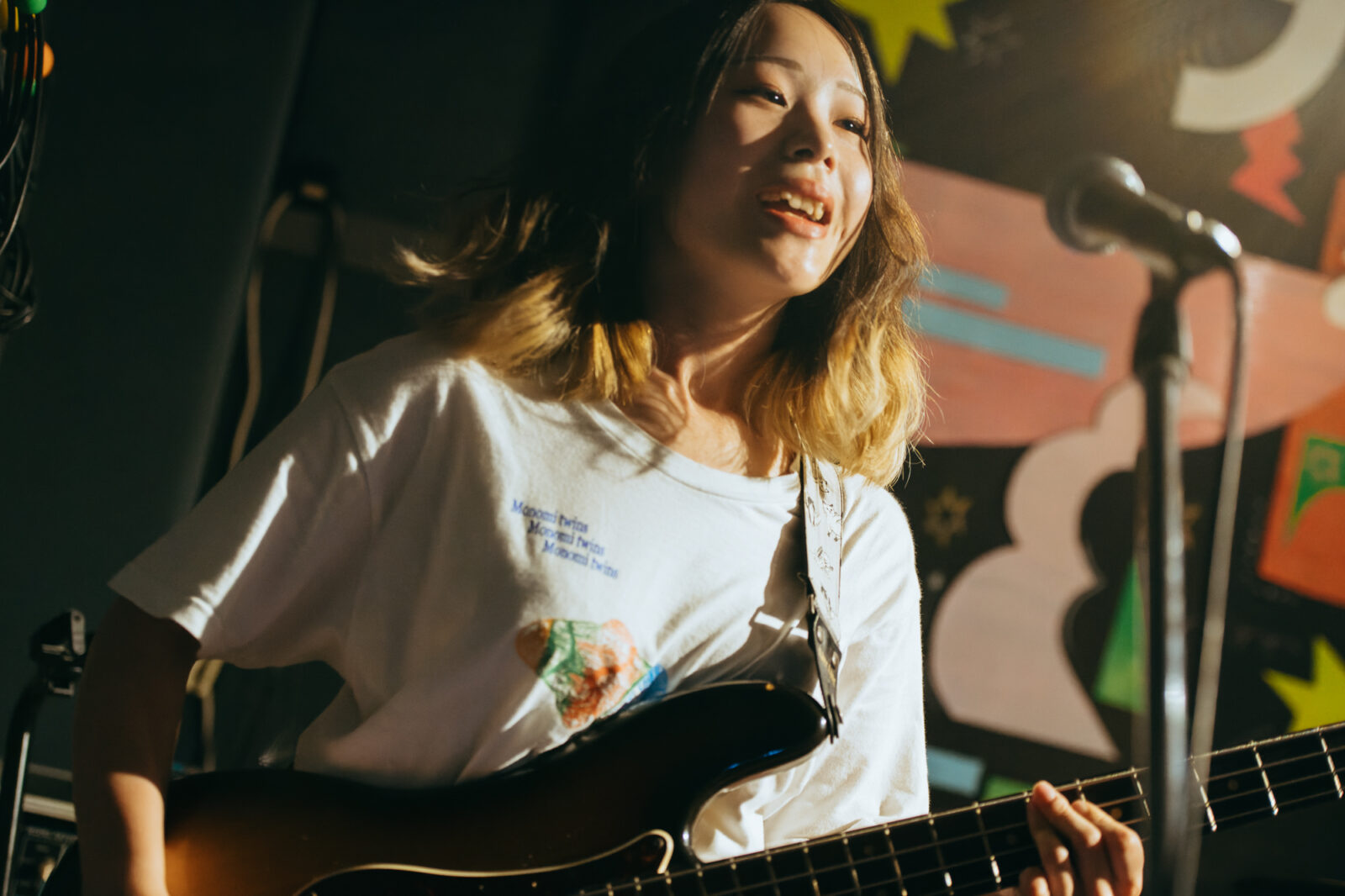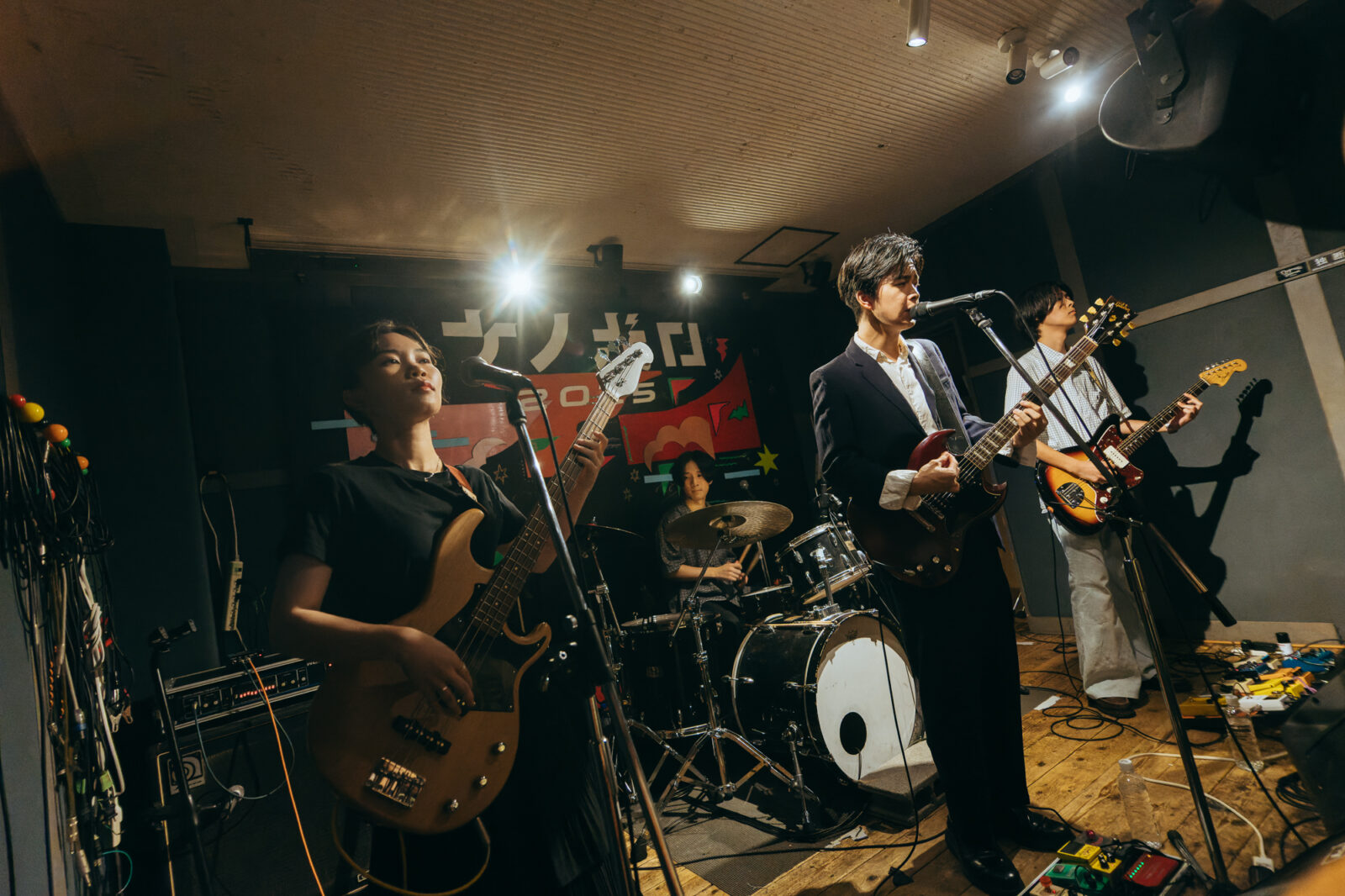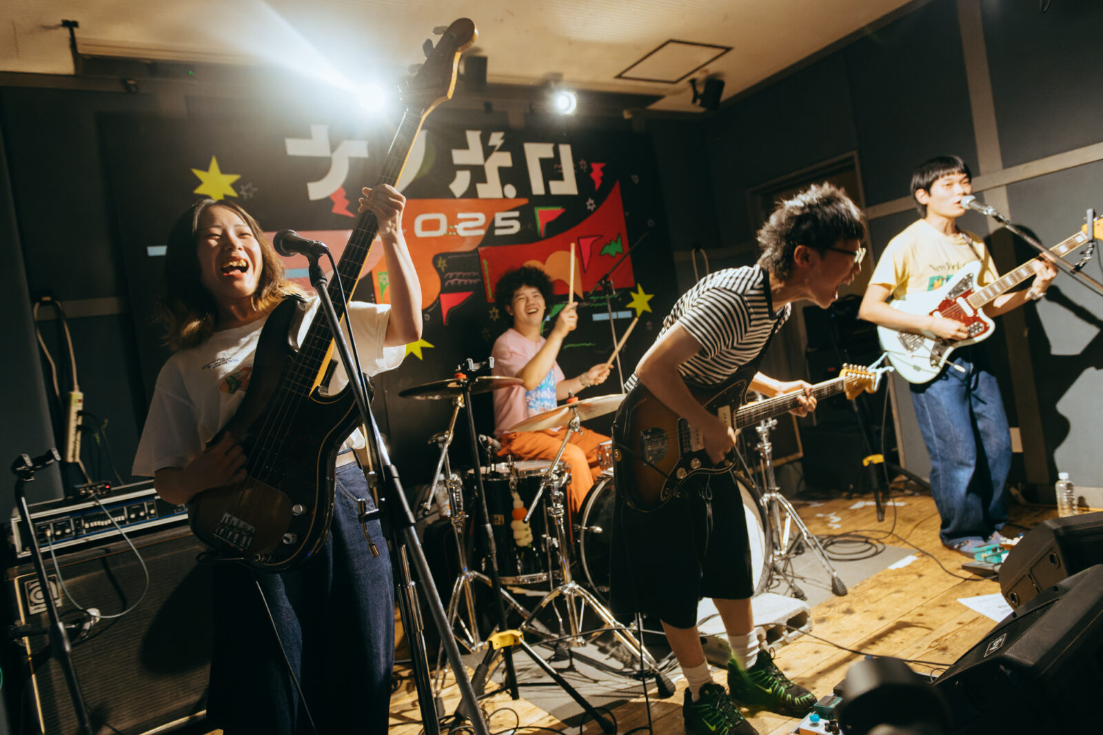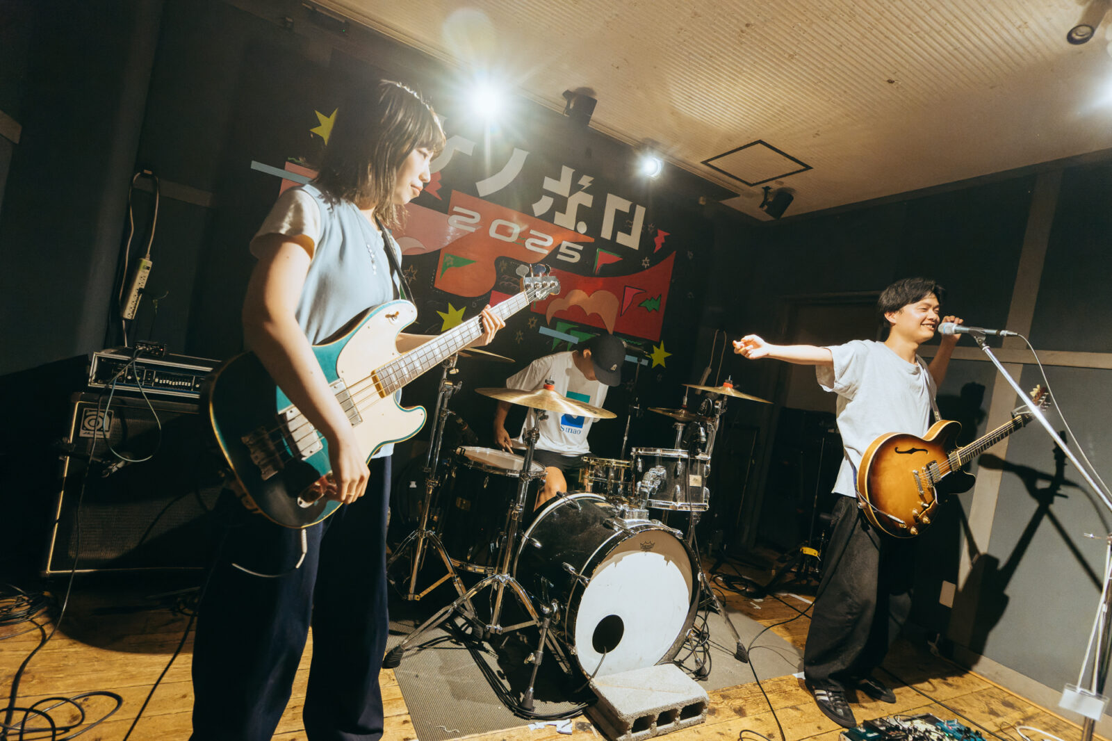 東京の3人組バンド、すなおのステージは、優しいポップさとロックンロールを併せ持つ楽曲“ひかり”から始まった。大畑カズキ(Gt / Vo)は、柔和に語るような歌声で丁寧に歌を届けるが、「もう二度と君は怒らないで」という部分で、限界まで振り絞る超ロングトーンを披露。初っ端からの思い切ったパフォーマンスに、フロアからは驚きまじりの歓声と拍手が贈られた。“スイミングスクール”では、夏休みの空気をそのまま持ってきたような爽やかなサウンドが〈nano〉の空間に広がっていく。リバーブの効いたボーカルも相まって、幼い頃の朧げな記憶が少しずつ透けていくようだ。今秋9月リリースのEP『Sparkle pop』に収録されている“するす・るするす”も演奏。楽しいリズムで奏でられるアミ(Ba)のベースが聴いていて心地良く、体が自然に揺れる。力強く鳴らされるゆーや(Dr)のシンバルの音も印象的で、和やかなイメージだけでは終わらせない絶妙なスパイスとなっていた。すなおの音楽は、真っ直ぐな言葉と旋律で心の奥に優しく染みこんでいく。その優しさが、『ナノボロ』の午後を一層温かく照らしていた。