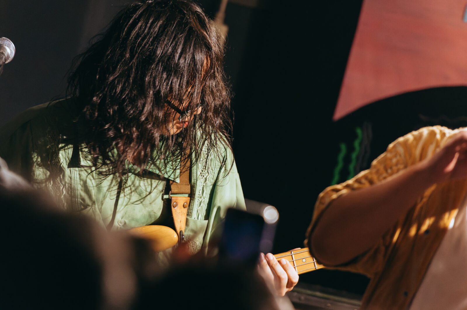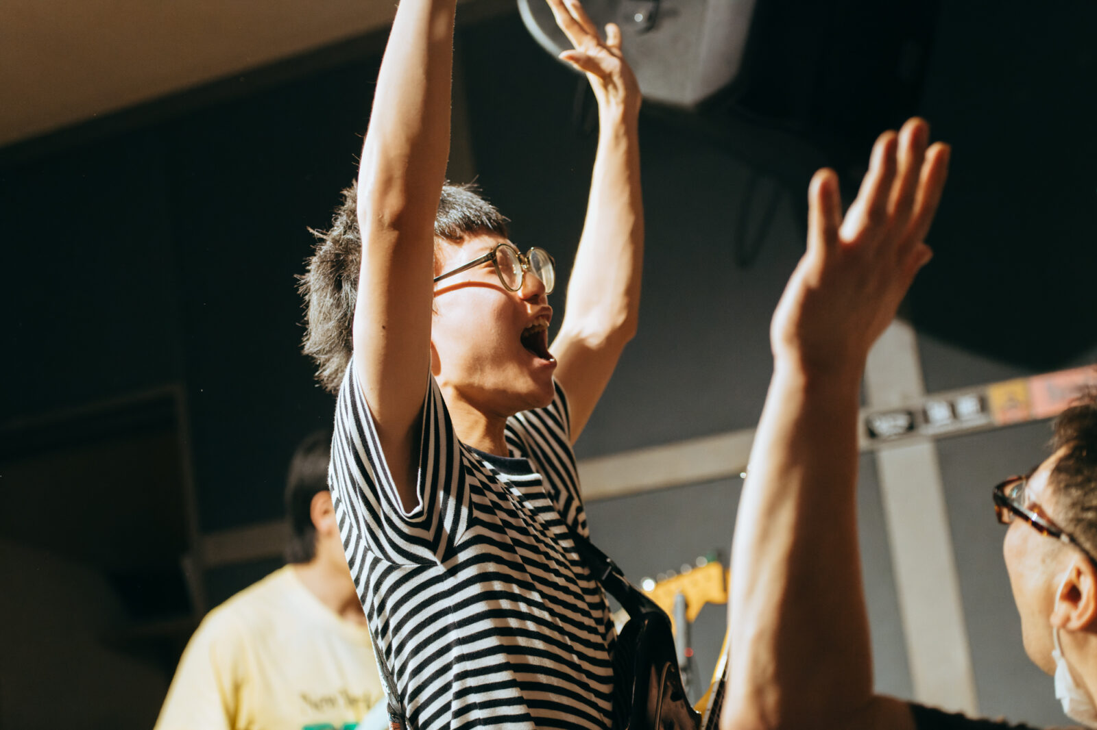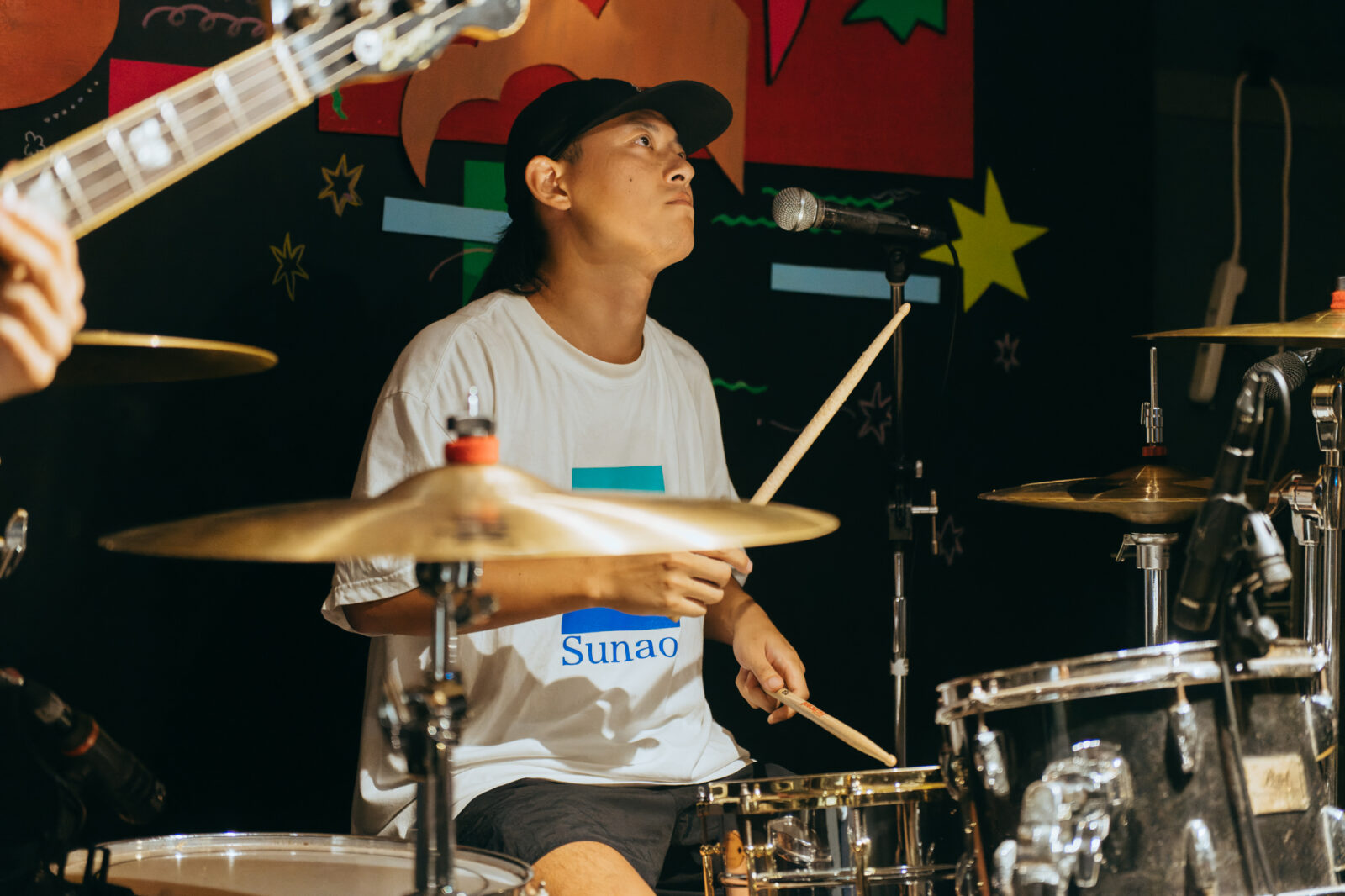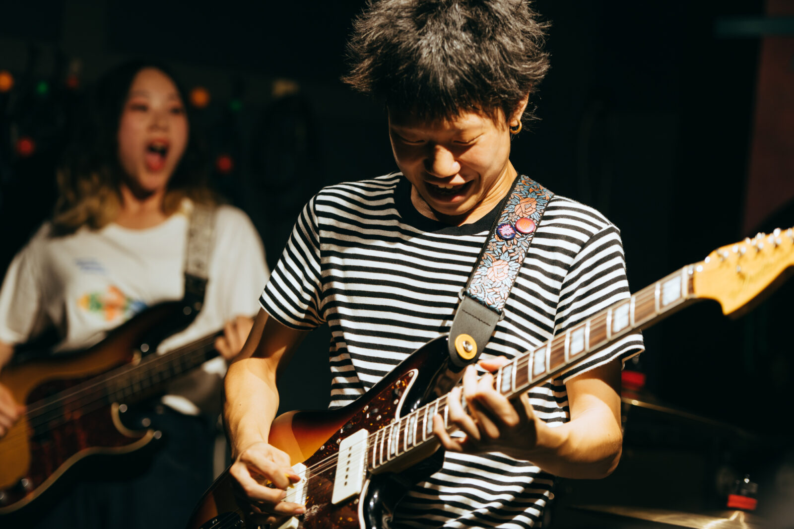 東京の3人組バンド、すなおのステージは、優しいポップさとロックンロールを併せ持つ楽曲“ひかり”から始まった。大畑カズキ(Gt / Vo)は、柔和に語るような歌声で丁寧に歌を届けるが、「もう二度と君は怒らないで」という部分で、限界まで振り絞る超ロングトーンを披露。初っ端からの思い切ったパフォーマンスに、フロアからは驚きまじりの歓声と拍手が贈られた。“スイミングスクール”では、夏休みの空気をそのまま持ってきたような爽やかなサウンドが〈nano〉の空間に広がっていく。リバーブの効いたボーカルも相まって、幼い頃の朧げな記憶が少しずつ透けていくようだ。今秋9月リリースのEP『Sparkle pop』に収録されている“するす・るするす”も演奏。楽しいリズムで奏でられるアミ(Ba)のベースが聴いていて心地良く、体が自然に揺れる。力強く鳴らされるゆーや(Dr)のシンバルの音も印象的で、和やかなイメージだけでは終わらせない絶妙なスパイスとなっていた。すなおの音楽は、真っ直ぐな言葉と旋律で心の奥に優しく染みこんでいく。その優しさが、『ナノボロ』の午後を一層温かく照らしていた。