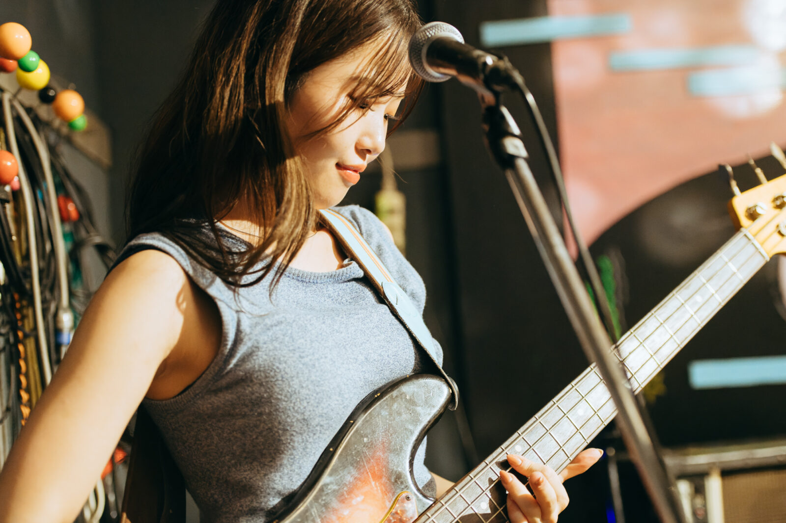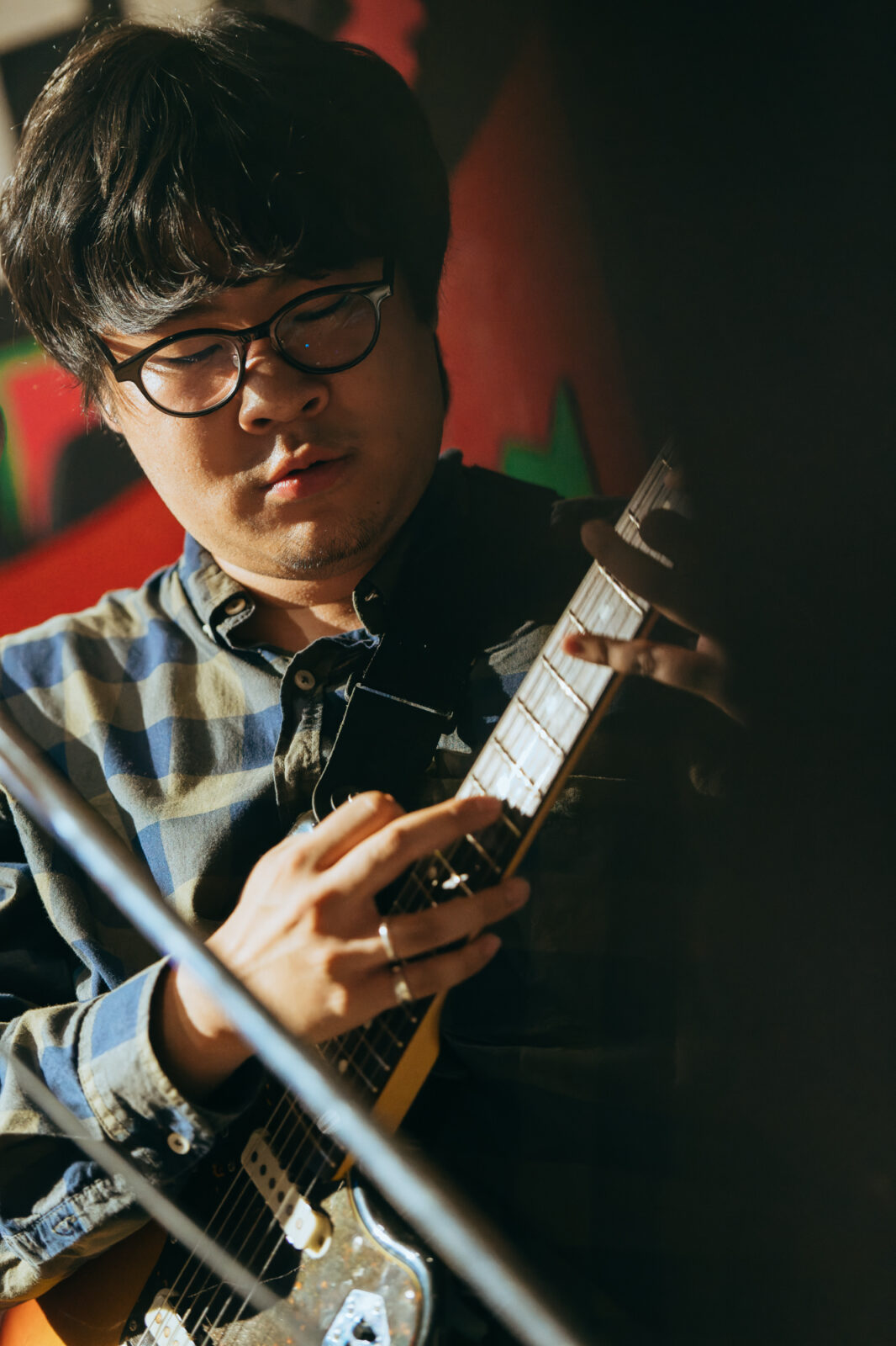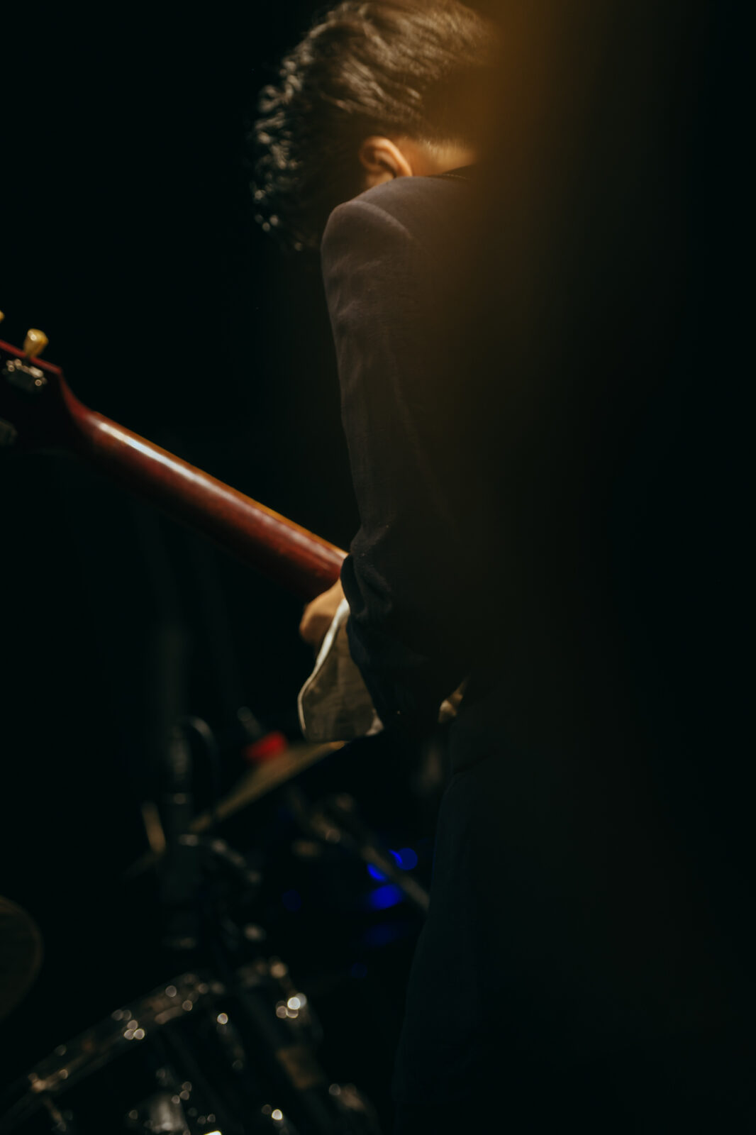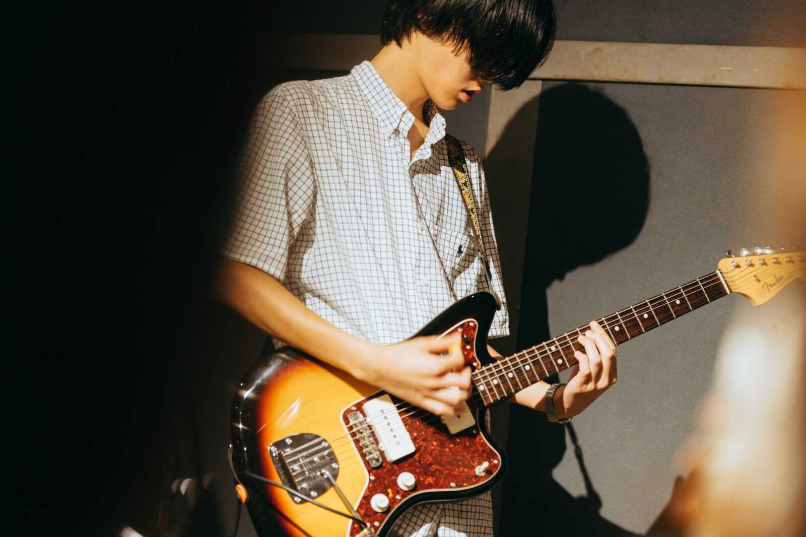 東京の3人組バンド、すなおのステージは、優しいポップさとロックンロールを併せ持つ楽曲“ひかり”から始まった。大畑カズキ(Gt / Vo)は、柔和に語るような歌声で丁寧に歌を届けるが、「もう二度と君は怒らないで」という部分で、限界まで振り絞る超ロングトーンを披露。初っ端からの思い切ったパフォーマンスに、フロアからは驚きまじりの歓声と拍手が贈られた。“スイミングスクール”では、夏休みの空気をそのまま持ってきたような爽やかなサウンドが〈nano〉の空間に広がっていく。リバーブの効いたボーカルも相まって、幼い頃の朧げな記憶が少しずつ透けていくようだ。今秋9月リリースのEP『Sparkle pop』に収録されている“するす・るするす”も演奏。楽しいリズムで奏でられるアミ(Ba)のベースが聴いていて心地良く、体が自然に揺れる。力強く鳴らされるゆーや(Dr)のシンバルの音も印象的で、和やかなイメージだけでは終わらせない絶妙なスパイスとなっていた。すなおの音楽は、真っ直ぐな言葉と旋律で心の奥に優しく染みこんでいく。その優しさが、『ナノボロ』の午後を一層温かく照らしていた。
