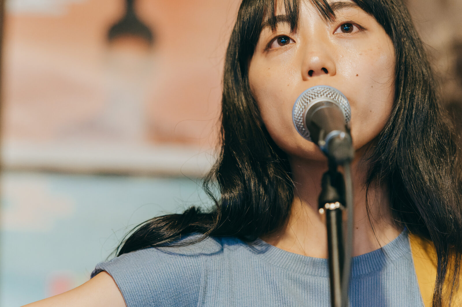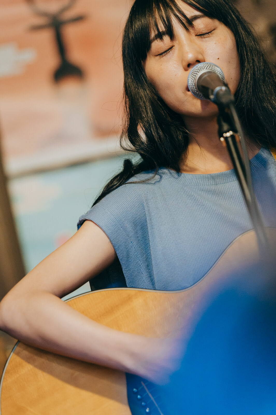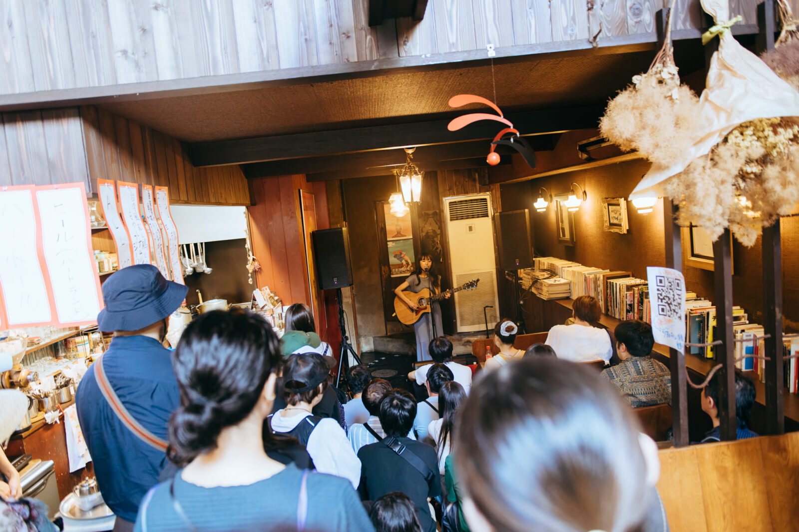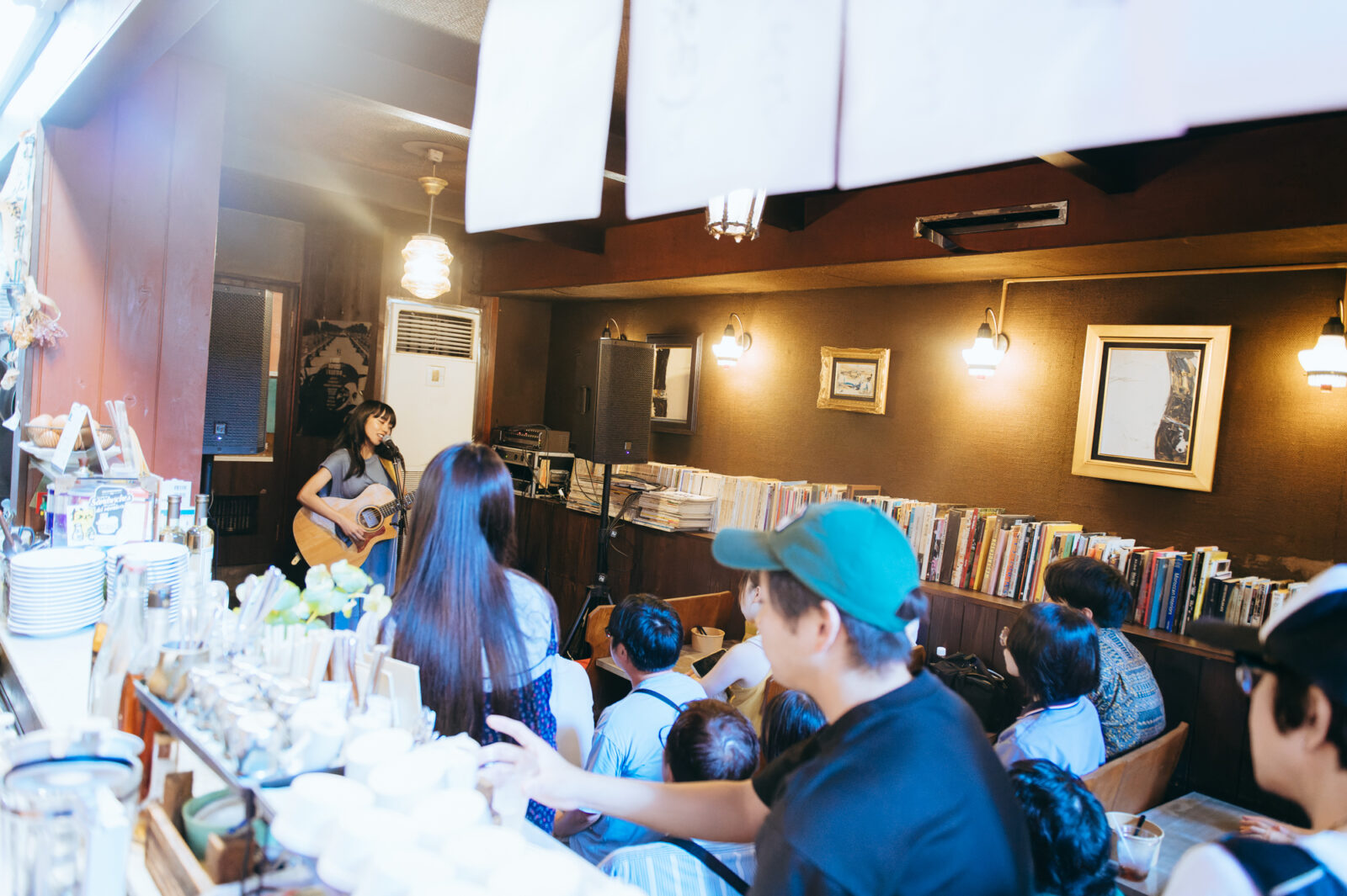 〈喫茶マドラグ〉へ入ると、既に多くの人がステージに向かって視線を送っている。前日のお昼時と同じように、店内のテーブルには彩り豊かな料理が並んでいた。そんな和やかな雰囲気の中、ステージに1本立てられたマイクの前に立ったのは真舟とわ。穏やかなアルペジオに、透き通った伸びやかな声が重なると、一気に幻想的な雰囲気が広がる。小さな喫茶店の空間が、風の吹く草原に変わっていくような開放感さえ感じた。“夏の予感”では、楽しいリズムの歌詞に体が揺れる。この日は8月の最終日。今年の夏はうだるような暑さが続いたことばかりを思い出してしまうが、真舟の優しい声で語られる夏のワクワクを聴いていると、冷たい水の気持ち良さや空の深い青色を思い出す。彼女は「『ナノボロ』のいいところは、暑いけど近いところですよね」という穏やかなMCを挟んで、“はじまる”を歌い始めた。音源ではバンドサウンドで構成されたこの曲だが、弾き語りでは声の描く模様の美しさをさらにじっくりと感じられる。