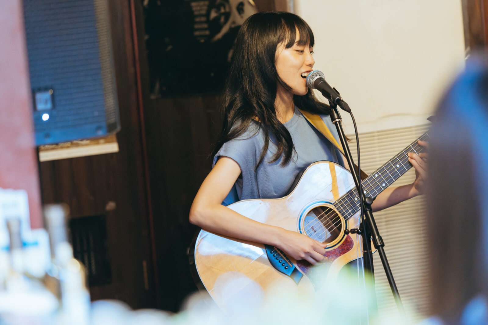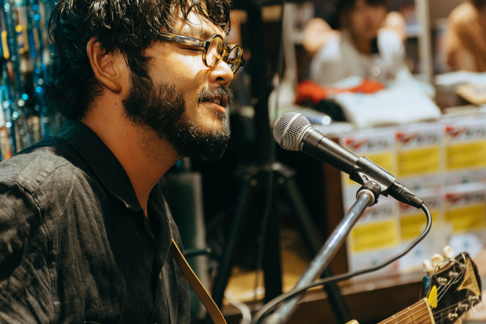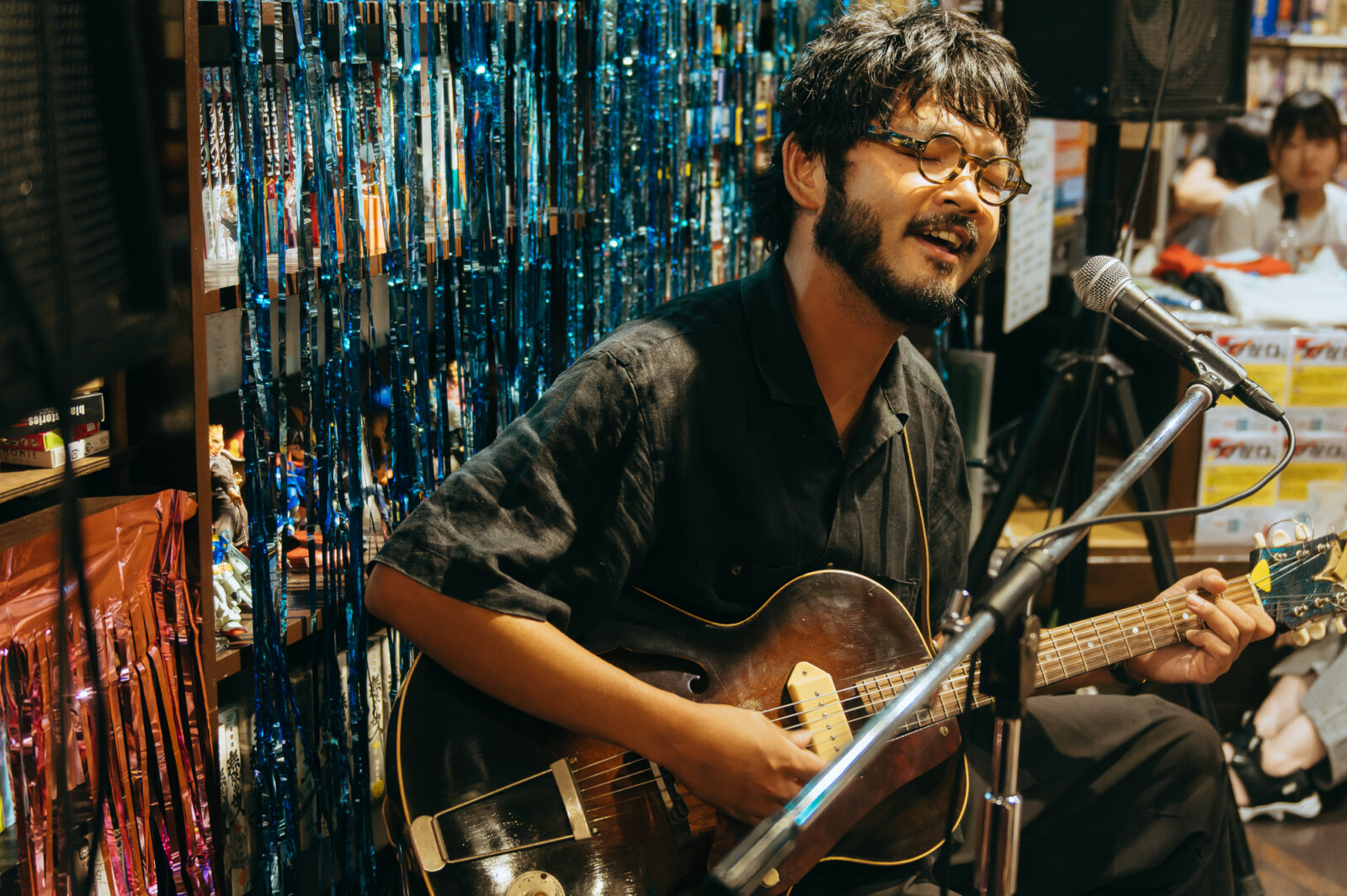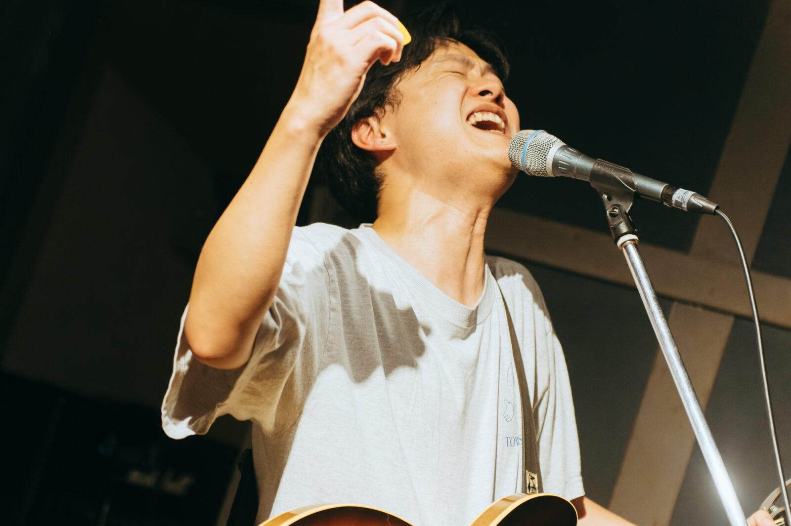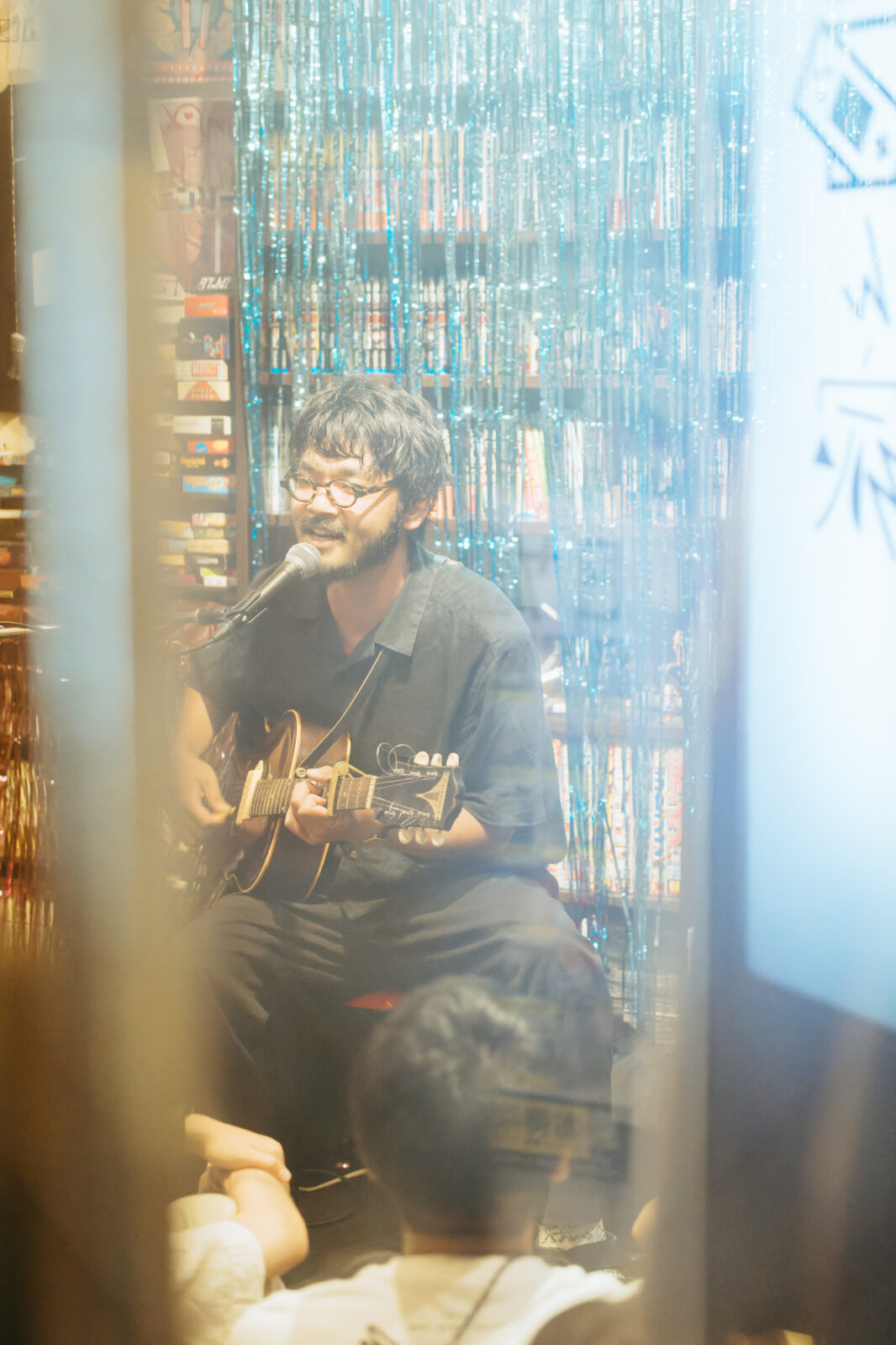 気さくなMCでライブが始まる前から人々を惹きつけ、空気が綻び〈◻︎◻︎◻︎ん家〉のスペースはあっという間に満員になった。その雰囲気のまま、流れるように曲へ入る谷澤。声の揺らぎとアコースティックギターの響きが牧歌的な風情を生み出す。“悲しみひとつ”では、情感たっぷりに生み出される声の波で強弱をつけながら、「悲しみの表現」と「寄り添う包容力」の両方を実現させていた。“店”は、愛媛、長崎、高知、などの地名が次々に挙がる楽曲。