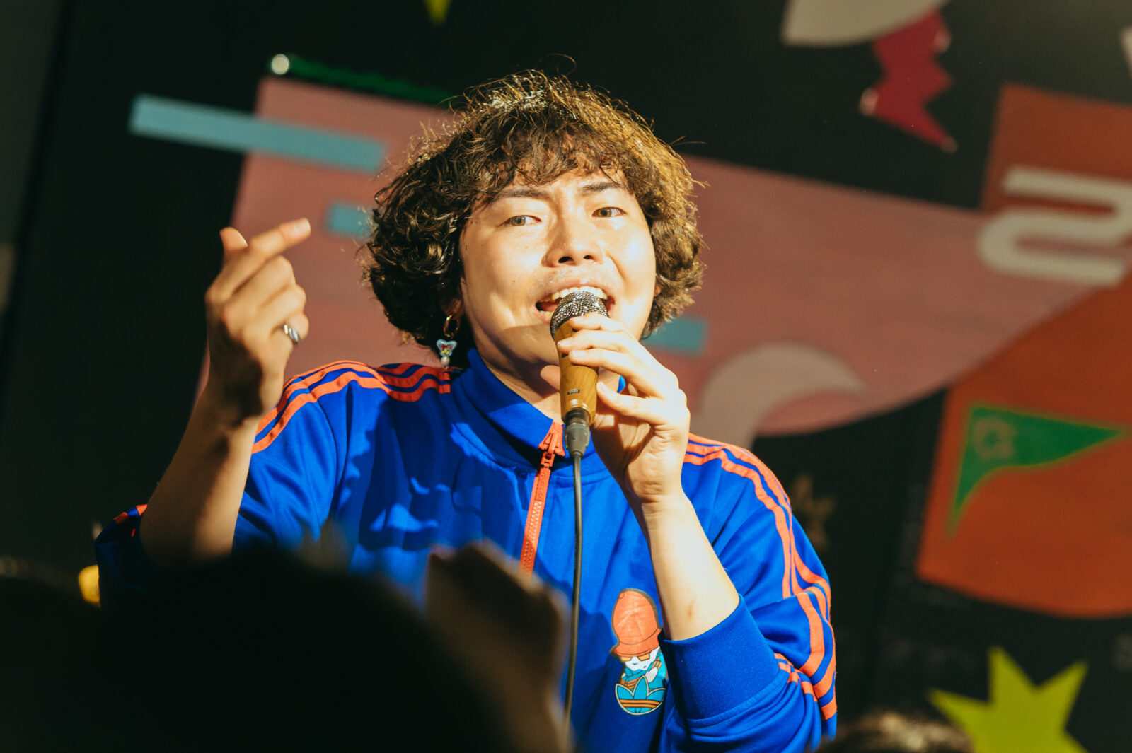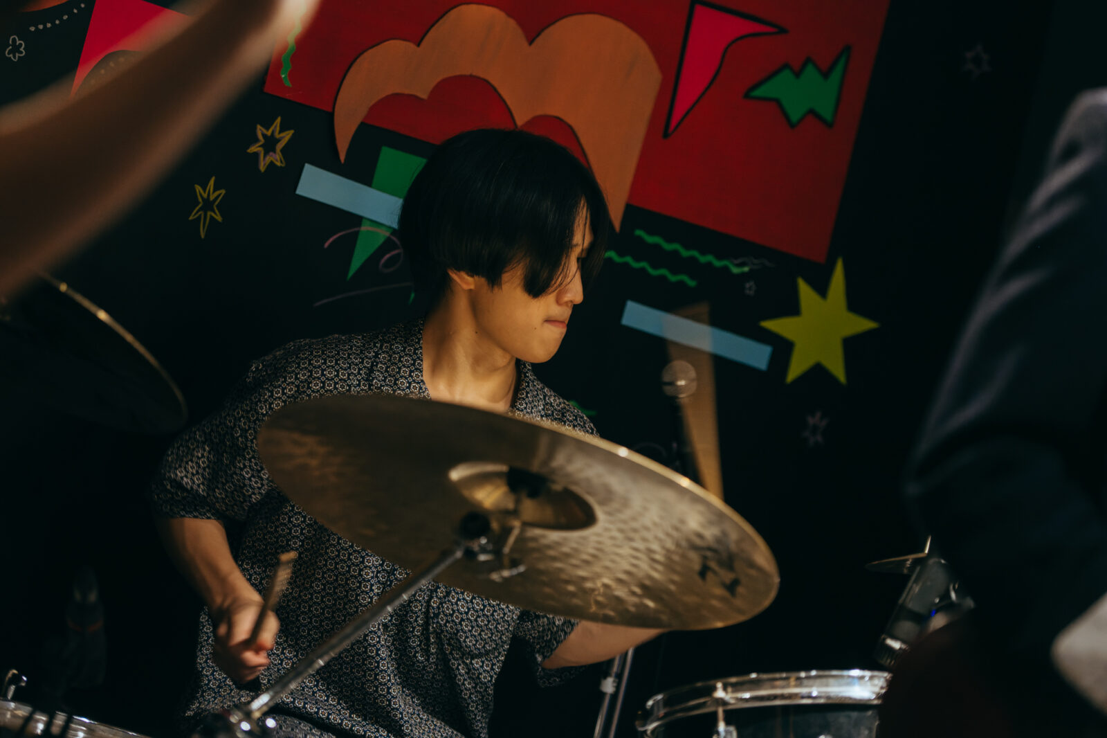 〈◻︎◻︎◻︎ん家〉のカウンターで少し休憩していると、左脚にギプスを付けたシンガーソングライター、谷澤ウッドストックがステージに登場。拾得からの帰り道、堀川を飛び越えようとして怪我をしたのだという。近しい人たちによるものだろうか、たくさんの絵や言葉が書かれたギプスからは、谷澤自身の人望や彼の周りの人たちの温もりが伝わってくるようだ。