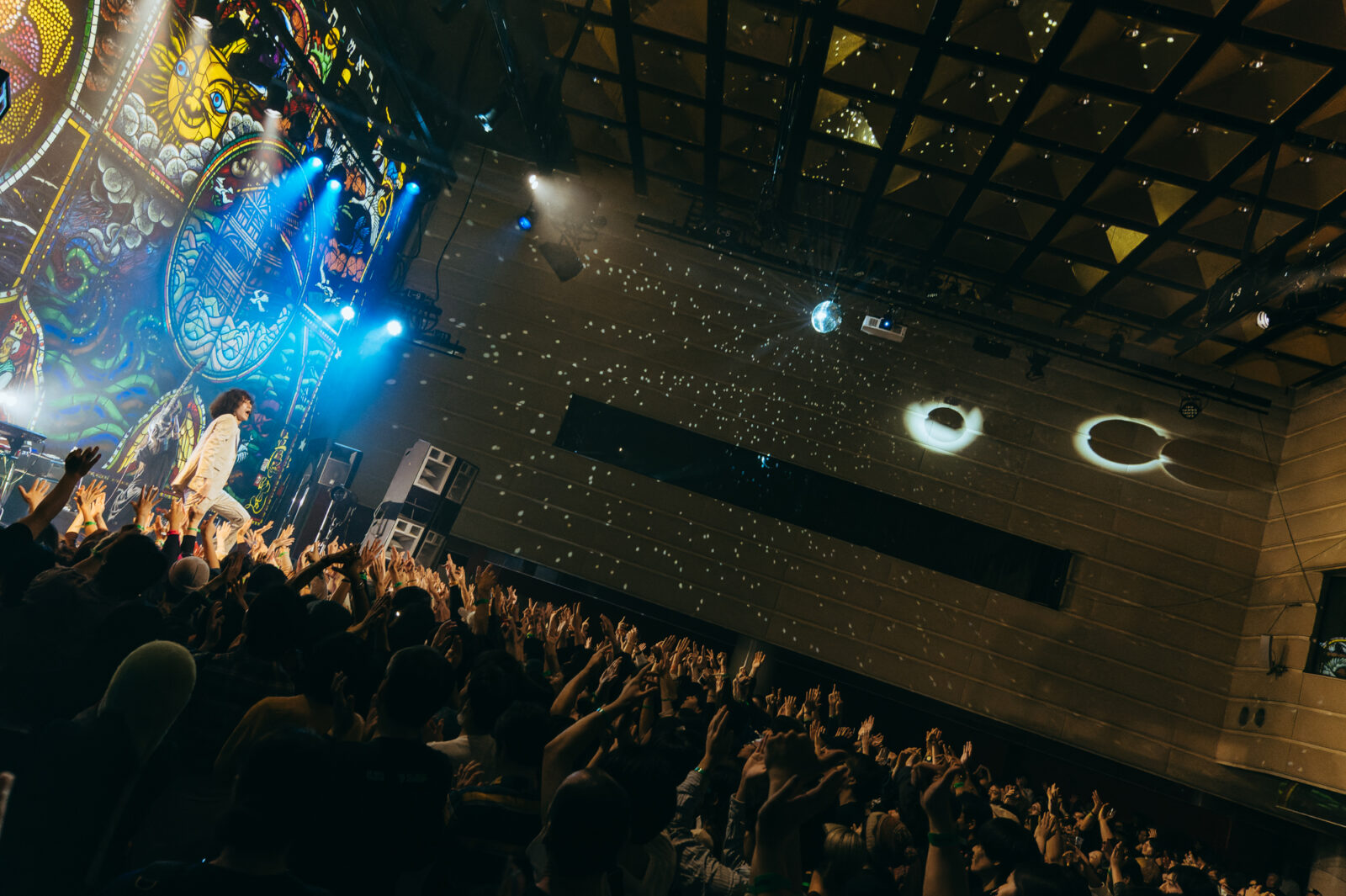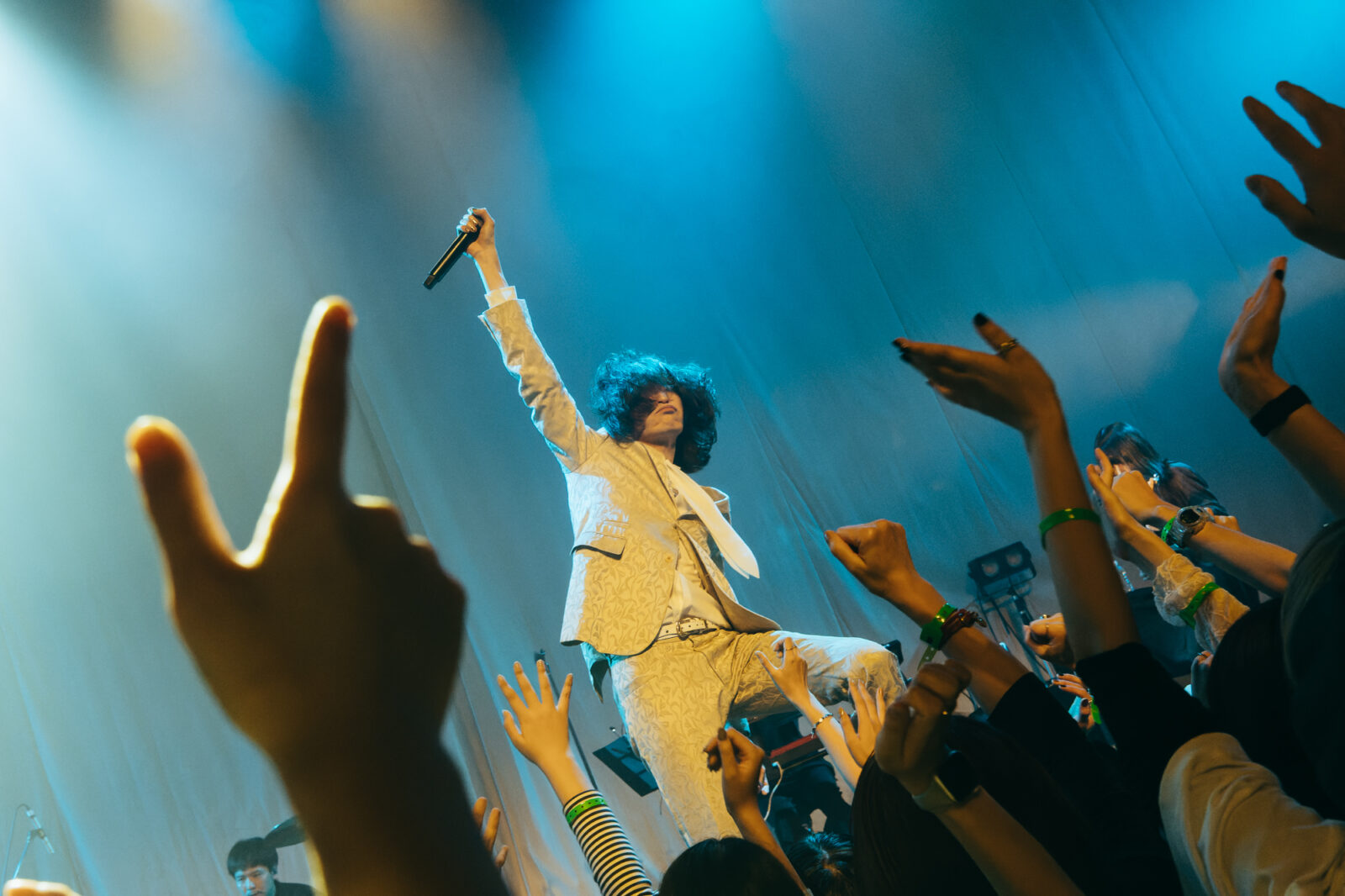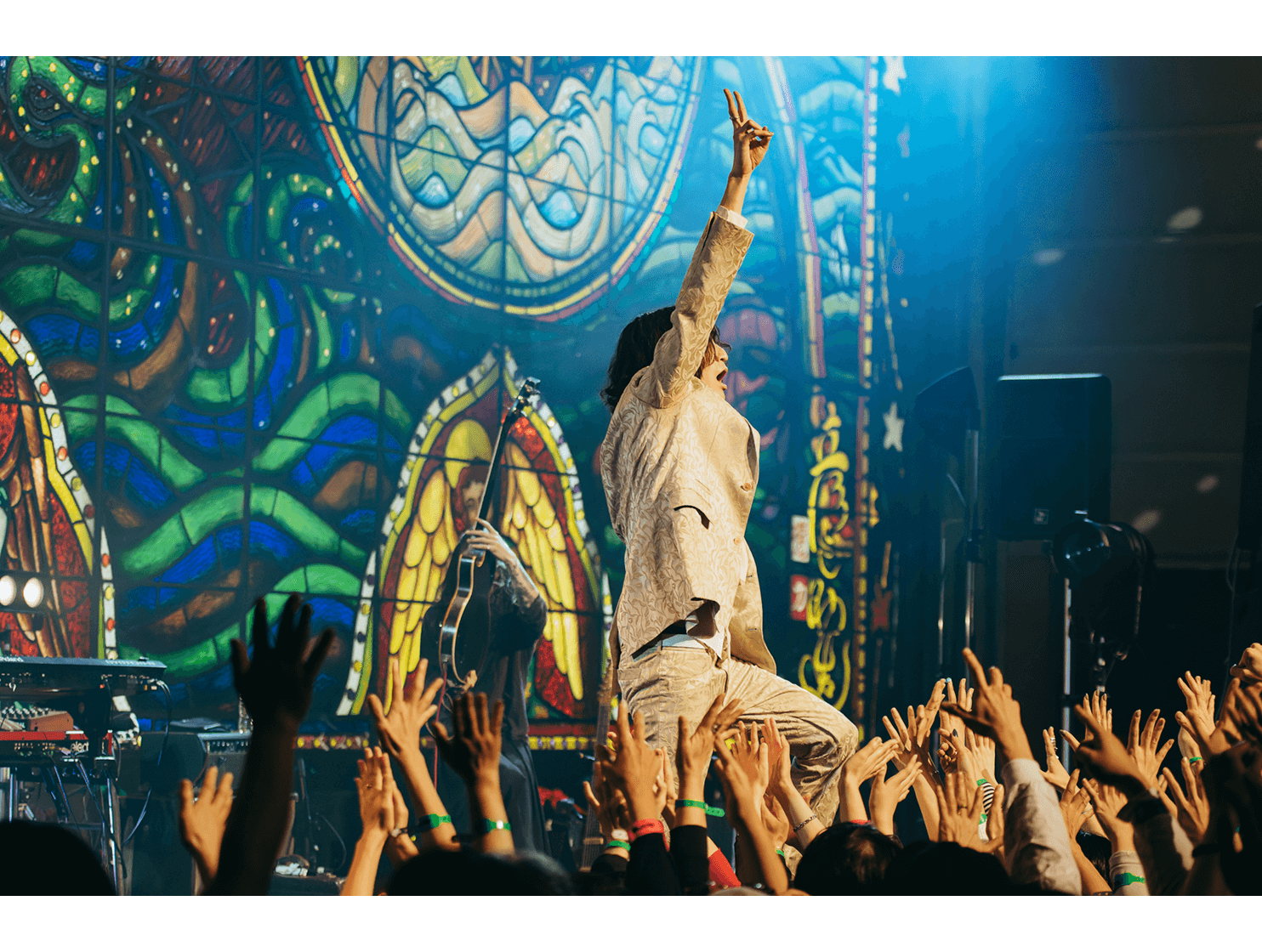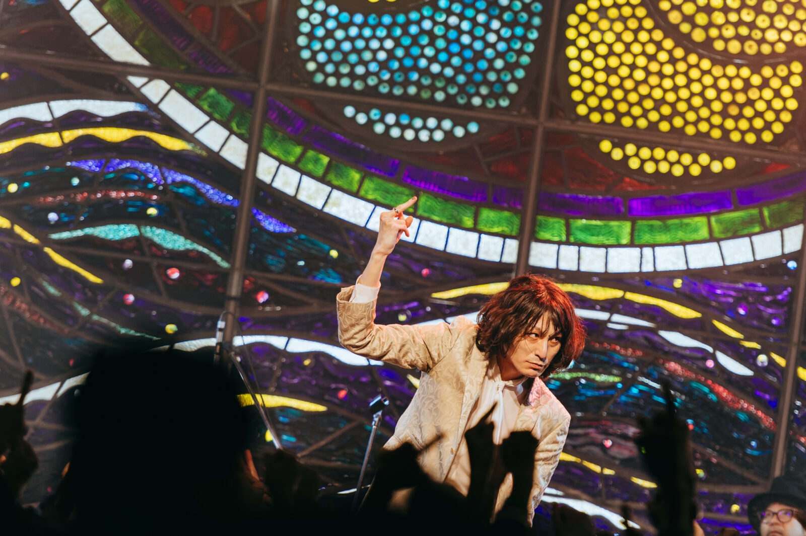 “愛に気をつけてね”では、〈KBSホール〉のステンドグラスが開帳。中指を立てて「嫌い!嫌い!」と叫ぶ志磨の表情、長身を操って激しく踊る姿は、泥臭くアグレッシヴなロックスター。人々に手を差し伸べる唯一無二の神様だと思った。一方、志磨は自らを「ペテン師」と称することがある。それでもドレスコーズに惹き付けられ、多くの人々が顔を上に向けているこの景色は、紛れもない真実である。この日のステンドグラスの前には、神様のように眩しいけれど、人間の痛みを知る美しきロックンローラーが立っていた。