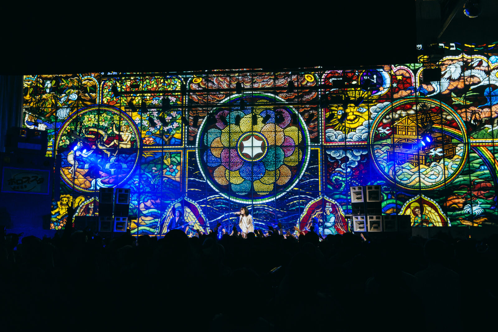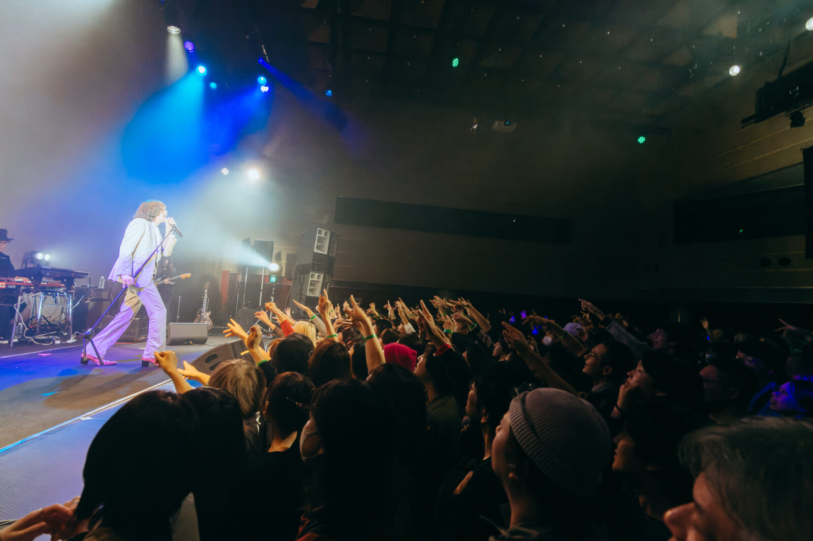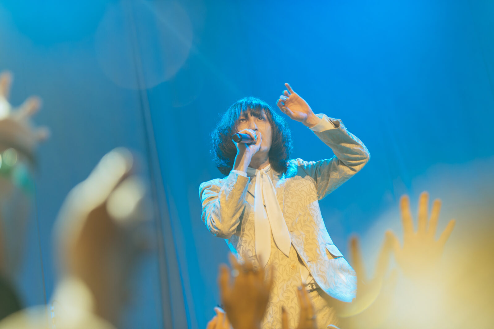 “愛に気をつけてね”では、〈KBSホール〉のステンドグラスが開帳。中指を立てて「嫌い!嫌い!」と叫ぶ志磨の表情、長身を操って激しく踊る姿は、泥臭くアグレッシヴなロックスター。人々に手を差し伸べる唯一無二の神様だと思った。一方、志磨は自らを「ペテン師」と称することがある。それでもドレスコーズに惹き付けられ、多くの人々が顔を上に向けているこの景色は、紛れもない真実である。この日のステンドグラスの前には、神様のように眩しいけれど、人間の痛みを知る美しきロックンローラーが立っていた。