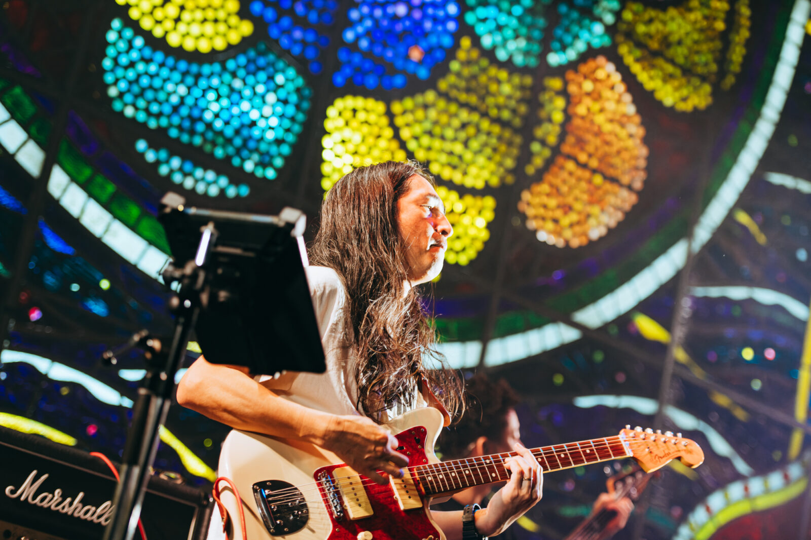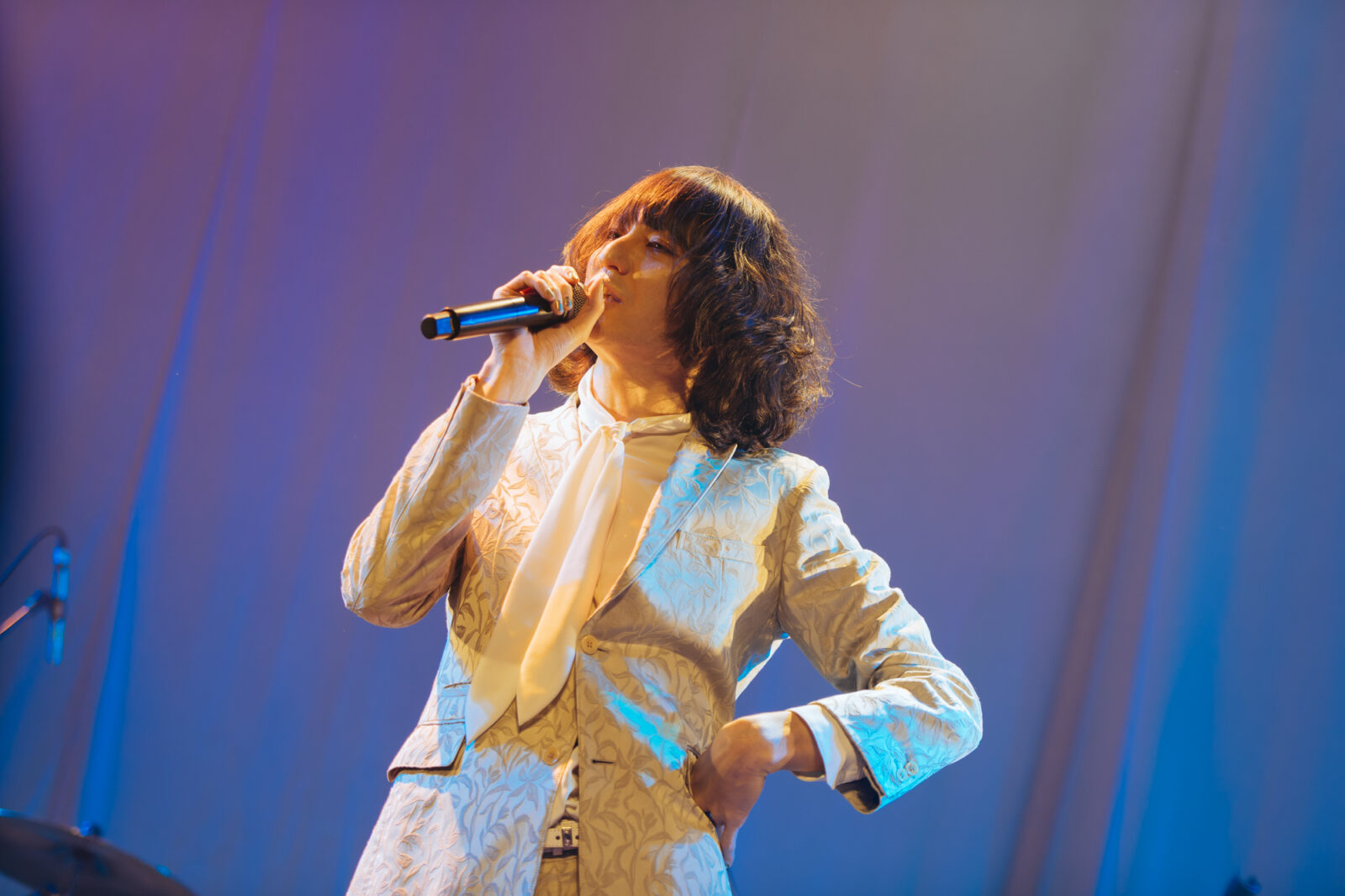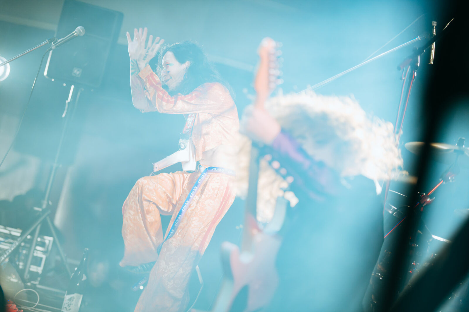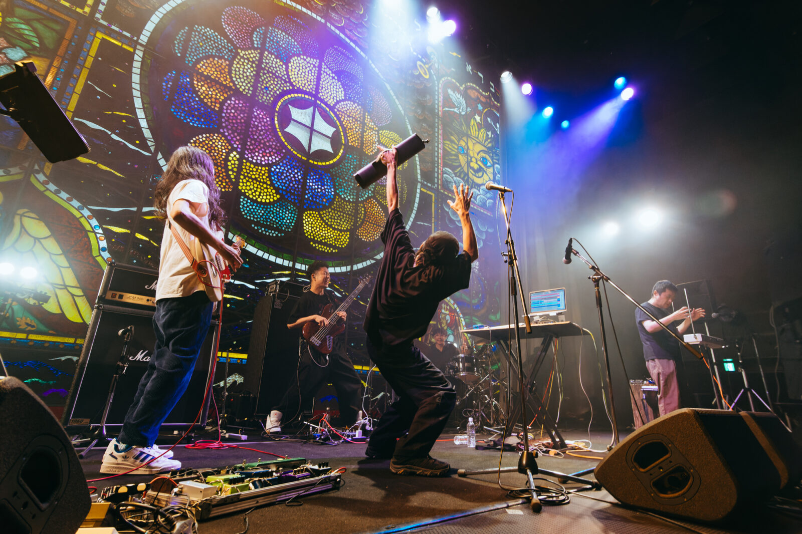 “愛に気をつけてね”では、〈KBSホール〉のステンドグラスが開帳。中指を立てて「嫌い!嫌い!」と叫ぶ志磨の表情、長身を操って激しく踊る姿は、泥臭くアグレッシヴなロックスター。人々に手を差し伸べる唯一無二の神様だと思った。一方、志磨は自らを「ペテン師」と称することがある。それでもドレスコーズに惹き付けられ、多くの人々が顔を上に向けているこの景色は、紛れもない真実である。この日のステンドグラスの前には、神様のように眩しいけれど、人間の痛みを知る美しきロックンローラーが立っていた。