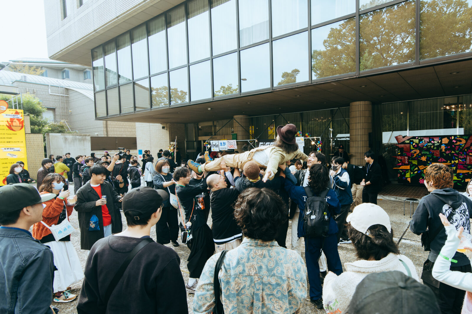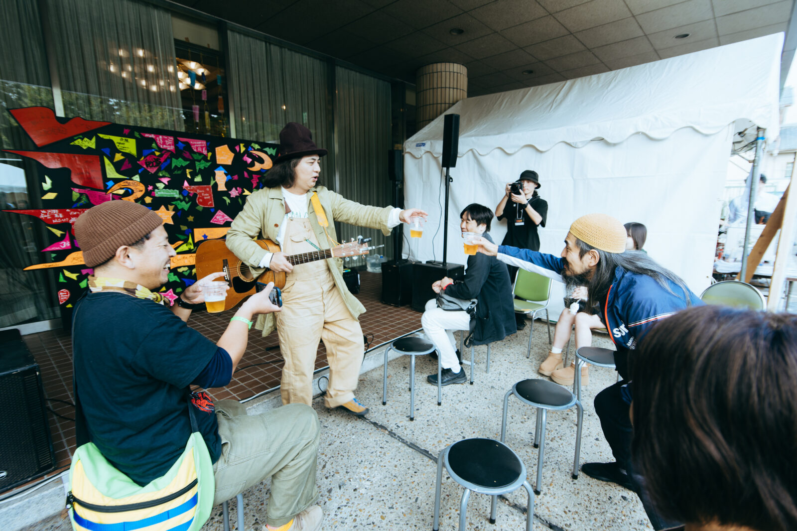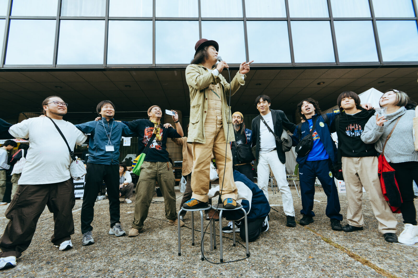 〈KBSホール〉の正門から敷地内へ入った瞬間、楽しそうな笑い声や軽快なアコースティックギターの音が聞こえてきた。その賑やかさに吸い寄せられて辿りついたのは、前日にゴリラ祭ーズが演奏していた野外ステージ。例年〈どすこいSTAGE〉に出演しているボギーが歌っている。“乾杯は何度でも”を歌いながら、観客とビールで乾杯!直後、ボギーを先頭に、見ず知らずの観客たちと列を連ね、目が回るくらいにぐるぐると回る。毎年トリに近い夜に見ている景色が、明るい太陽の下で繰り広げられていると、不思議な気持ちになる。まるで朝からジャンクフードを食べているような罪悪感が逆に愛おしくなってきた。そしてボギーは、丸椅子を2つ横並びにしてスタンバイ。その場にいる人々を集められるだけ集めて、輪になって隣同士で肩を組むように促した。これってまさか?椅子の上に立ったボギーは、武田鉄矢のモノマネで「『ボロフェスタ』は、バカチンの集まりですから!」と言う。待ってました!お馴染み海援隊“贈る言葉”のオマージュ・パフォーマンス。組まれた円陣から、ボギーと観客たちの大合唱が響く。そしてこれまた定番の観客による胴上げでボギーは宙を舞った。