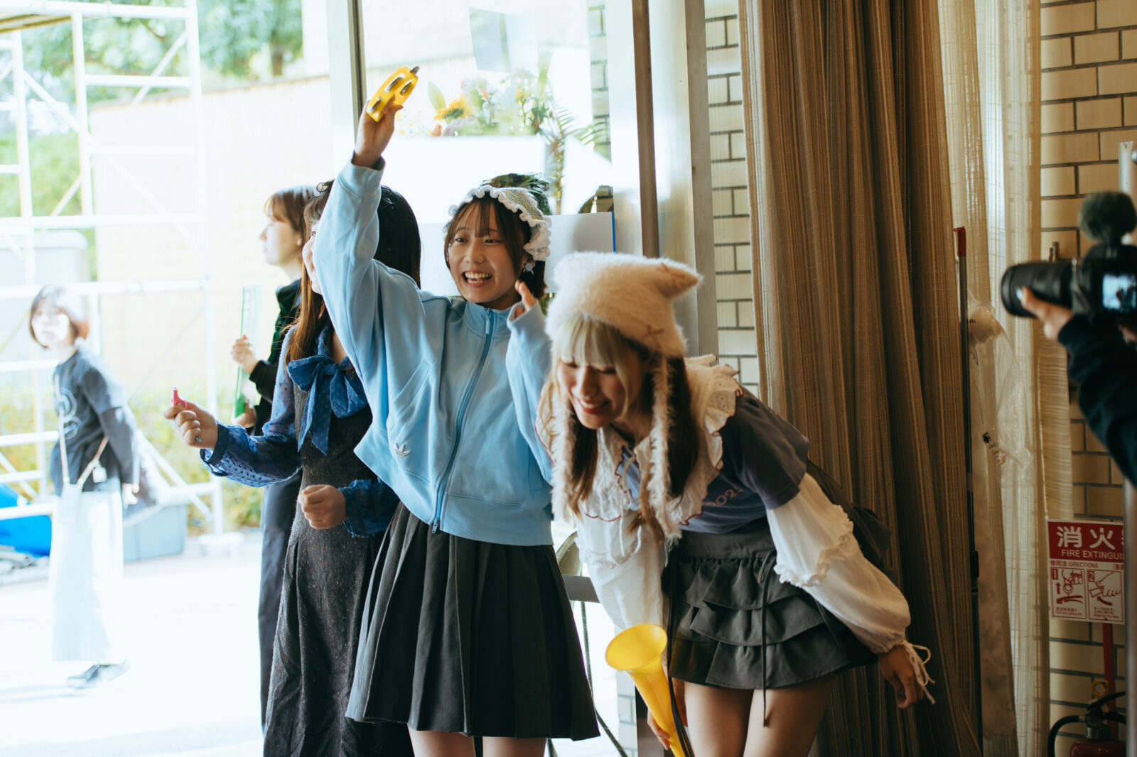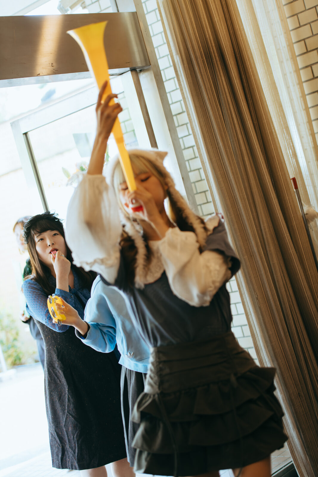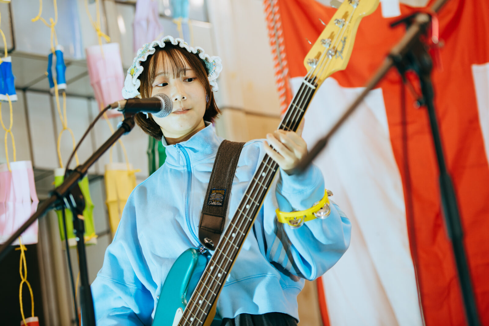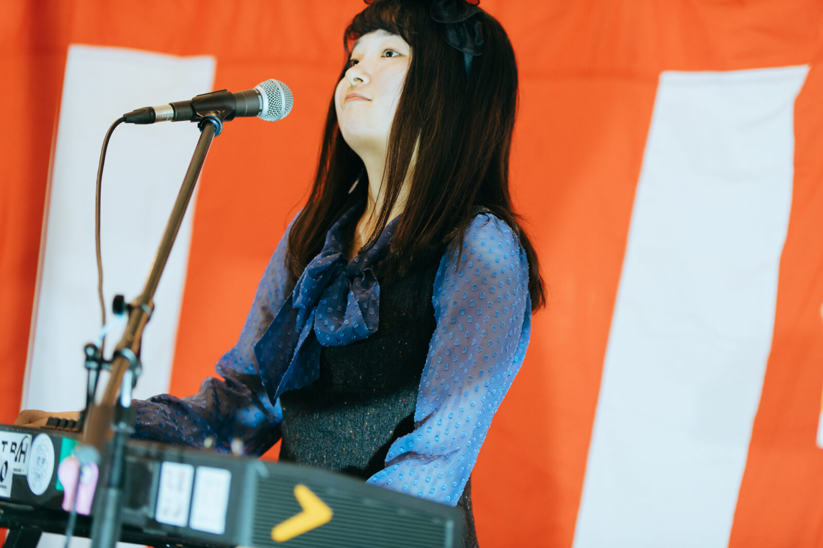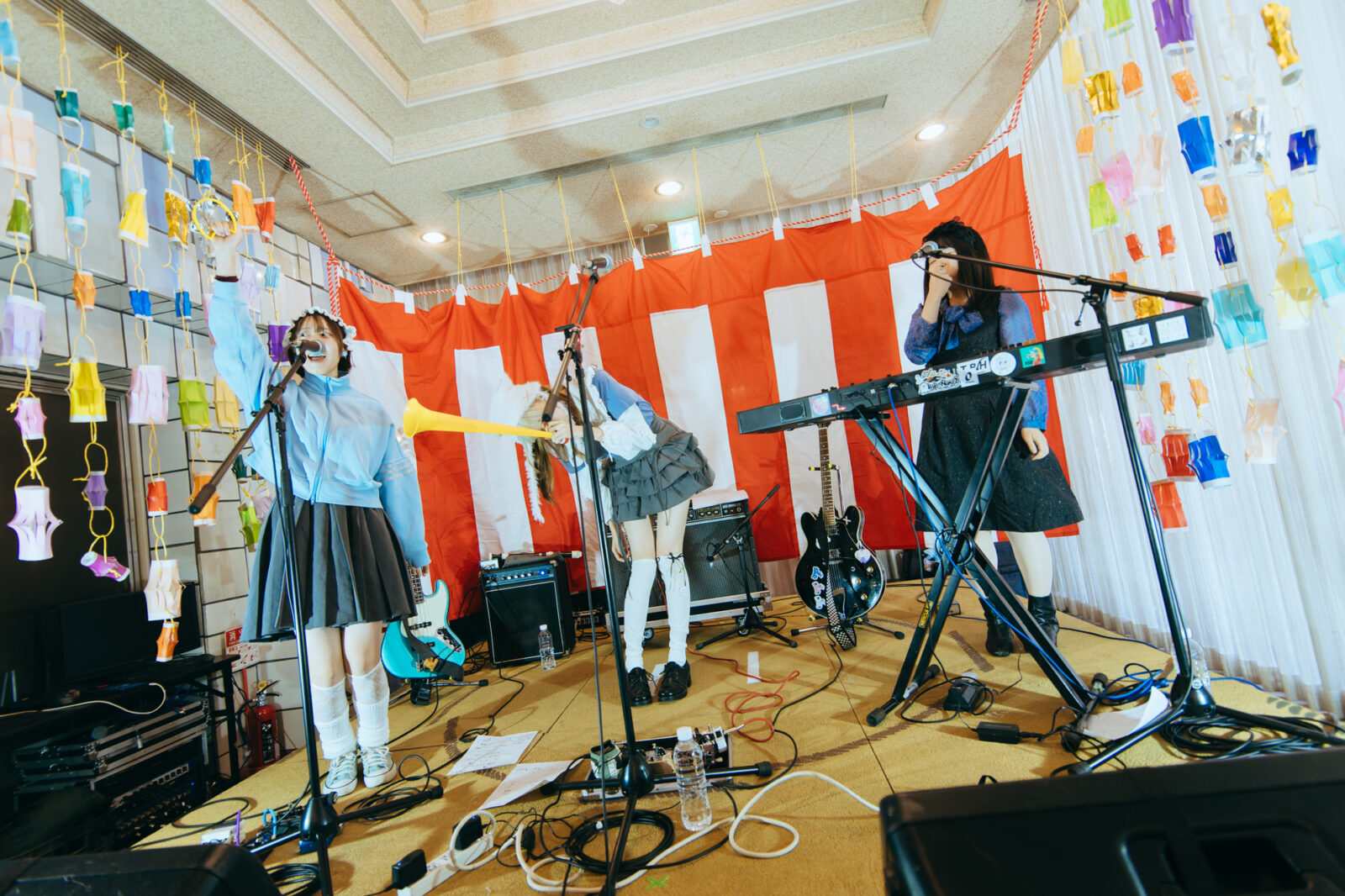 元気な掛け声が〈KBSホール〉の出入口から聞こえてきたかと思えば、あさひ(Gt / Vo)のブブゼラの音が大きく鳴り響く。続いてやは(Ba)がタンバリン、ひさか(Key)がホイッスルを鳴らしながら登場し、既に多くの観客が待ち構えたフロアを通って〈どすこいSTAGE〉へ。今年は『ナノボロ』に引き続き、ドラムレスでときめきポメラニアンが『ボロフェスタ』に初出演だ。しかし実はあさひは、2022年と2024年に岡山在住のアーティスト、やっほーのメンバーとして〈どすこいSTAGE〉に出演経験がある。この時も、ブブゼラを大きく吹き鳴らす場面があり、あさひの積み重ねた時間を繋げるような登場の仕方に胸が熱くなった。