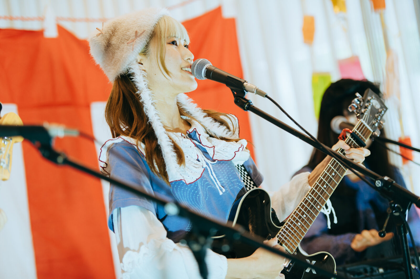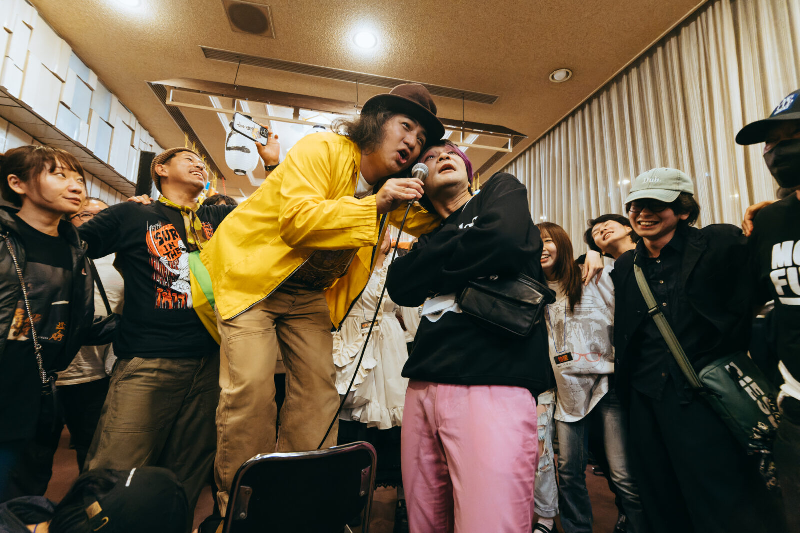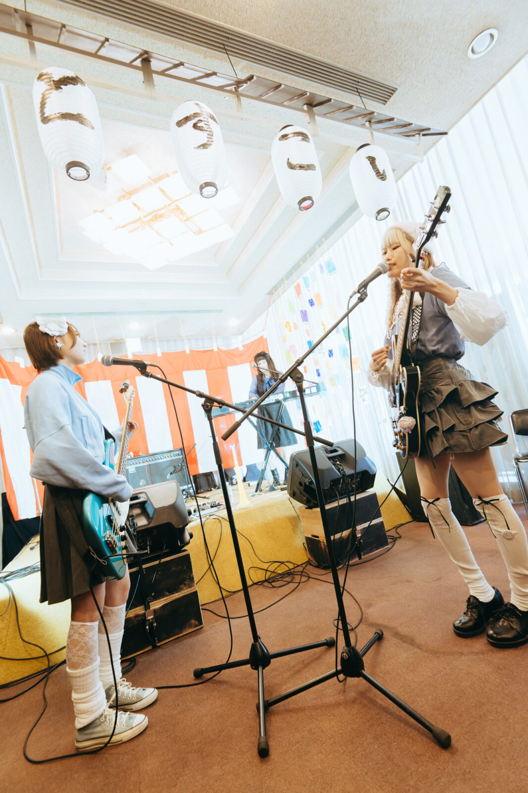 ときめきポメラニアンは、この日のタイムテーブルが決まった時から悩んでいたそうだ。自分たちの裏では〈BIG LEFT STAGE〉で幽体コミュニケーションズが、直後には〈BIG RIGHT STAGE〉で浪漫革命がライブをすることになる。キャリアを積んだ人気者に挟まれた状態で、ホールに入る途中に設営された〈どすこいSTAGE〉に、どうすればたくさんの人に立ち止まってもらえるか。考え抜いた結果、楽器を大きく鳴らしながらの入場や、フロアで地図を書いて配ること、ステージを降りて向かい合って演奏することにしたという。観客と一緒になって楽しむステージングで、最後まで多くの観客で賑わっていた。