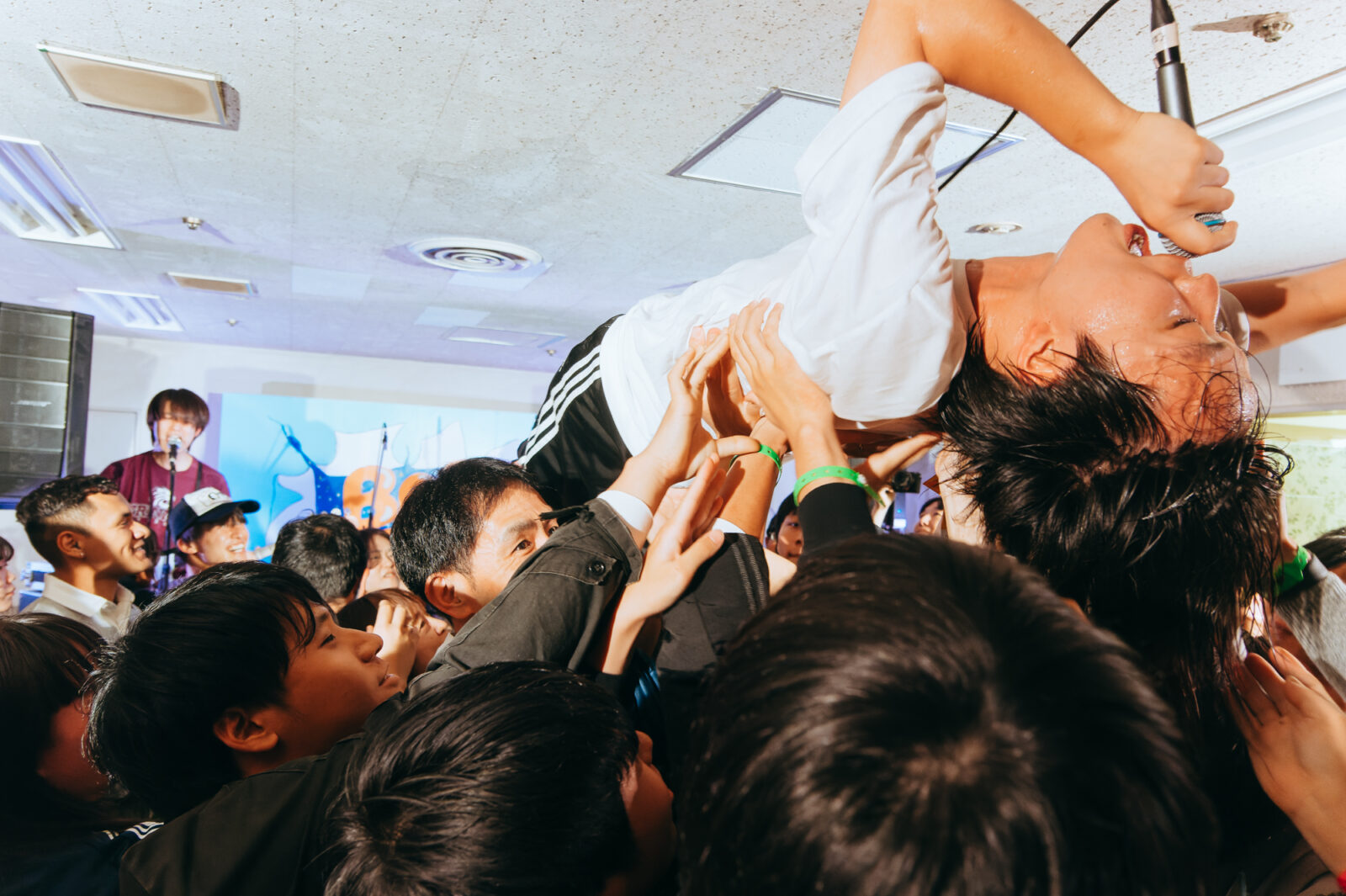 と叫ぶボギーは、独特なドンルク音頭で再び観客に笑顔を咲かせた。続けて“バカになりましょう”を始めると「バカの人、立ち上がって!」と座らせていた観客を全員立たせて自らもフロアへ。朝のステージから変わらぬエネルギッシュさとユーモアに、ロビーで物販をしていたスタッフや出演バンドも笑いが堪えきれない様子だった。