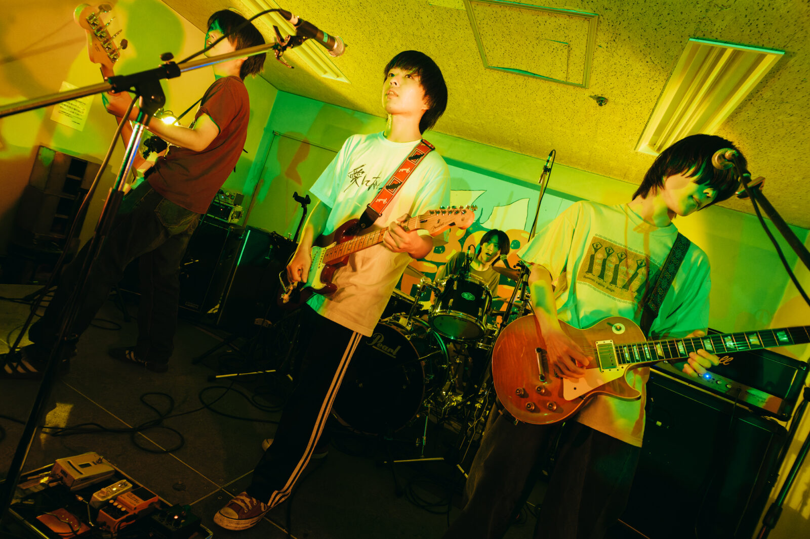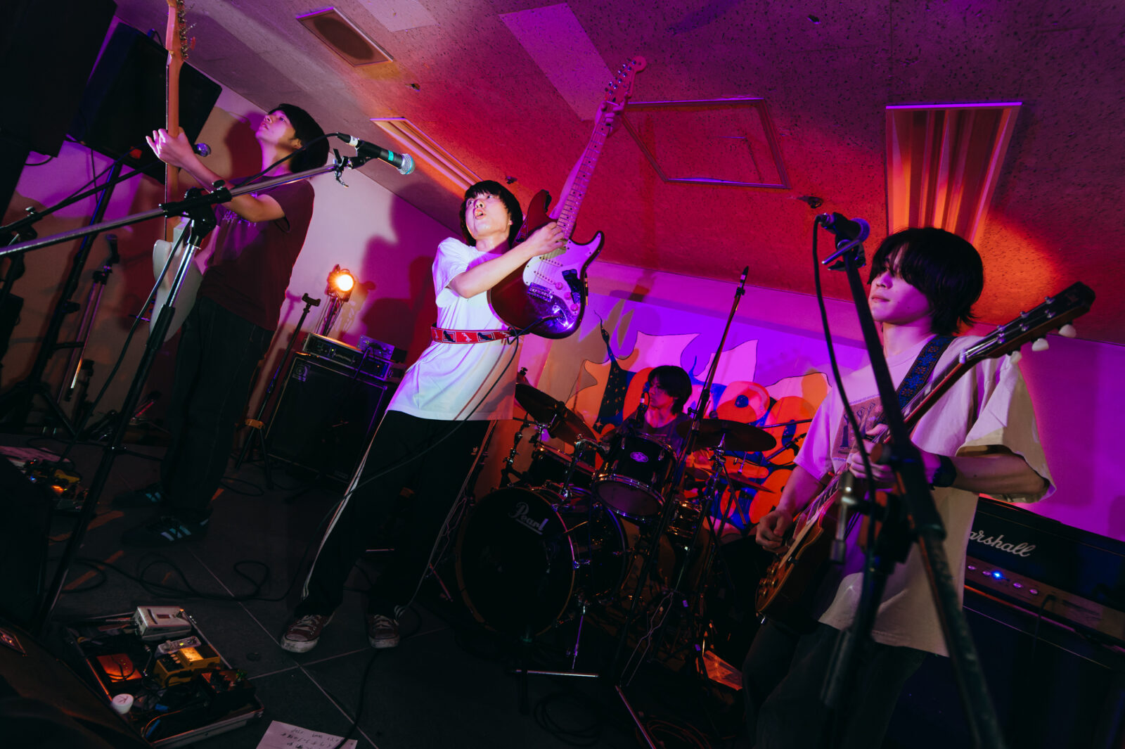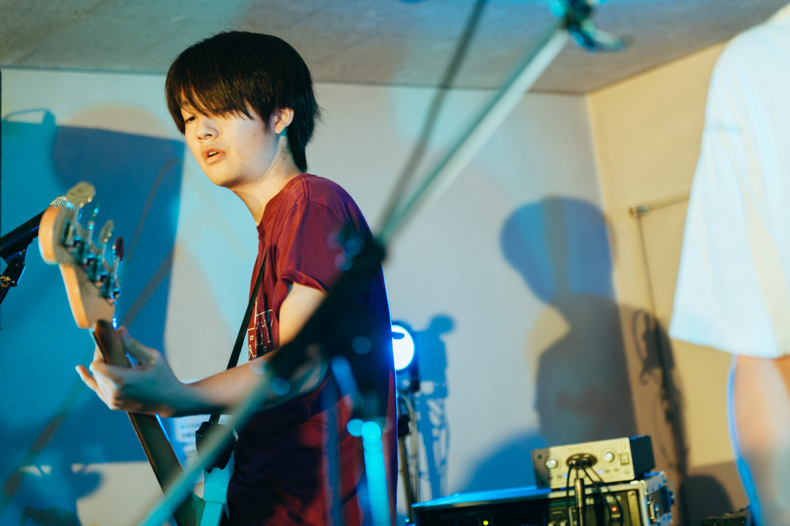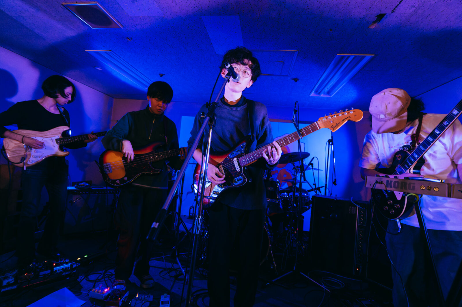 サポートドラマー、東克幸のビートで曲間を繋ぐと、そこへオーガキのベースが重なり、オオスカが「おい京都!」と煽る。こうして地下にこもる熱い温度を保ったまま始まったのは“step by step”。繰り返すベースラインの中毒性、オオスカとオーガキの絶妙な声のハーモニーは、我々観客をさらに音楽の渦へ飲み込んでいく。再びボーカルがオーガキへと戻り、“さまpake”へ。「サンデー癒しの湖に飛び込んでしまえば良いよ サンデー昼下がりくらい甘味を食べてしまえば良いよ」と繰り返す芯のある歌声に、繊細さを孕んだ美しいギターサウンドが並走し始めた。……かと思えば、オオスカの弾く音にどんどん鋭さが増していく。変化に富む演奏に魅了されつつ、音楽の化身のようなNikoんの姿に畏怖の感情さえ湧いてくる。