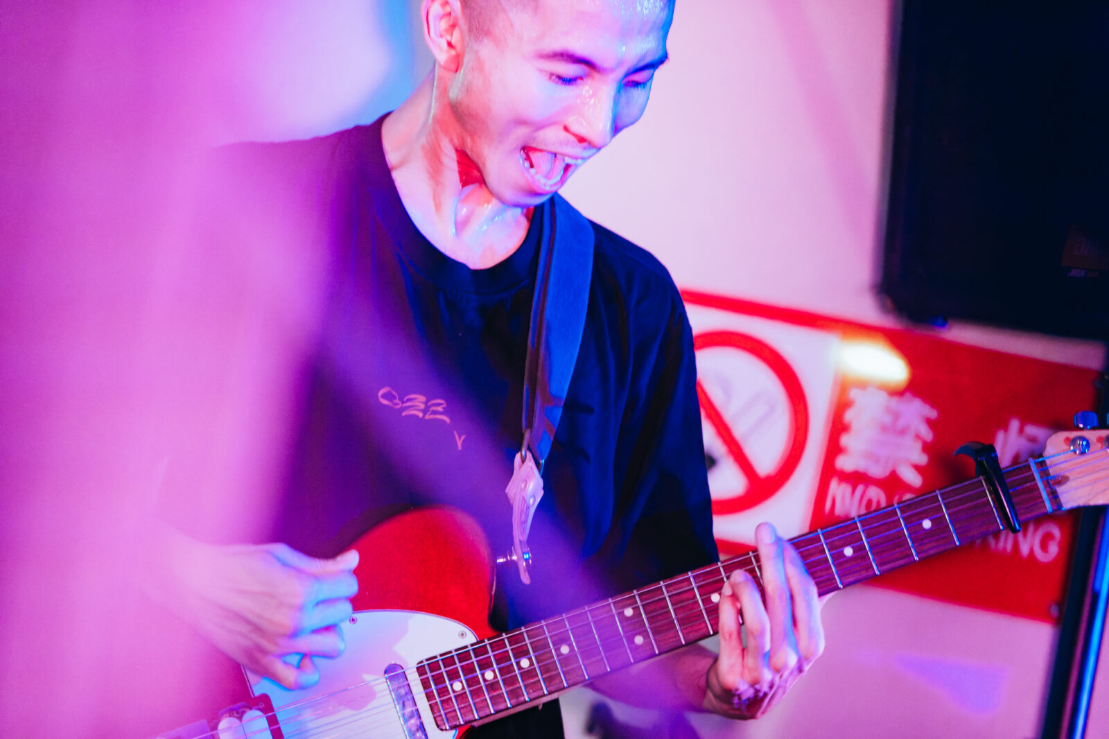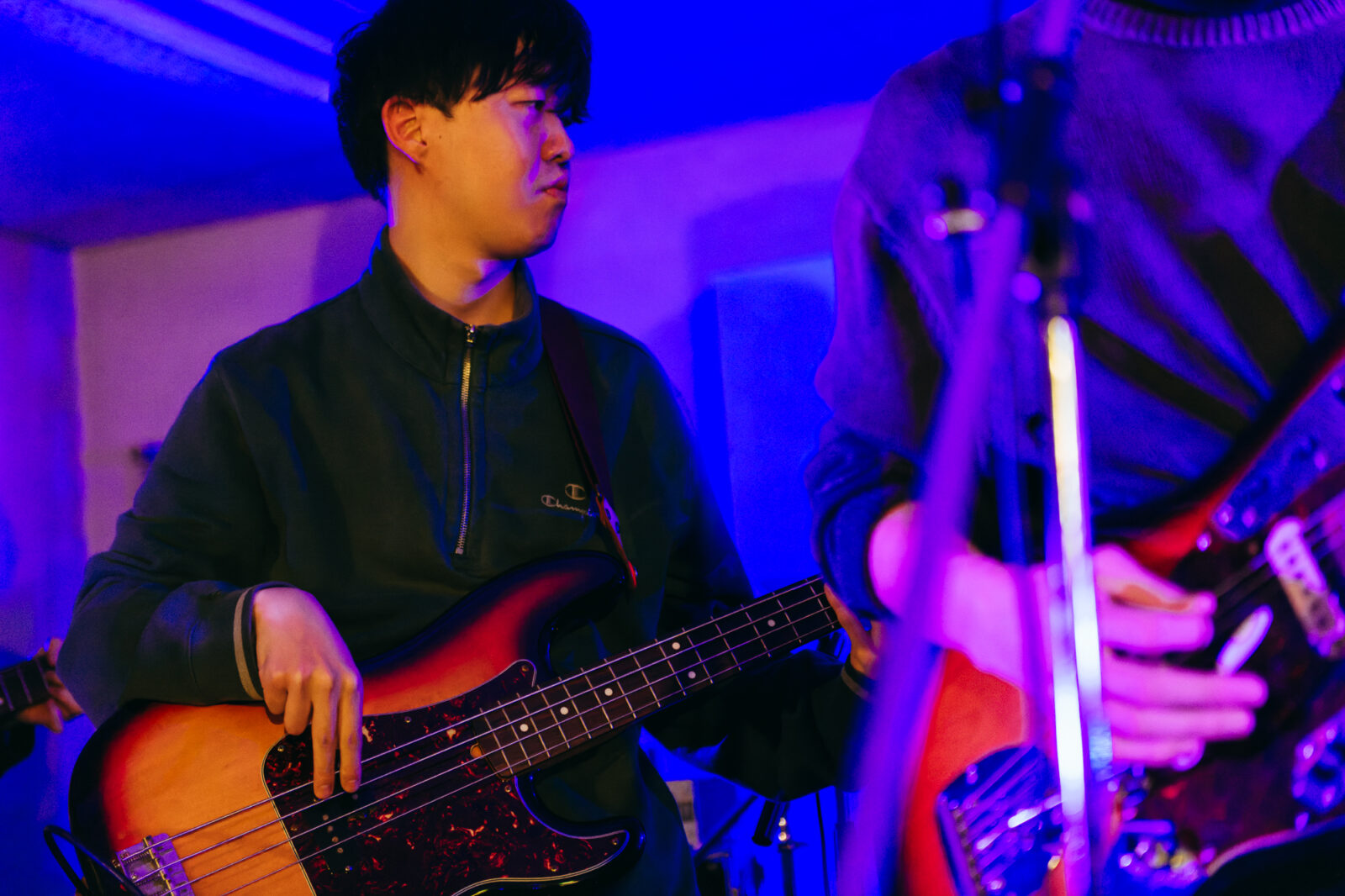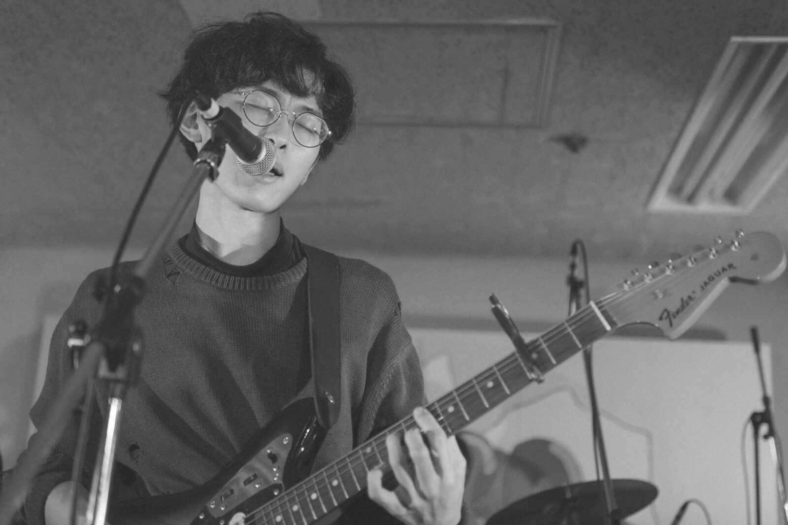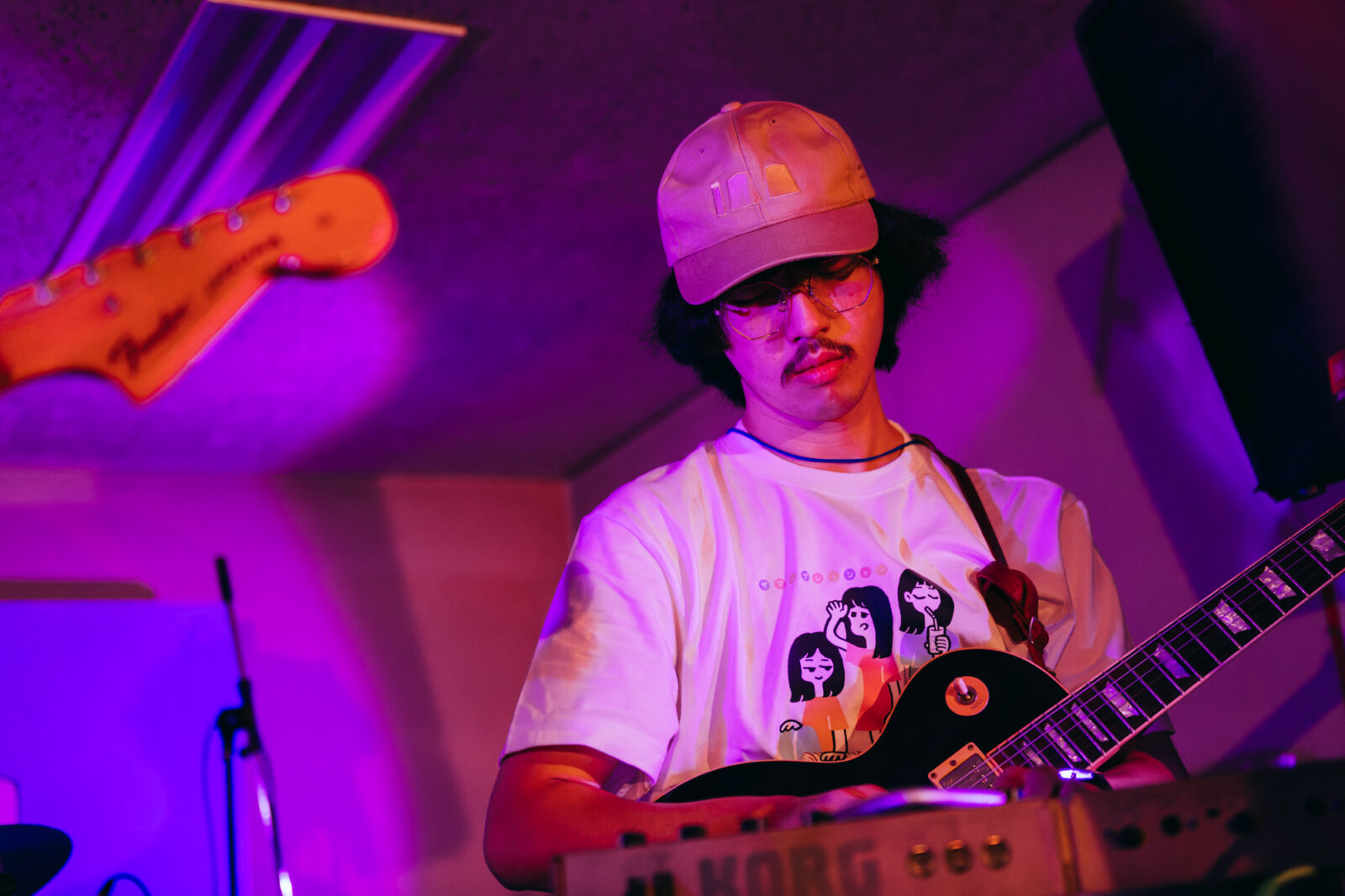 サポートドラマー、東克幸のビートで曲間を繋ぐと、そこへオーガキのベースが重なり、オオスカが「おい京都!」と煽る。こうして地下にこもる熱い温度を保ったまま始まったのは“step by step”。繰り返すベースラインの中毒性、オオスカとオーガキの絶妙な声のハーモニーは、我々観客をさらに音楽の渦へ飲み込んでいく。再びボーカルがオーガキへと戻り、“さまpake”へ。「サンデー癒しの湖に飛び込んでしまえば良いよ サンデー昼下がりくらい甘味を食べてしまえば良いよ」と繰り返す芯のある歌声に、繊細さを孕んだ美しいギターサウンドが並走し始めた。……かと思えば、オオスカの弾く音にどんどん鋭さが増していく。変化に富む演奏に魅了されつつ、音楽の化身のようなNikoんの姿に畏怖の感情さえ湧いてくる。