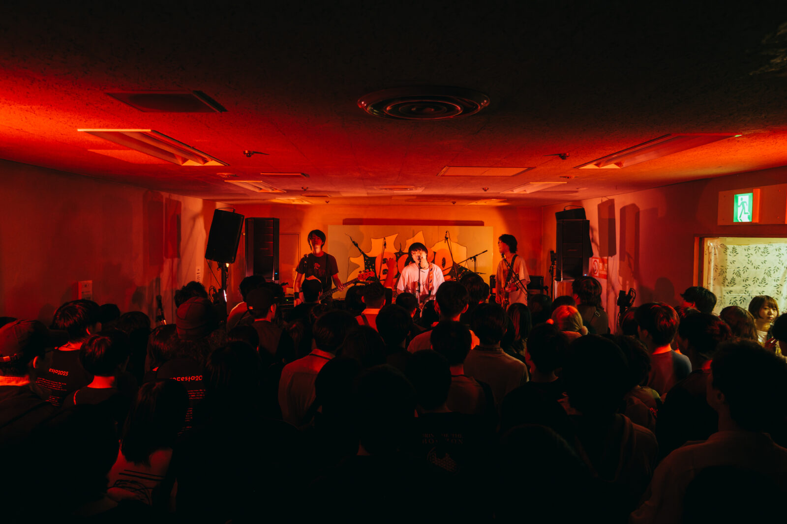 新曲“地図を作る”では、突如あさひがマイクと数枚の紙を持ってフロアへ降りてきて、ペンで地図を描き始めた。同時にステージでは、やはが渋いベースラインを繰り返し弾き続ける。完成した地図を観客に配り、ステージへ戻るという独特の流れに飲まれたフロアは、もう彼女たちから目を離せない様子。続く“ミルメークロック”では「ちょっとお客さんから遠いし……」などと言いながら、あさひとやはがステージ下へ降り、まるで対戦ゲームのように向かい合って演奏を始めた。ボギーをはじめ、よさこいマンやクリトリックリスなど、例年トリッキーな出演者が揃う〈どすこいSTAGE〉だからこそのやりたい放題である。