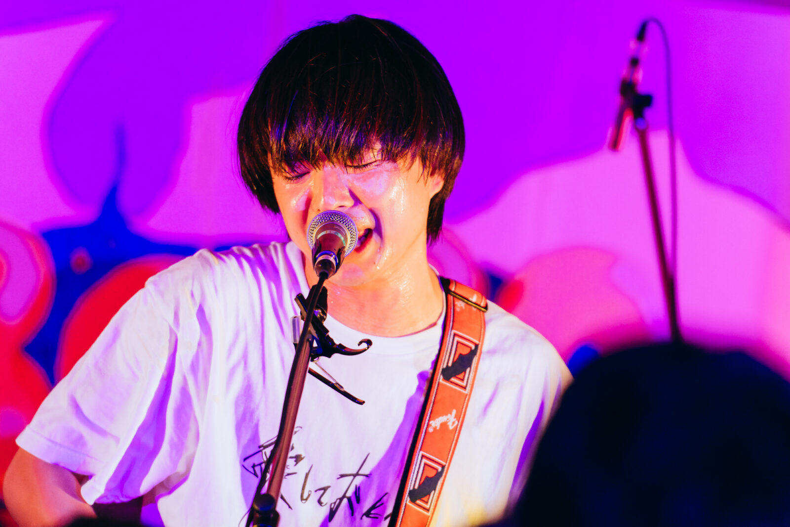 北海道からやってきた5人組バンド、乙女絵画の佐藤嵩飛(Gt / Syn)は、〈どすこいSTAGE〉一番手のときめきポメラニアンを観てひどく感動したという。〈街の底STAGE〉での自らの出番には、ときポメの2ndシングル“サマープレッシャー”のジャケットがあしらわれたTシャツを着用して登場。普段は遠く離れた場所を拠点に活動する若手バンド同士の繋がりが生まれている様子に胸が躍った。