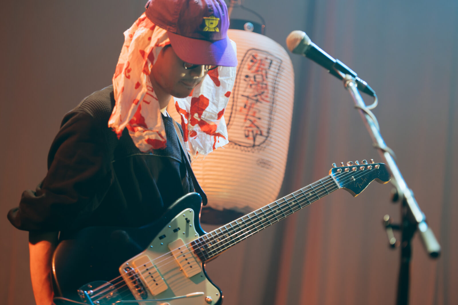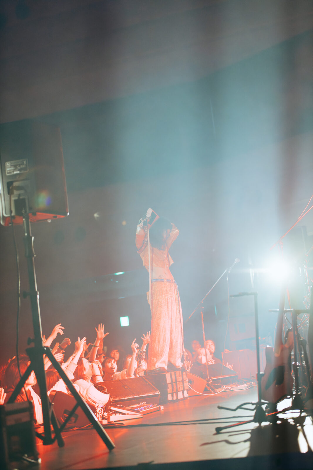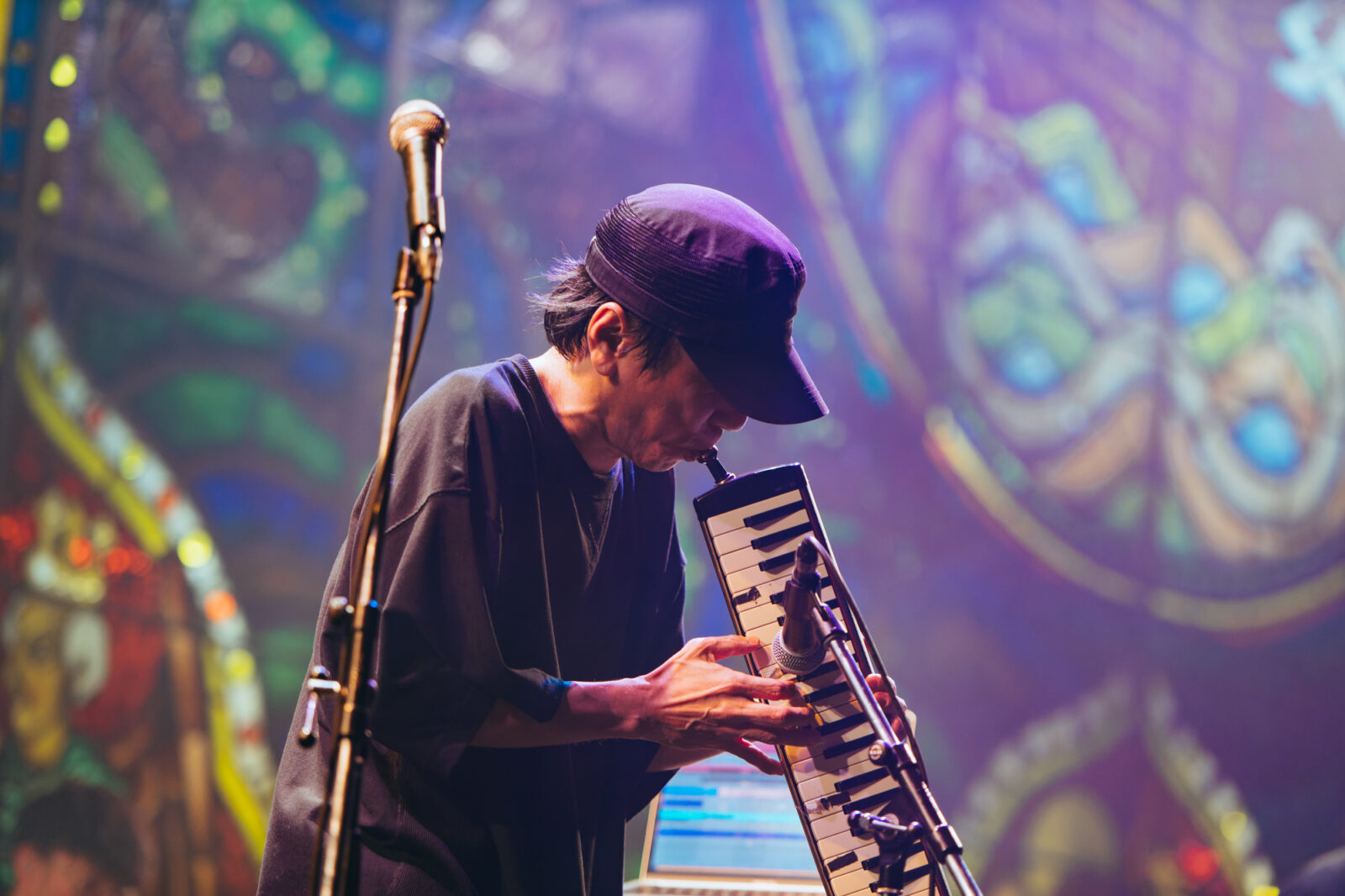 駆け足で地上に上がり〈BIG RIGHT STAGE〉へ向かうと、エレクトロ・ダブバンド、あらかじめ決められた恋人たちへ(通称、あら恋)が、今までに聴いたことがないような独特で幻想的な音楽を奏でていた。1曲目“翌日”の「儀式」や「祈り」に近いような心安らぐ音が、この日のエンドロールのように流れている。続いて、切なくも美しいキーボードの旋律が一節鳴らされると、池永正二(鍵盤ハーモニカ / Track)が「あらかじめ決められた恋人たちです!お願いします!」と一言。すかさずGOTO(Dr)が4カウントを取り、テンポの速いカッティングギターに思わず体が揺れる“Come”が始まった。観客たちは、小気味よく、かつ繊細に紡がれるインストゥルメンタルと溶け合うように踊る。緩やかな鍵盤ハーモニカの音に酔いしれているうちに、再びエレキギターの速弾きに耳を引っ張られ、弾けるドラムロール、そしてまた民族楽器のようなミステリアスさを感じる鍵盤ハーモニカへ……。緩急の激しい展開に振り回される感覚が、逆に心地いい。曲の途中では、今永がマイクに向かって楽器に馴染む声色を吹き込む。ステージ上手には、空中で手を動かすクリテツ。彼が演奏していたのは、バイオリンにも人間の歌声にも似た不思議な音の正体、テルミンという楽器だ。色々な音が重なるたび、少しずつ心と体が軽くなっていく気がした。