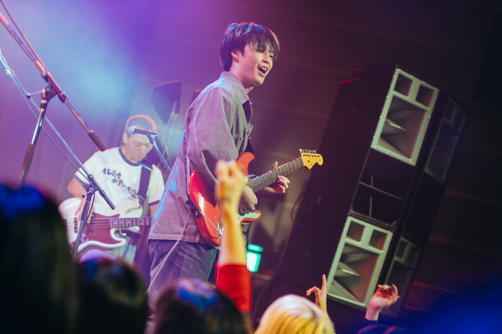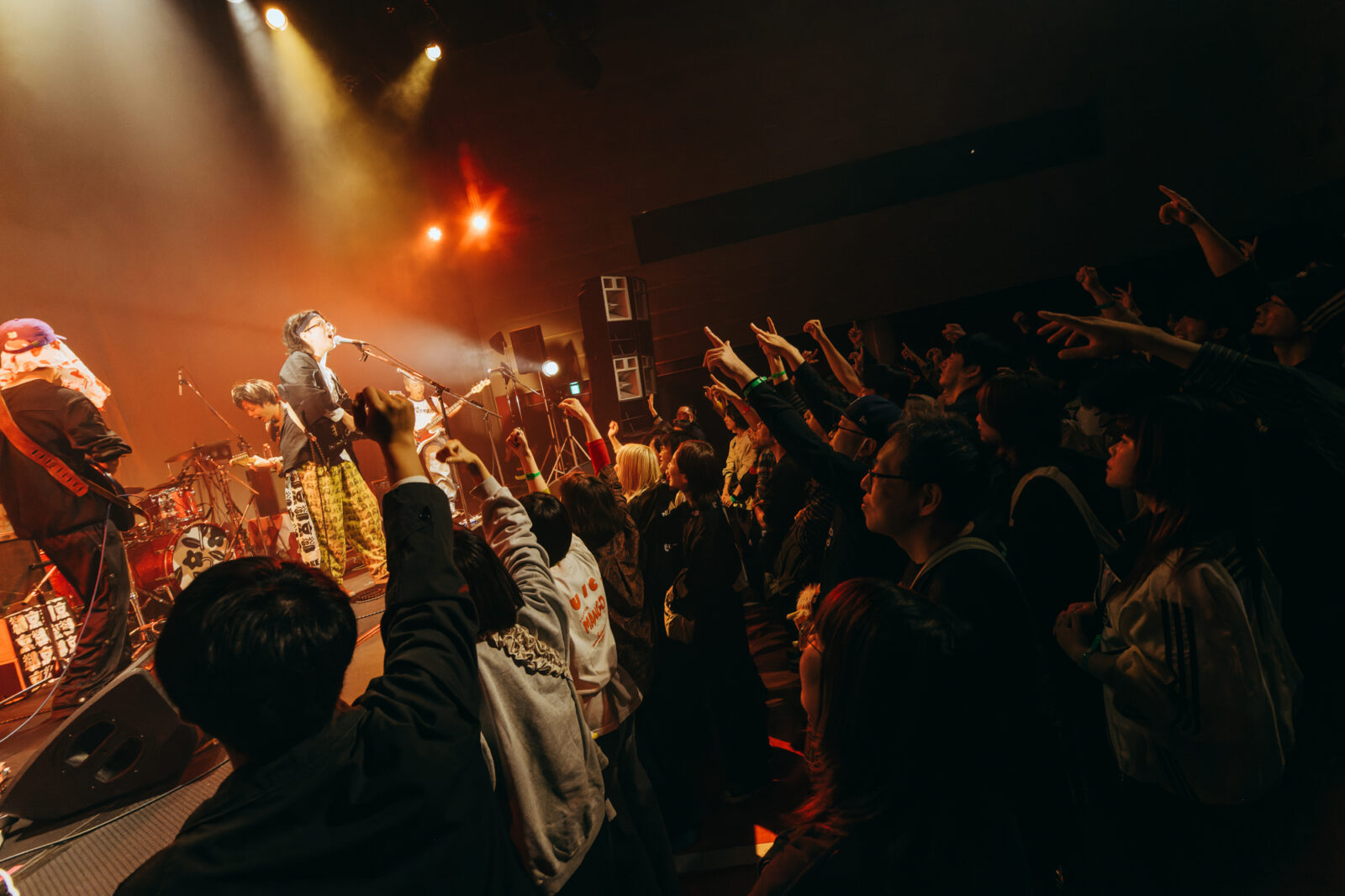 奏太のカウントについて他の3人が「1、2、3、4!」と叫び、ユウタロウとタカノが前に出てきて観客の目と鼻の先でイントロを掻き鳴らす。シンプルだがこの曲の猛々しい推進力を支えるユウタロウのベースが、胸の内側をグッと揺らすように響いてきた。