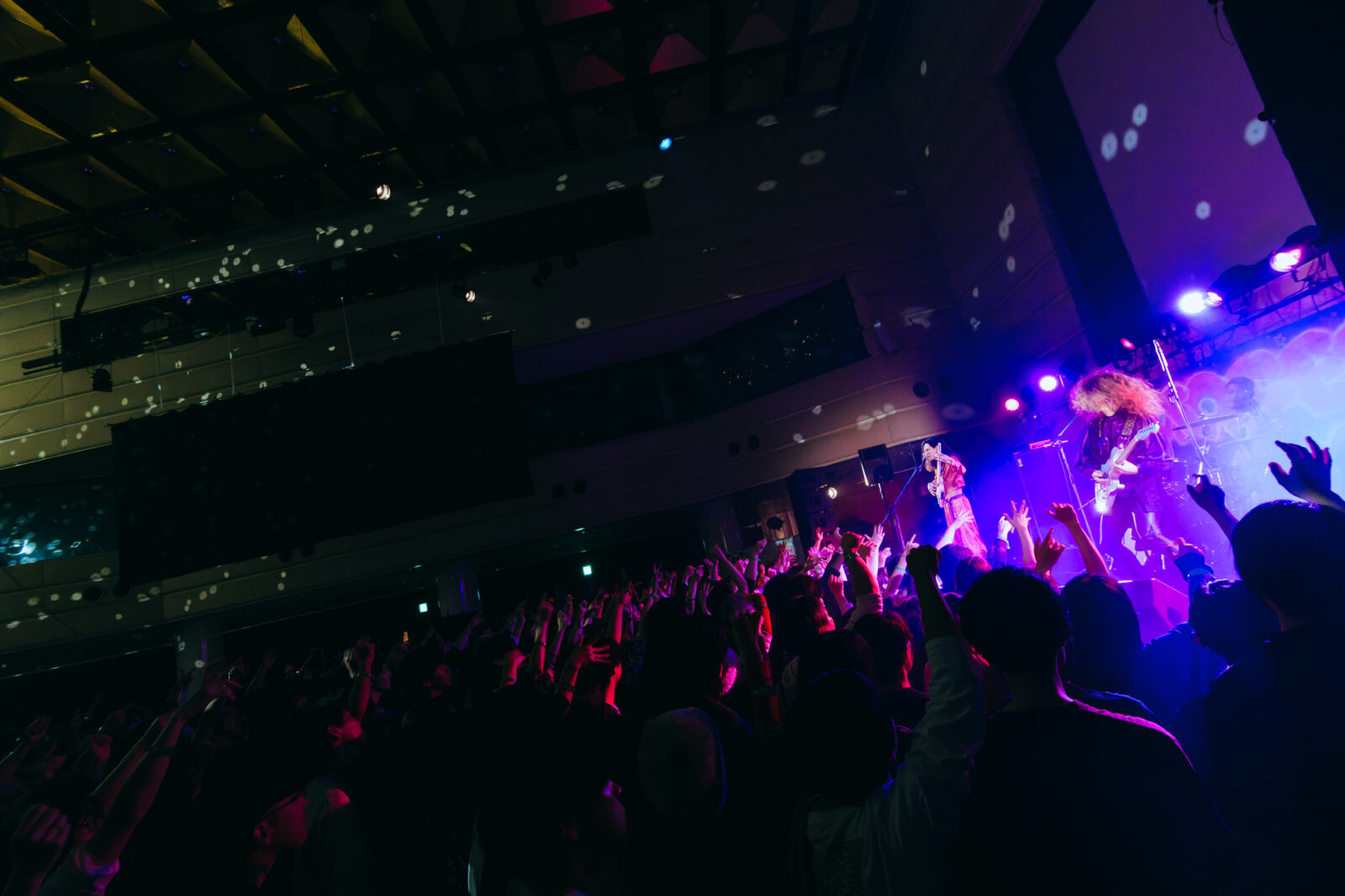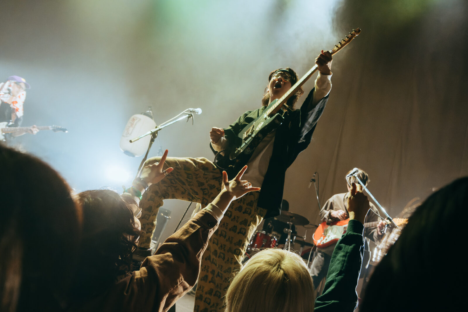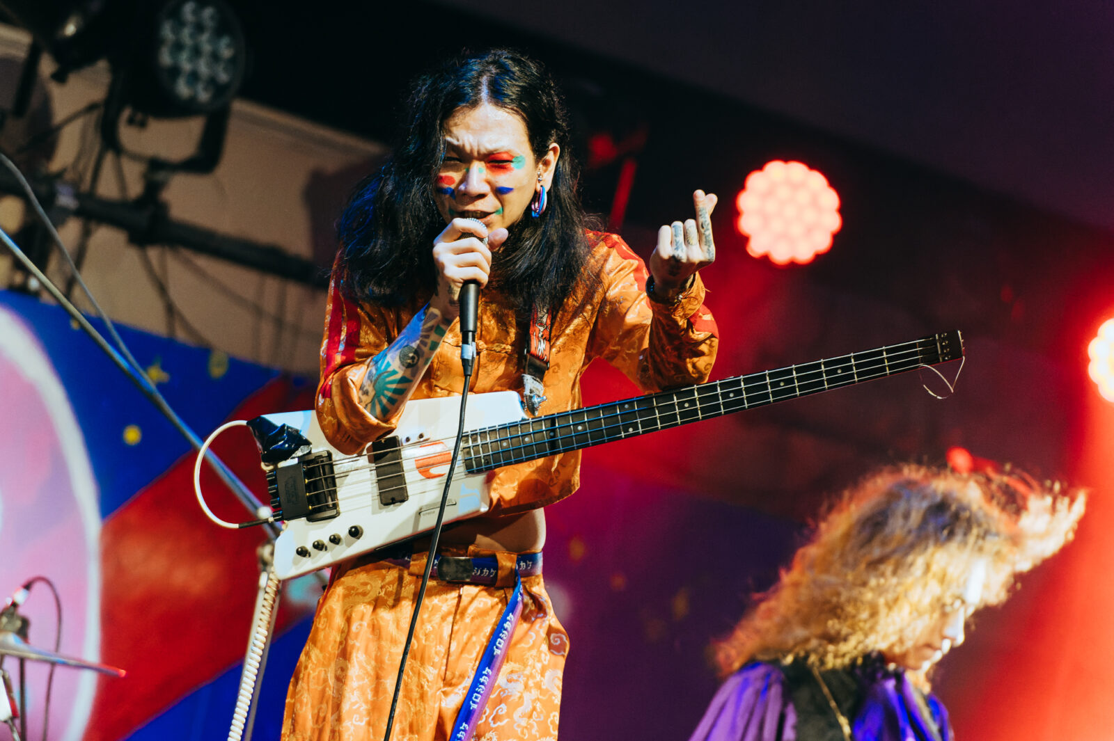 マーガレット廣井(Baと歌と主犯格)の「祭りじゃ!」の叫びとともに1曲目の“沙羅”が始まると、再び大歓声が。Kenzoooooo(Drと極道と含み笑い)の力強いドラミングに乗って、多くの観客が思い切り頭を振り始める。
