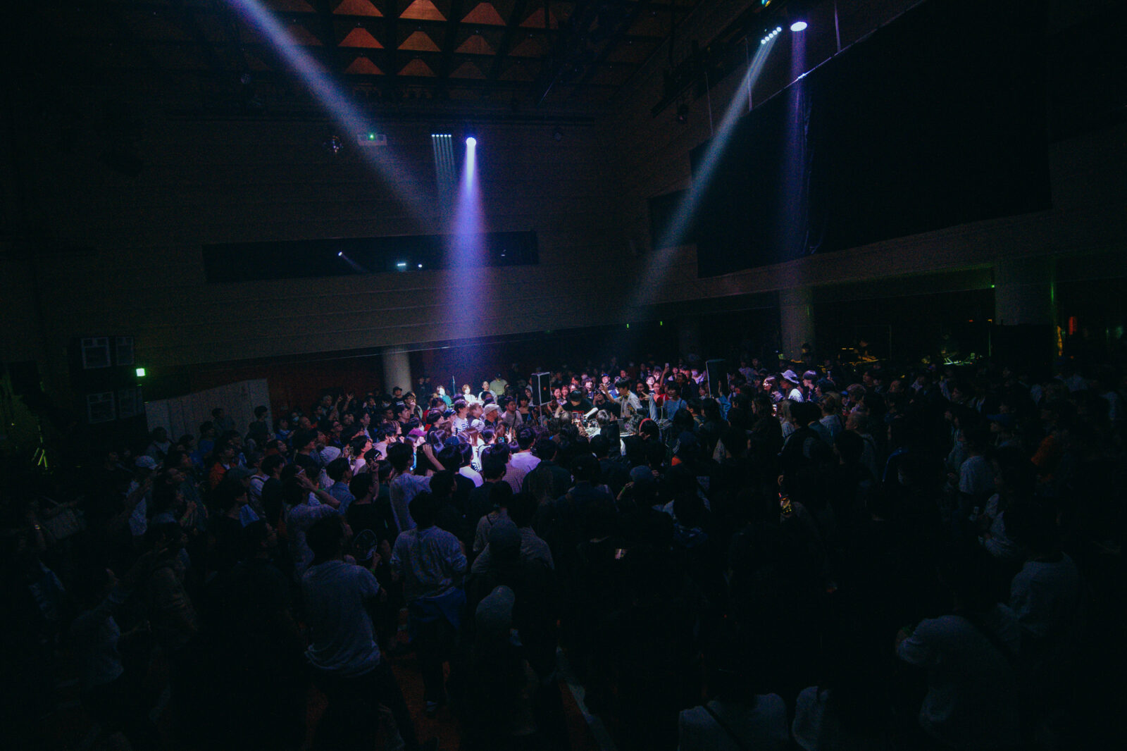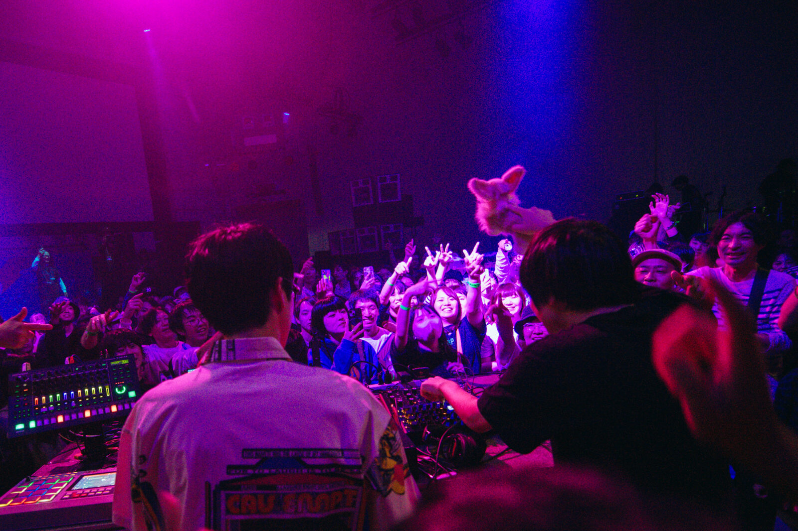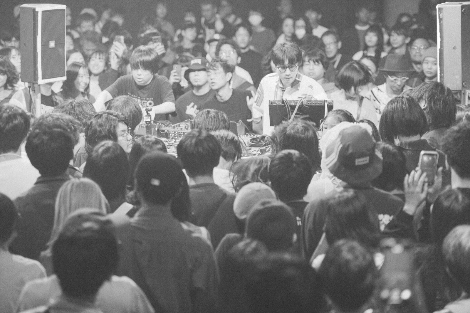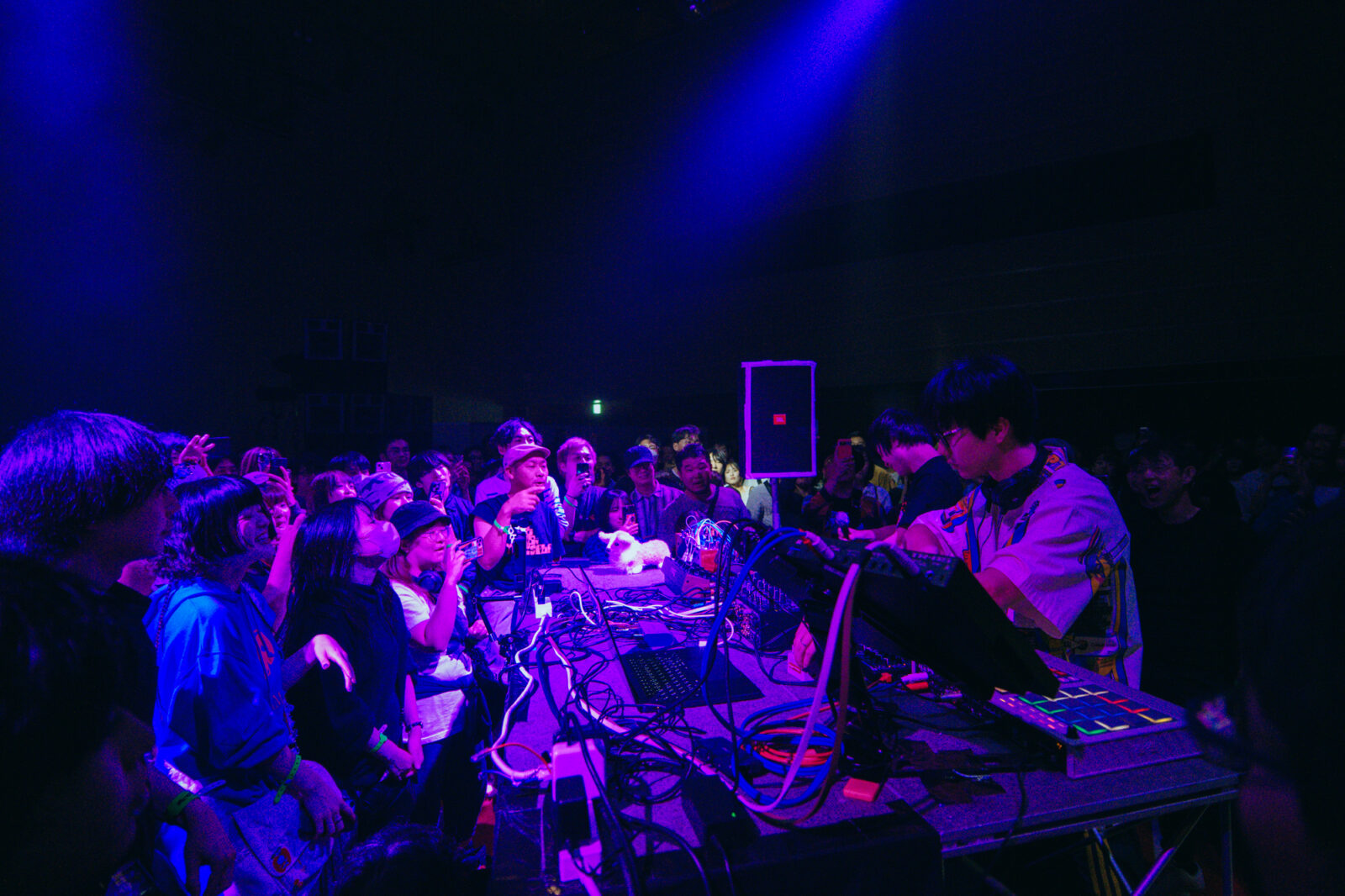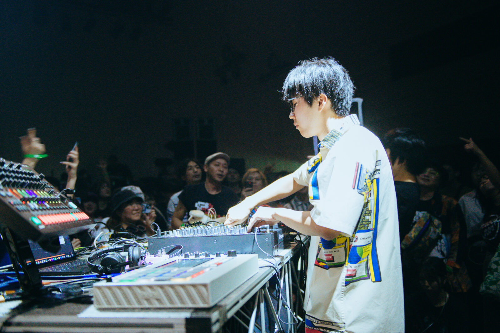 『ボロフェスタ2025』での新たな試みとして行われたのは、〈KYOTO METRO〉のダンスフロアを2日目の〈KBSホール〉に持ってくる企み『Boro the Party』。フロアの中心にはDJブースが設置され、その周りを360度観客が囲むというレイアウトだ。その出演者に選ばれた1組に、DTMユニット、パソコン音楽クラブがいる。暗転し、暗闇を駆け抜ける地下鉄のような、はたまた真夜中の高速道路のような音が鳴り始めた。そして、小さく跳ねるような電子音とともに“Acid”へ。紫色の照明の中、観客たちは踊り狂う。歓声を上げたり、自らもパフォーマンスをするようにリズムに乗ったり、楽しみ方は三者三様。年齢も立場も関係ない。その場に流れる音を全身で受け止め、思い思いに体を反応させる。クラブという空間が初めてだった筆者は、バンドやシンガーソングライターなどが出演するライブとはまた違う「音楽における本能的自由」が最大限に許された空間に魅了された。ふと目に入った〈BIG LEFT STAGE〉の上では、『ボロフェスタ』主催の飯田仁一郎と土龍が満足げな笑顔で楽しそうに体を揺らしている。プロレスやライブが盛んに行われてきた〈KBSホール〉で、こんなに大きなクラブ空間が出来上がったことは未だかつてあったのだろうか。このような小革命が起こせてしまうのも、『ボロフェスタ』ならではの魅力だろう。