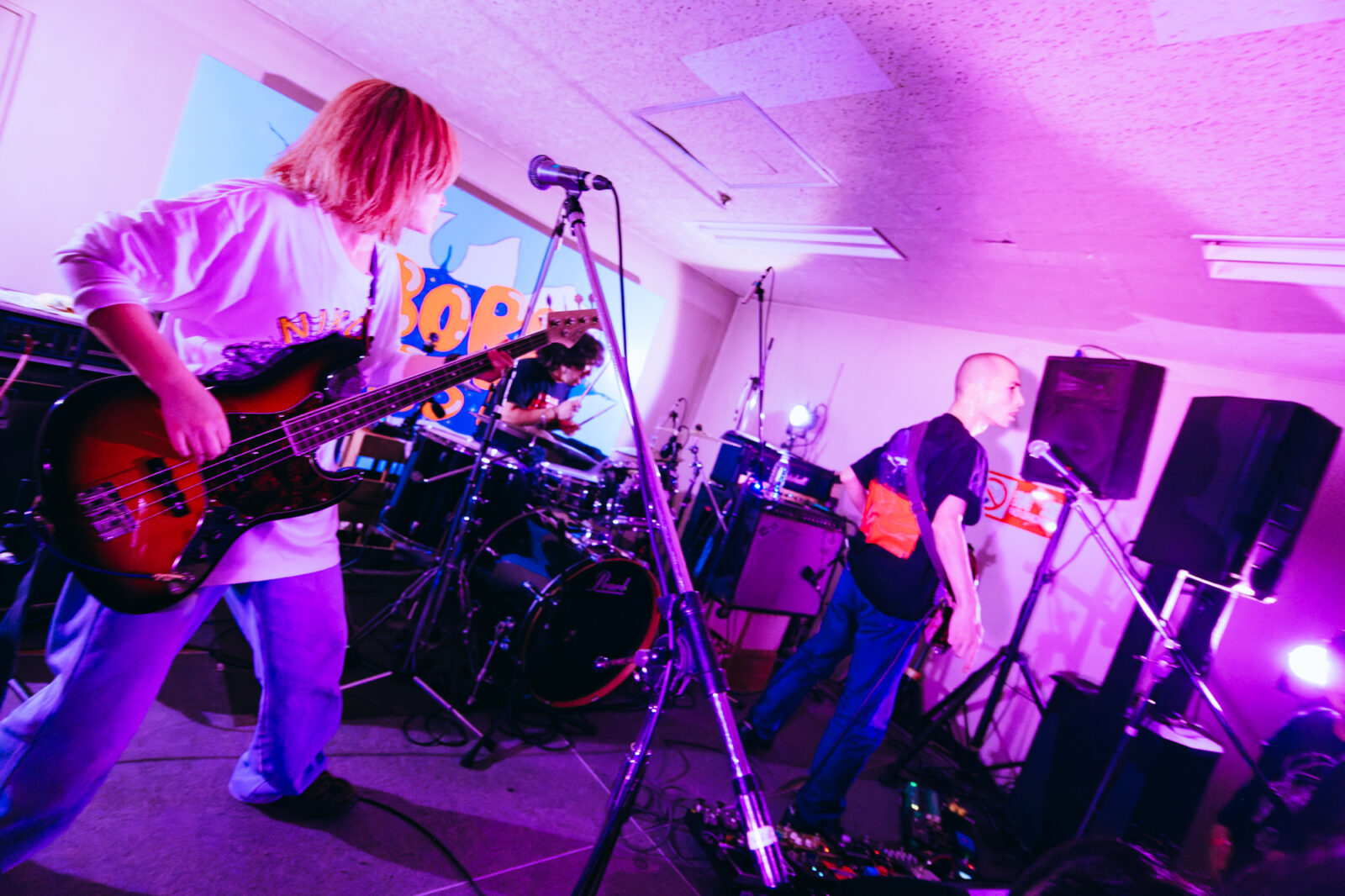 『ボロフェスタ2025』2日目〈街の底STAGE〉のトリを飾ったのは、ロックバンド、Nikoん。「トップギアでやります」と言い放ち、オオスカ(Gt / Vo)は赤いテレキャスターで轟音を掻き鳴らし始めた。1曲目の“とぅーばっど”でボーカルを務めるのは「ぺやんぐ」ことマナミオーガキ(Ba / Vo)。重低音に負けないどころか食らいついていくような、パワフルなボーカルに圧倒された。フロアは超満員。まるで音楽に取り憑かれたかのように激しく演奏するオオスカの表情を見ていると、観客であるこちらまで気持ちが燃え滾る。初っ端の時点で「これはもはやトップギアを遥かに超え、エンジンがぶっ壊れかけて狂い始めている」と感じてしまうほどの熱狂的な景色。Nikoんというバンドが固定観念に囚われないことを知っているからこそ感じる、これから何が起こるのか分からないスリル。この最強の音楽空間に囲まれて、踊り出さない方が難しかった。