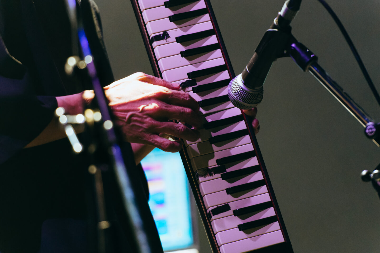 そんな乙女絵画のライブは、しっとり幻想的な楽曲“誰にもさわれない”から始まった。佐藤のシンセサイザーと佐々木優人(Gt / Vo)の低い歌声が醸し出す夢の中のような雰囲気に一気に飲み込まれた。その空気感から打って変わって、佐藤舜紀のダンサブルなベースラインが印象的な“100”へと続く。ストラトキャスターのアームを多用し独特なニュアンスを出したギターサウンドも味わい深い。