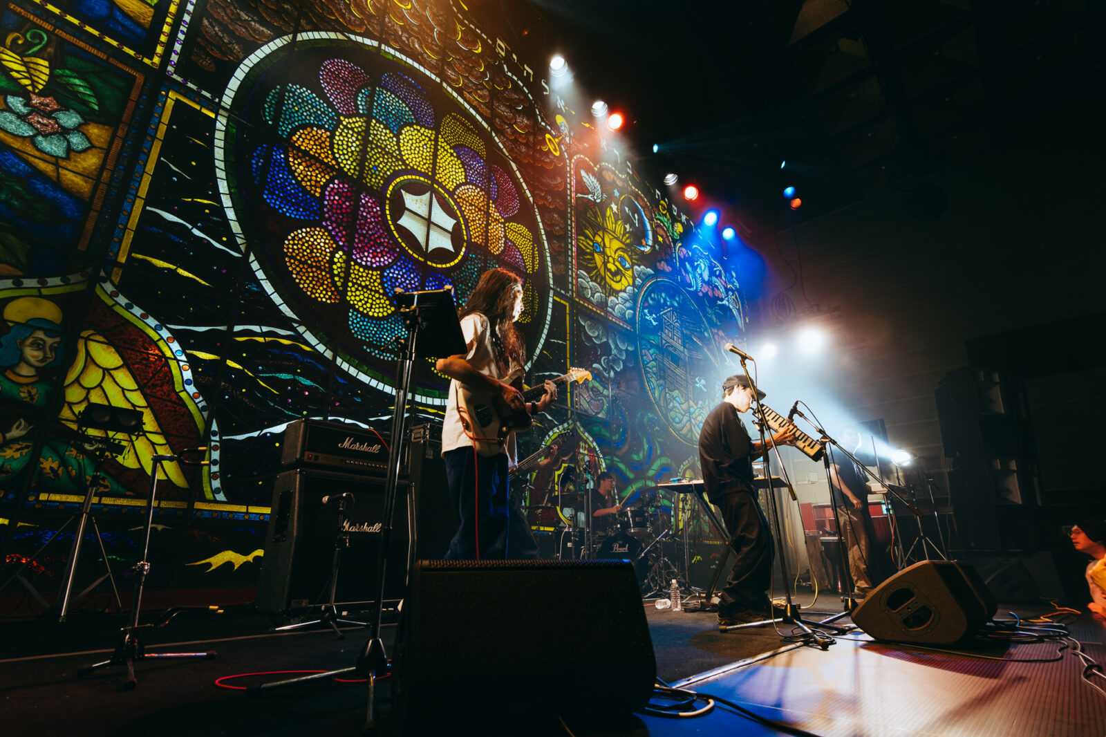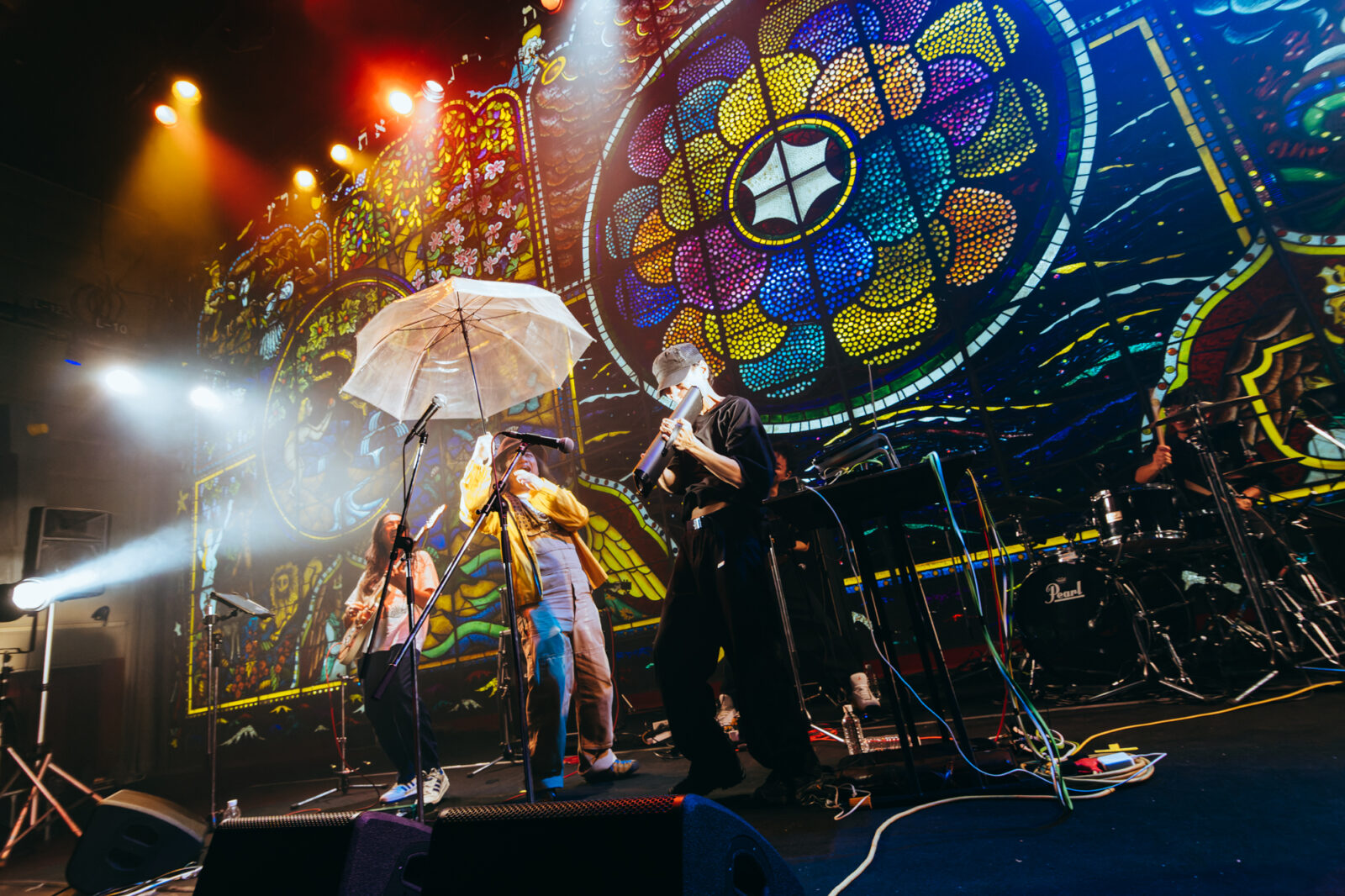 アンコールには、“Back”で応えたあら恋。カーテンが開いて、ステンドグラスの彩光が差し込む。すると突如、ボギーが透明傘を持ってくるくると回しながらステージに乱入してきた。池永や藤井友信らメンバーの顔には、嬉しそうな笑顔が浮かぶ。後日Xに投稿されたボギーのポストによると、20数年前に池永が〈難波ベアーズ〉で働いていたころ、ボギーのバンド、ノントロッポのライブに透明傘を持って入ってきて以来、あら恋とボギーが共演する日はどちらかが同様に乱入する暗黙の流れがあるとのこと。思わぬボギーのスリーステージと、あら恋との長年の絆が垣間見えたひとときに、ホール内は温かい空気に包まれた。