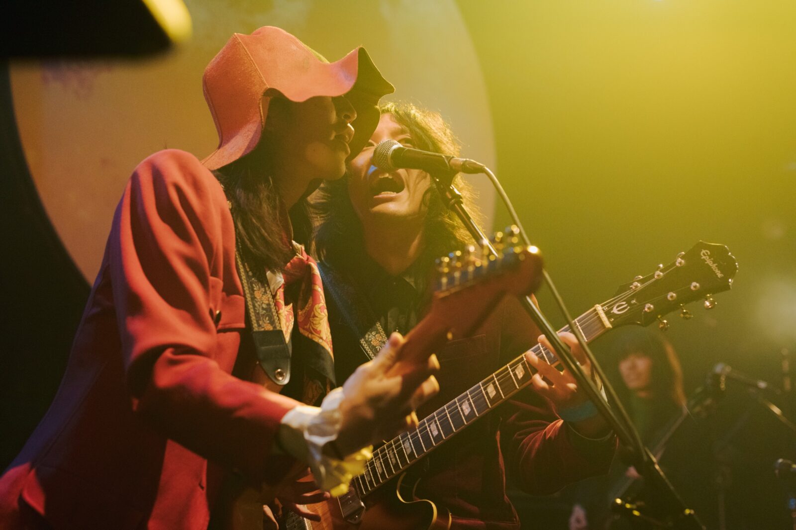 そんな中、登場したのはゆうやけしはす&すうらばあずの方だった。主催者はトリに出ると思っていたので意外に感じたが、注目度の高い古山に後を任せ、自分たちも確実に観てもらおうという意図がうかがえる。厳かなハモンドオルガンの音色を弾き始め、歌い始めたのは“朝バナナ”。キャッチーなメロディに、The Velvet Undergroundへの憧れを込めた歌詞とサウンド、倦怠感を湛えながら吐き捨てるような林の歌が響き渡る。間髪入れず“春だな(ハレクリシュナ)”、“太陽の巫女”と、まるで60分の持ち時間で出来る限りの曲数を詰め込んでやろうという気概だ。また唯一のインストゥルメンタル曲“アジアの壁”の背後にはKhruangbinが透けて聴きとれるし、“湘南ブギ”にはサザンオールスターズのデビュー当時を思わせる地元愛とウエスト・コースト感が滲んでいる。幅広いリファレンスを換骨奪胎していくオマージュセンスこそが最大の魅力だ。またすうらばあずの牧野陽輝(Gt / Cho)、弓場俊太郎(Ba / Cho)、佐々木檀(Dr)による演奏と所作も、見事に林と呼応したワイルドで耽美的なものだ。
