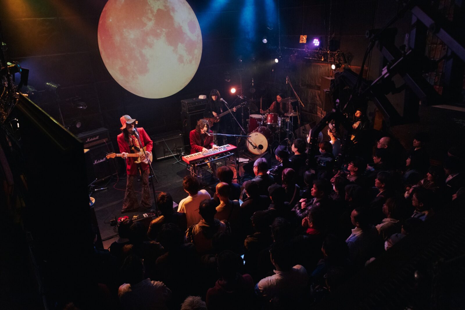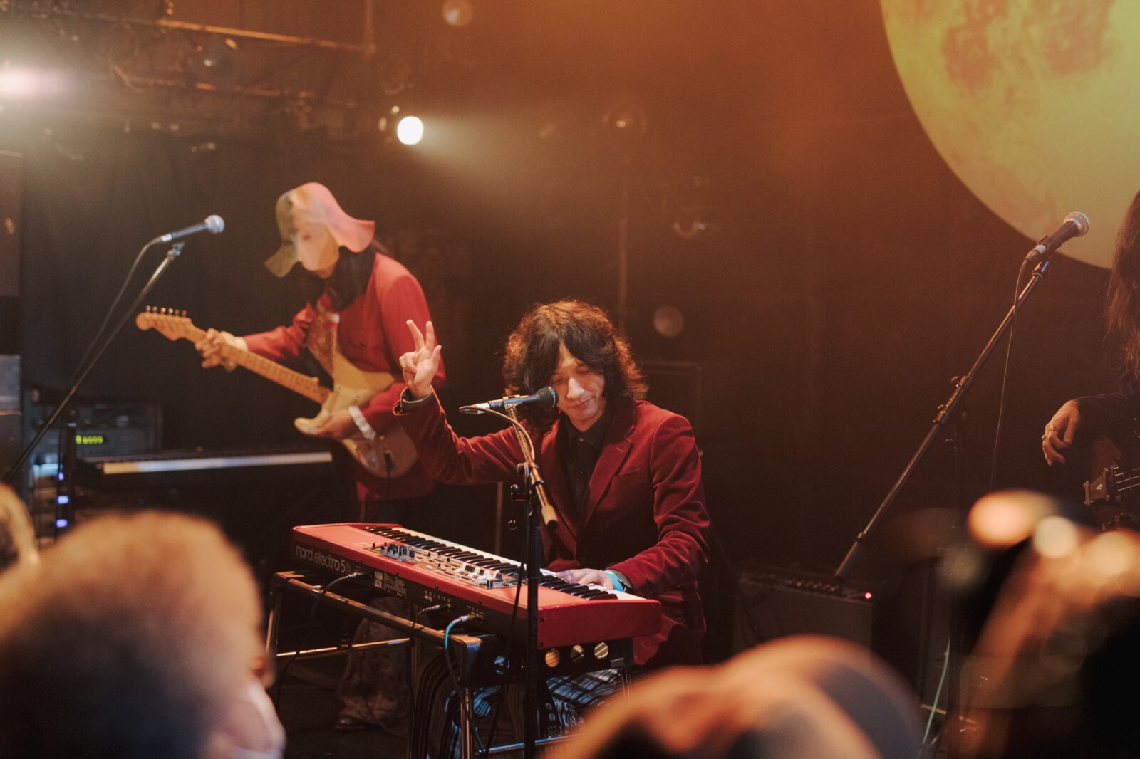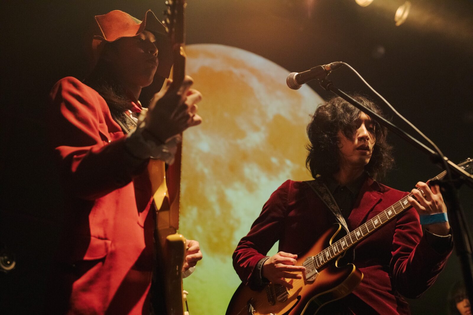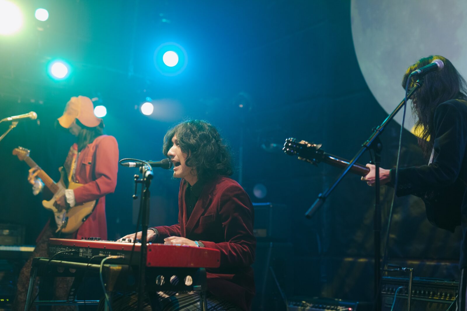 そんな中、登場したのはゆうやけしはす&すうらばあずの方だった。主催者はトリに出ると思っていたので意外に感じたが、注目度の高い古山に後を任せ、自分たちも確実に観てもらおうという意図がうかがえる。厳かなハモンドオルガンの音色を弾き始め、歌い始めたのは“朝バナナ”。キャッチーなメロディに、The Velvet Undergroundへの憧れを込めた歌詞とサウンド、倦怠感を湛えながら吐き捨てるような林の歌が響き渡る。間髪入れず“春だな(ハレクリシュナ)”、“太陽の巫女”と、まるで60分の持ち時間で出来る限りの曲数を詰め込んでやろうという気概だ。また唯一のインストゥルメンタル曲“アジアの壁”の背後にはKhruangbinが透けて聴きとれるし、“湘南ブギ”にはサザンオールスターズのデビュー当時を思わせる地元愛とウエスト・コースト感が滲んでいる。幅広いリファレンスを換骨奪胎していくオマージュセンスこそが最大の魅力だ。またすうらばあずの牧野陽輝(Gt / Cho)、弓場俊太郎(Ba / Cho)、佐々木檀(Dr)による演奏と所作も、見事に林と呼応したワイルドで耽美的なものだ。