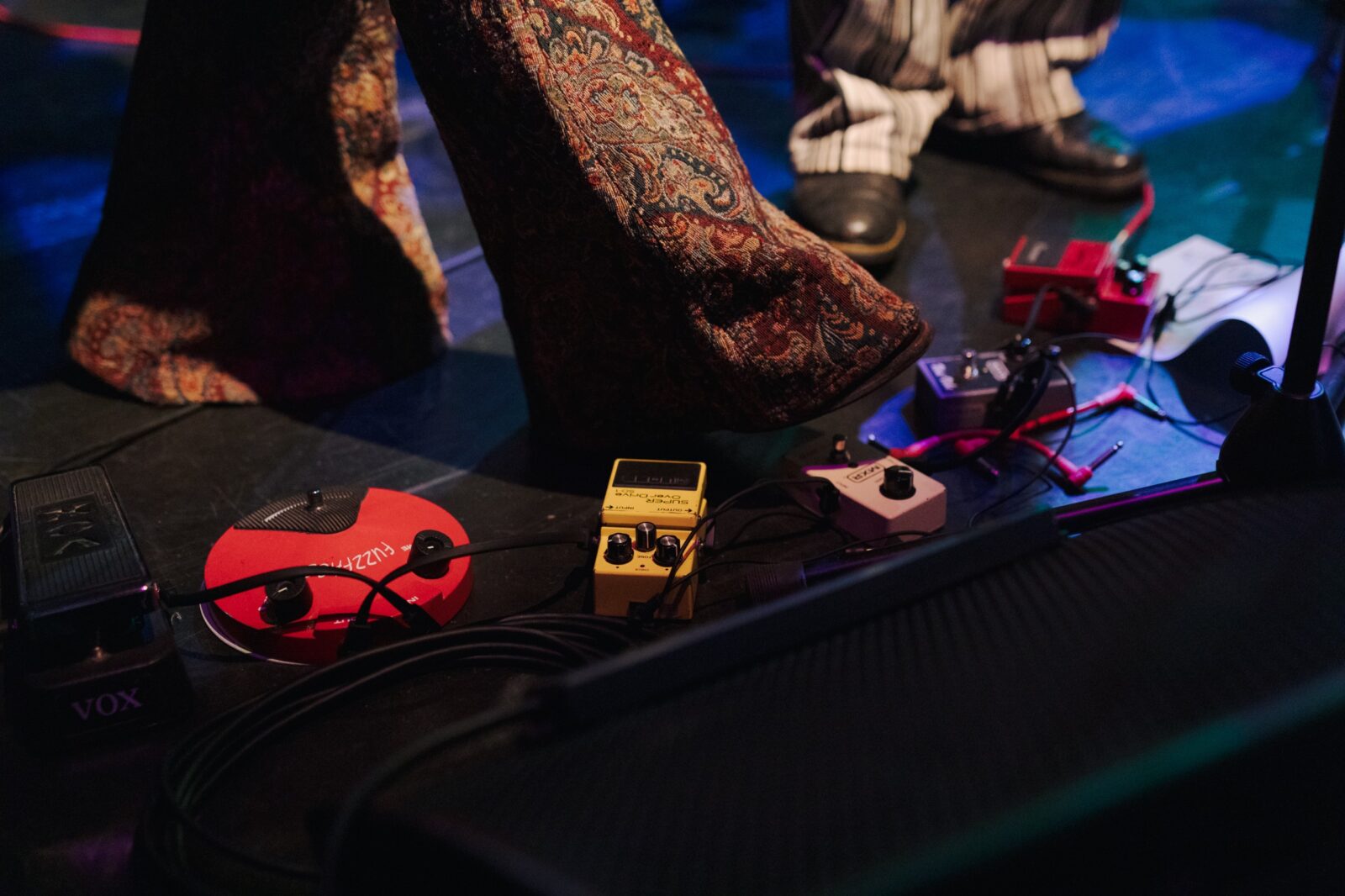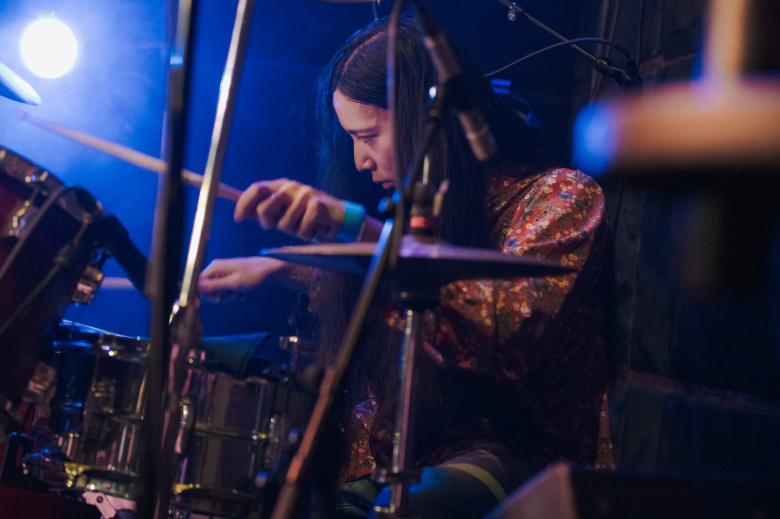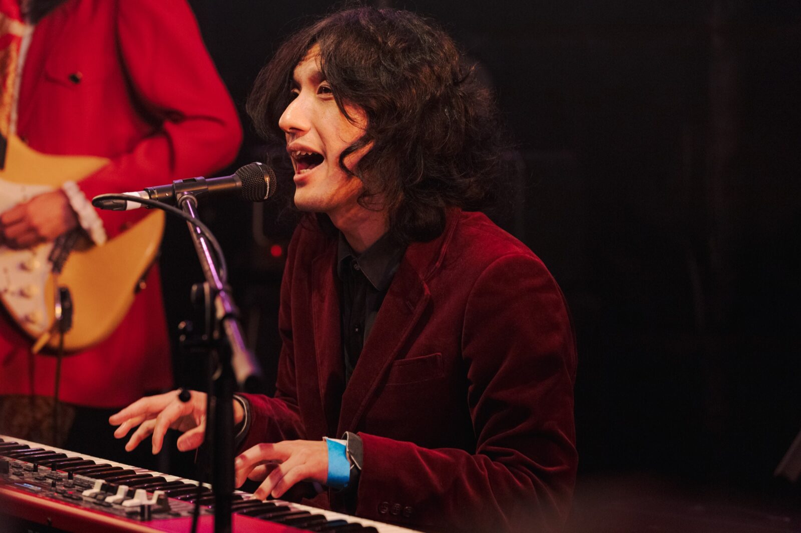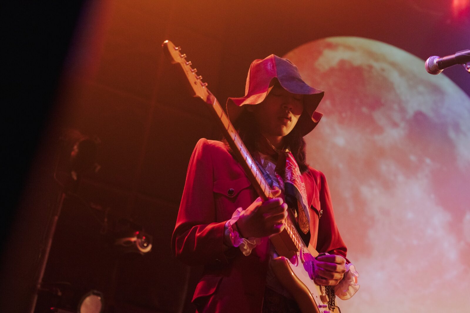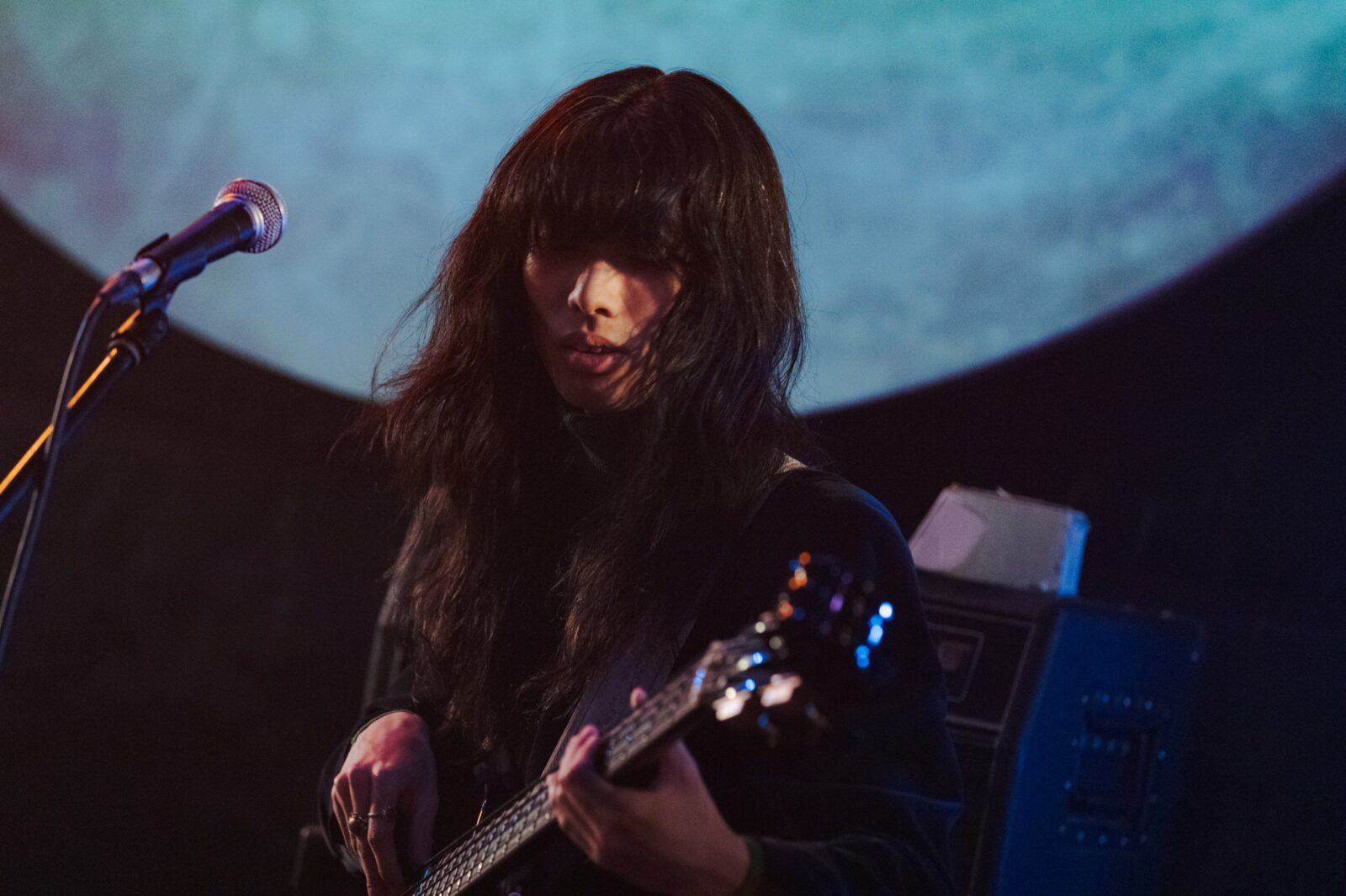そんな中、登場したのはゆうやけしはす&すうらばあずの方だった。主催者はトリに出ると思っていたので意外に感じたが、注目度の高い古山に後を任せ、自分たちも確実に観てもらおうという意図がうかがえる。厳かなハモンドオルガンの音色を弾き始め、歌い始めたのは“朝バナナ”。キャッチーなメロディに、The Velvet Undergroundへの憧れを込めた歌詞とサウンド、倦怠感を湛えながら吐き捨てるような林の歌が響き渡る。間髪入れず“春だな(ハレクリシュナ)”、“太陽の巫女”と、まるで60分の持ち時間で出来る限りの曲数を詰め込んでやろうという気概だ。また唯一のインストゥルメンタル曲“アジアの壁”の背後にはKhruangbinが透けて聴きとれるし、“湘南ブギ”にはサザンオールスターズのデビュー当時を思わせる地元愛とウエスト・コースト感が滲んでいる。幅広いリファレンスを換骨奪胎していくオマージュセンスこそが最大の魅力だ。またすうらばあずの牧野陽輝(Gt / Cho)、弓場俊太郎(Ba / Cho)、佐々木檀(Dr)による演奏と所作も、見事に林と呼応したワイルドで耽美的なものだ。