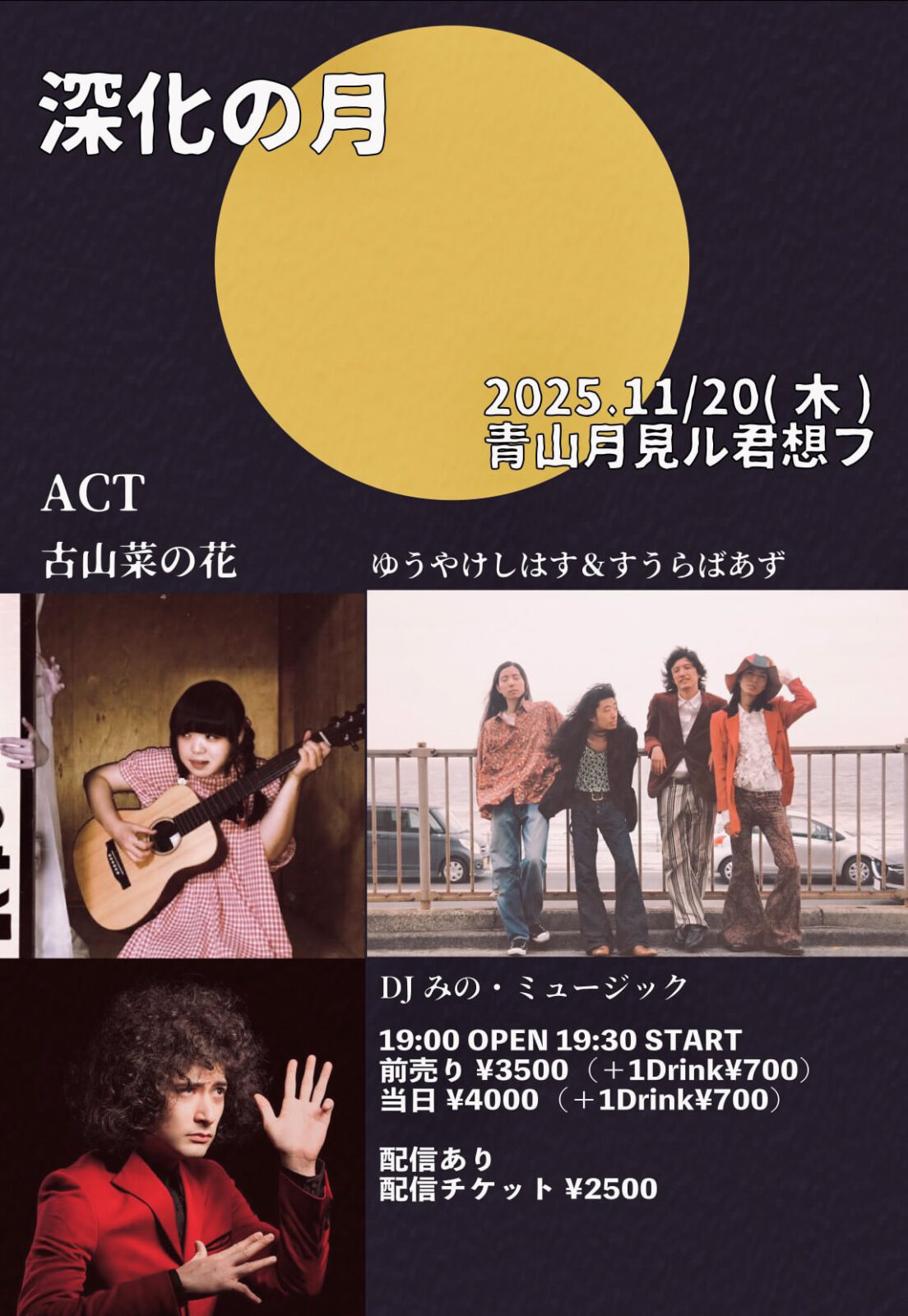 2025年11月20日に開催された林が企画したライブイベント『深化の月』は、ゆうやけしはす&すうらばあずに加えて古山菜の花が出演、みのミュージック・みのがDJを務めた。この布陣を思いついた時の彼のニヤリとした顔が浮かぶ。みのは2022年にYouTubeチャンネル『みのミュージック』でゆうやけしはすを取り上げて以降、『ロックンロール教団』の映像作品にも主演するなど、林に手を差し伸べてきた。また今年、みのが主催する音楽オーディション番組『音楽深化論 〜the battle〜』の第1回目にもすうらばあずを連れ立って出演。グランプリは惜しくも逃したのだが、審査員からも好評を得ていた。そこに続いて第2回のソロシンガー版でグランプリを果たしたのが、古山菜の花だった。「令和のたま!?天才少女現る」との見出しで“もののけはいないよ”を披露した動画は210万回再生(2025年12月現在)を突破。一躍話題を呼んだことを受けて、『音楽深化論』のつながりをイベントにしてやろうという企てである。チケットは早々にソールドアウト。林の狙いは見事に的中した。