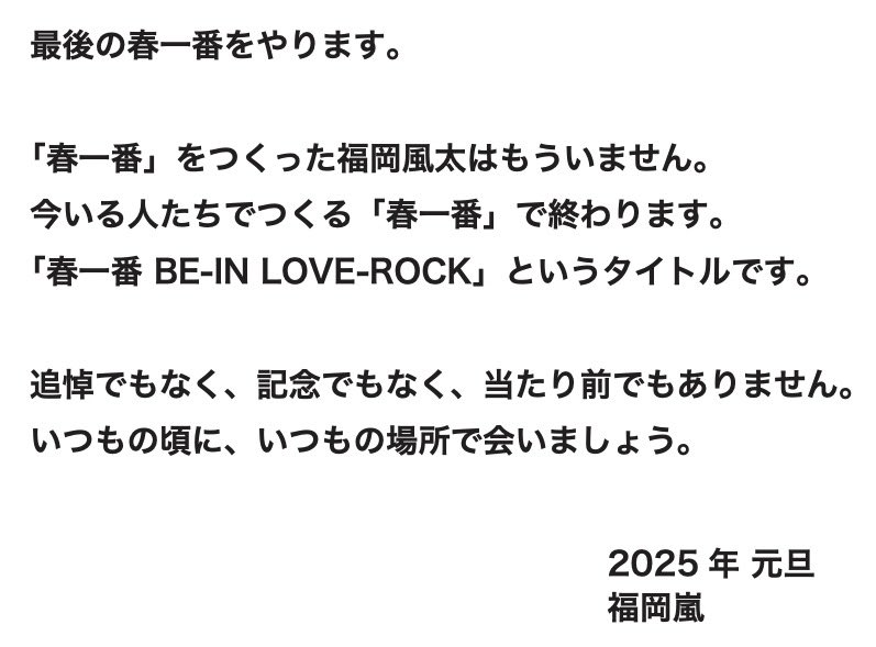 昨年の開催を終えた6月10日、『春一番』の顔であるプロデューサー・主催者の福岡風太が76歳で死去。それを受けて今年は、風太が第1回『春一番』前年の1970年に開催した野外コンサート『BE-IN LOVE-ROCK』を副題につけ、最後の開催となることが発表されました。