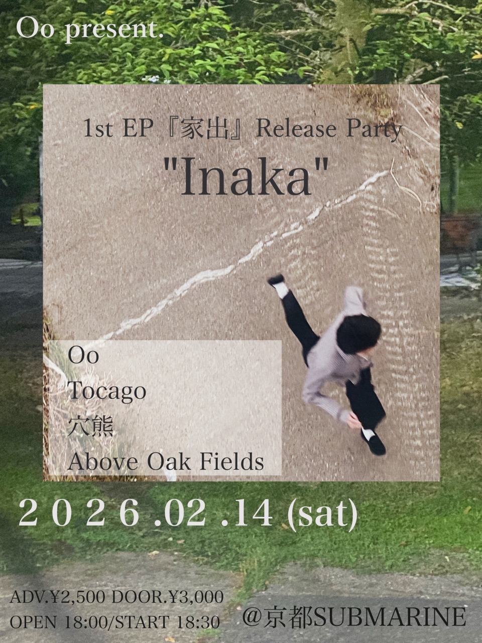 またリリースを記念した自主企画ライブイベント『Inaka』が、2026年2月14日(土)に〈京都SUBMARINE〉で開催決定。ゲストにはTocago、穴熊、Above Oak Fieldsという、それぞれ東京、神戸、京都と拠点が異なるバラエティに富んだラインナップで開催される。