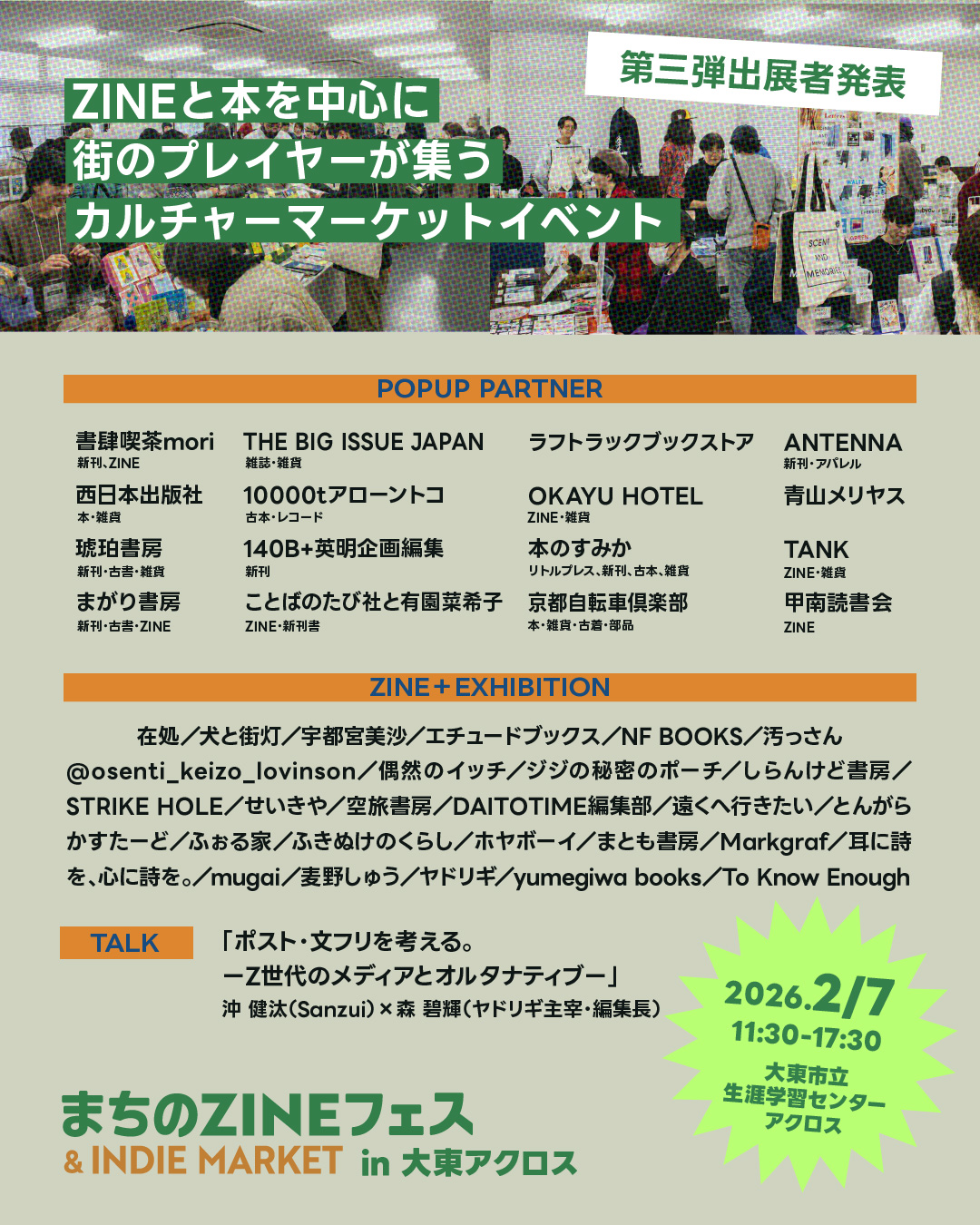 2026年2月7日(土)、大阪府大東市にある〈大東市立生涯学習センターアクロス〉にて、『まちのZINEフェス & インディーマーケット in 大東アクロス』が開催される。