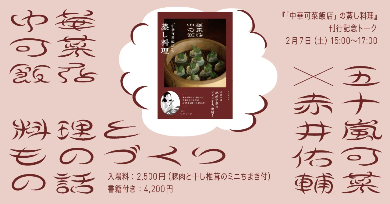 東京・永福町の中華料理店〈中華可菜飯店〉店主・五十嵐可菜の著書『「中華可菜飯店」の蒸し料理』(グラフィック社)の刊行を記念し、トークイベントが2026年2月7日(土)に京都・〈恵文社一乗寺店〉で開催される。